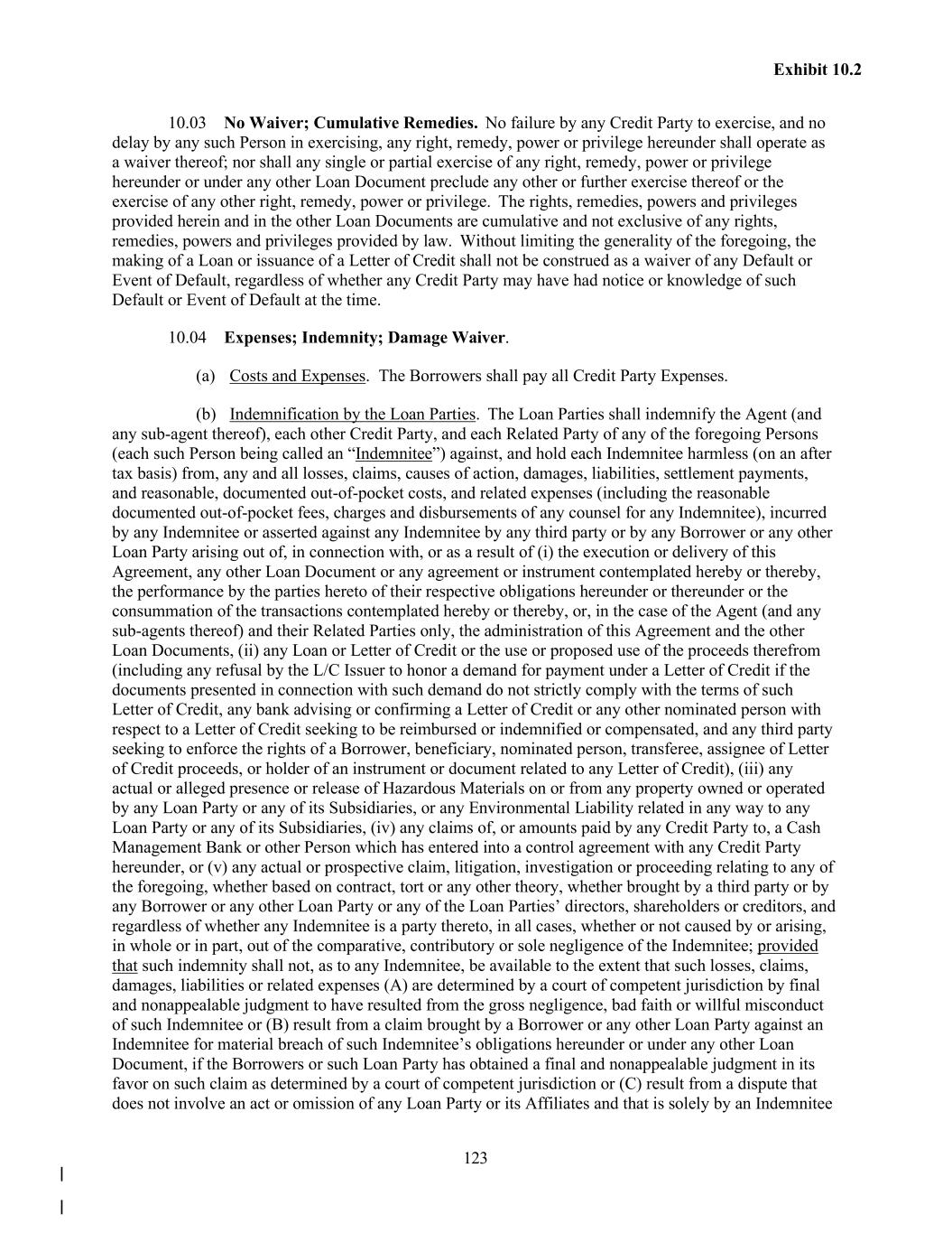 123 Exhibit 10.2 10.03 No Waiver; Cumulative Remedies. No failure by any Credit Party to exercise, and no delay by any such Person in exercising, any right, remedy, power or privilege hereunder shall operate as a waiver thereof; nor shall any single or partial exercise of any right, remedy, power or privilege hereunder or under any other Loan Document preclude any other or further exercise thereof or the exercise of any other right, remedy, power or privilege. The rights, remedies, powers and privileges provided herein and in the other Loan Documents are cumulative and not exclusive of any rights, remedies, powers and privileges provided by law. Without limiting the generality of the foregoing, the making of a Loan or issuance of a Letter of Credit shall not be construed as a waiver of any Default or Event of Default, regardless of whether any Credit Party may have had notice or knowledge of such Default or Event of Default at the time. 10.04 Expenses; Indemnity; Damage Waiver. (a) Costs and Expenses. The Borrowers shall pay all Credit Party Expenses. (b) Indemnification by the Loan Parties. The Loan Parties shall indemnify the Agent (and any sub-agent thereof), each other Credit Party, and each Related Party of any of the foregoing Persons (each such Person being called an “Indemnitee”) against, and hold each Indemnitee harmless (on an after tax basis) from, any and all losses, claims, causes of action, damages, liabilities, settlement payments, and reasonable, documented out-of-pocket costs, and related expenses (including the reasonable documented out-of-pocket fees, charges and disbursements of any counsel for any Indemnitee), incurred by any Indemnitee or asserted against any Indemnitee by any third party or by any Borrower or any other Loan Party arising out of, in connection with, or as a result of (i) the execution or delivery of this Agreement, any other Loan Document or any agreement or instrument contemplated hereby or thereby, the performance by the parties hereto of their respective obligations hereunder or thereunder or the consummation of the transactions contemplated hereby or thereby, or, in the case of the Agent (and any sub-agents thereof) and their Related Parties only, the administration of this Agreement and the other Loan Documents, (ii) any Loan or Letter of Credit or the use or proposed use of the proceeds therefrom (including any refusal by the L/C Issuer to honor a demand for payment under a Letter of Credit if the documents presented in connection with such demand do not strictly comply with the terms of such Letter of Credit, any bank advising or confirming a Letter of Credit or any other nominated person with respect to a Letter of Credit seeking to be reimbursed or indemnified or compensated, and any third party seeking to enforce the rights of a Borrower, beneficiary, nominated person, transferee, assignee of Letter of Credit proceeds, or holder of an instrument or document related to any Letter of Credit), (iii) any actual or alleged presence or release of Hazardous Materials on or from any property owned or operated by any Loan Party or any of its Subsidiaries, or any Environmental Liability related in any way to any Loan Party or any of its Subsidiaries, (iv) any claims of, or amounts paid by any Credit Party to, a Cash Management Bank or other Person which has entered into a control agreement with any Credit Party hereunder, or (v) any actual or prospective claim, litigation, investigation or proceeding relating to any of the foregoing, whether based on contract, tort or any other theory, whether brought by a third party or by any Borrower or any other Loan Party or any of the Loan Parties’ directors, shareholders or creditors, and regardless of whether any Indemnitee is a party thereto, in all cases, whether or not caused by or arising, in whole or in part, out of the comparative, contributory or sole negligence of the Indemnitee; provided that such indemnity shall not, as to any Indemnitee, be available to the extent that such losses, claims, damages, liabilities or related expenses (A) are determined by a court of competent jurisdiction by final and nonappealable judgment to have resulted from the gross negligence, bad faith or willful misconduct of such Indemnitee or (B) result from a claim brought by a Borrower or any other Loan Party against an Indemnitee for material breach of such Indemnitee’s obligations hereunder or under any other Loan Document, if the Borrowers or such Loan Party has obtained a final and nonappealable judgment in its favor on such claim as determined by a court of competent jurisdiction or (C) result from a dispute that does not involve an act or omission of any Loan Party or its Affiliates and that is solely by an Indemnitee