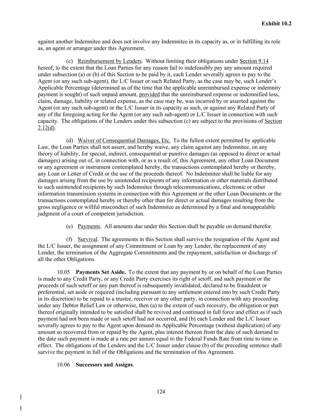 124 Exhibit 10.2 against another Indemnitee and does not involve any Indemnitee in its capacity as, or in fulfilling its role as, an agent or arranger under this Agreement. (c) Reimbursement by Lenders. Without limiting their obligations under Section 9.14 hereof, to the extent that the Loan Parties for any reason fail to indefeasibly pay any amount required under subsection (a) or (b) of this Section to be paid by it, each Lender severally agrees to pay to the Agent (or any such sub-agent), the L/C Issuer or such Related Party, as the case may be, such Lender’s Applicable Percentage (determined as of the time that the applicable unreimbursed expense or indemnity payment is sought) of such unpaid amount, provided that the unreimbursed expense or indemnified loss, claim, damage, liability or related expense, as the case may be, was incurred by or asserted against the Agent (or any such sub-agent) or the L/C Issuer in its capacity as such, or against any Related Party of any of the foregoing acting for the Agent (or any such sub-agent) or L/C Issuer in connection with such capacity. The obligations of the Lenders under this subsection (c) are subject to the provisions of Section 2.12(d). (d) Waiver of Consequential Damages, Etc. To the fullest extent permitted by applicable Law, the Loan Parties shall not assert, and hereby waive, any claim against any Indemnitee, on any theory of liability, for special, indirect, consequential or punitive damages (as opposed to direct or actual damages) arising out of, in connection with, or as a result of, this Agreement, any other Loan Document or any agreement or instrument contemplated hereby, the transactions contemplated hereby or thereby, any Loan or Letter of Credit or the use of the proceeds thereof. No Indemnitee shall be liable for any damages arising from the use by unintended recipients of any information or other materials distributed to such unintended recipients by such Indemnitee through telecommunications, electronic or other information transmission systems in connection with this Agreement or the other Loan Documents or the transactions contemplated hereby or thereby other than for direct or actual damages resulting from the gross negligence or willful misconduct of such Indemnitee as determined by a final and nonappealable judgment of a court of competent jurisdiction. (e) Payments. All amounts due under this Section shall be payable on demand therefor. (f) Survival. The agreements in this Section shall survive the resignation of the Agent and the L/C Issuer, the assignment of any Commitment or Loan by any Lender, the replacement of any Lender, the termination of the Aggregate Commitments and the repayment, satisfaction or discharge of all the other Obligations. 10.05 Payments Set Aside. To the extent that any payment by or on behalf of the Loan Parties is made to any Credit Party, or any Credit Party exercises its right of setoff, and such payment or the proceeds of such setoff or any part thereof is subsequently invalidated, declared to be fraudulent or preferential, set aside or required (including pursuant to any settlement entered into by such Credit Party in its discretion) to be repaid to a trustee, receiver or any other party, in connection with any proceeding under any Debtor Relief Law or otherwise, then (a) to the extent of such recovery, the obligation or part thereof originally intended to be satisfied shall be revived and continued in full force and effect as if such payment had not been made or such setoff had not occurred, and (b) each Lender and the L/C Issuer severally agrees to pay to the Agent upon demand its Applicable Percentage (without duplication) of any amount so recovered from or repaid by the Agent, plus interest thereon from the date of such demand to the date such payment is made at a rate per annum equal to the Federal Funds Rate from time to time in effect. The obligations of the Lenders and the L/C Issuer under clause (b) of the preceding sentence shall survive the payment in full of the Obligations and the termination of this Agreement. 10.06 Successors and Assigns.