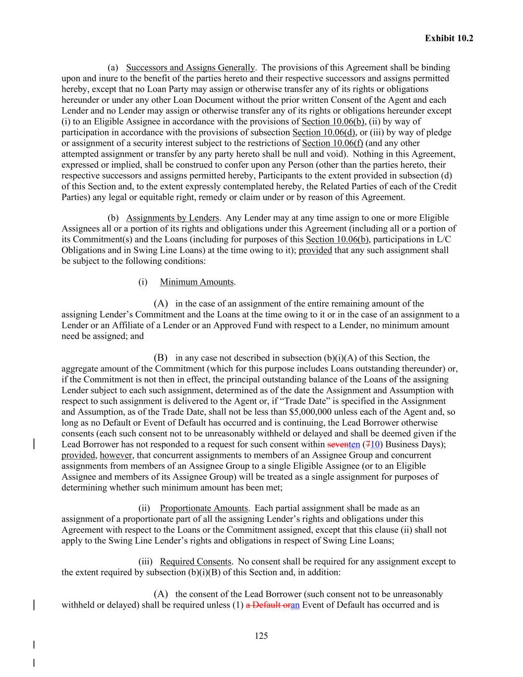 125 Exhibit 10.2 (a) Successors and Assigns Generally. The provisions of this Agreement shall be binding upon and inure to the benefit of the parties hereto and their respective successors and assigns permitted hereby, except that no Loan Party may assign or otherwise transfer any of its rights or obligations hereunder or under any other Loan Document without the prior written Consent of the Agent and each Lender and no Lender may assign or otherwise transfer any of its rights or obligations hereunder except (i) to an Eligible Assignee in accordance with the provisions of Section 10.06(b), (ii) by way of participation in accordance with the provisions of subsection Section 10.06(d), or (iii) by way of pledge or assignment of a security interest subject to the restrictions of Section 10.06(f) (and any other attempted assignment or transfer by any party hereto shall be null and void). Nothing in this Agreement, expressed or implied, shall be construed to confer upon any Person (other than the parties hereto, their respective successors and assigns permitted hereby, Participants to the extent provided in subsection (d) of this Section and, to the extent expressly contemplated hereby, the Related Parties of each of the Credit Parties) any legal or equitable right, remedy or claim under or by reason of this Agreement. (b) Assignments by Lenders. Any Lender may at any time assign to one or more Eligible Assignees all or a portion of its rights and obligations under this Agreement (including all or a portion of its Commitment(s) and the Loans (including for purposes of this Section 10.06(b), participations in L/C Obligations and in Swing Line Loans) at the time owing to it); provided that any such assignment shall be subject to the following conditions: (i) Minimum Amounts. (A) in the case of an assignment of the entire remaining amount of the assigning Lender’s Commitment and the Loans at the time owing to it or in the case of an assignment to a Lender or an Affiliate of a Lender or an Approved Fund with respect to a Lender, no minimum amount need be assigned; and (B) in any case not described in subsection (b)(i)(A) of this Section, the aggregate amount of the Commitment (which for this purpose includes Loans outstanding thereunder) or, if the Commitment is not then in effect, the principal outstanding balance of the Loans of the assigning Lender subject to each such assignment, determined as of the date the Assignment and Assumption with respect to such assignment is delivered to the Agent or, if “Trade Date” is specified in the Assignment and Assumption, as of the Trade Date, shall not be less than $5,000,000 unless each of the Agent and, so long as no Default or Event of Default has occurred and is continuing, the Lead Borrower otherwise consents (each such consent not to be unreasonably withheld or delayed and shall be deemed given if the Lead Borrower has not responded to a request for such consent within seventen (710) Business Days); provided, however, that concurrent assignments to members of an Assignee Group and concurrent assignments from members of an Assignee Group to a single Eligible Assignee (or to an Eligible Assignee and members of its Assignee Group) will be treated as a single assignment for purposes of determining whether such minimum amount has been met; (ii) Proportionate Amounts. Each partial assignment shall be made as an assignment of a proportionate part of all the assigning Lender’s rights and obligations under this Agreement with respect to the Loans or the Commitment assigned, except that this clause (ii) shall not apply to the Swing Line Lender’s rights and obligations in respect of Swing Line Loans; (iii) Required Consents. No consent shall be required for any assignment except to the extent required by subsection (b)(i)(B) of this Section and, in addition: (A) the consent of the Lead Borrower (such consent not to be unreasonably withheld or delayed) shall be required unless (1) a Default oran Event of Default has occurred and is