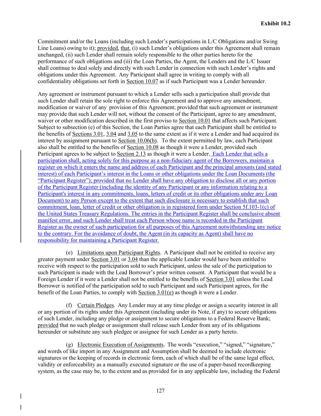 126 Exhibit 10.2 continuing at the time of such assignment or (2) such assignment is to a Lender, an Affiliate of a Lender or an Approved Fund; and (B) the consent of the Agent (such consent not to be unreasonably withheld or delayed) shall be required for assignments in respect of any Commitment if such assignment is to a Person that is not a Lender, an Affiliate of such Lender or an Approved Fund with respect to such Lender; and (C) the consent of the L/C Issuer (such consent not to be unreasonably withheld or delayed) shall be required for any assignment that increases the obligation of the assignee to participate in exposure under one or more Letters of Credit (whether or not then outstanding); and (D) the consent of the Swing Line Lender (such consent not to be unreasonably withheld or delayed) shall be required for any assignment in respect of the assignment of any Commitment. (iv) Assignment and Assumption. The parties to each assignment shall execute and deliver to the Agent an Assignment and Assumption, together with a processing and recordation fee of $3,500, provided, however, that the Agent may, in its sole discretion, elect to waive such processing and recordation fee in the case of any assignment. The assignee, if it shall not be a Lender, shall deliver to the Agent an Administrative Questionnaire. Subject to acceptance and recording thereof by the Agent pursuant to subsection (c) of this Section, from and after the effective date specified in each Assignment and Assumption, the Eligible Assignee thereunder shall be a party to this Agreement and, to the extent of the interest assigned by such Assignment and Assumption, have the rights and obligations of a Lender under this Agreement, and the assigning Lender thereunder shall, to the extent of the interest assigned by such Assignment and Assumption, be released from its obligations under this Agreement (and, in the case of an Assignment and Assumption covering all of the assigning Lender’s rights and obligations under this Agreement, such Lender shall cease to be a party hereto) but shall continue to be entitled to the benefits of Sections 3.01, 3.04, 3.05, and 10.04 with respect to facts and circumstances occurring prior to the effective date of such assignment. Upon request, the Borrowers (at their expense) shall execute and deliver a Note to the assignee Lender. Any assignment or transfer by a Lender of rights or obligations under this Agreement that does not comply with this subsection shall be treated for purposes of this Agreement as a sale by such Lender of a participation in such rights and obligations in accordance with Section 10.06(d). (c) Register. The Agent, acting solely for this purpose as an agent of the Borrowers, shall maintain at the Agent’s Office a copy of each Assignment and Assumption delivered to it and a register for the recordation of the names and addresses of the Lenders, and the Commitments of, and principal amounts (and stated interest) of the Loans and L/C Obligations owing to, each Lender pursuant to the terms hereof from time to time (the “Register”). The entries in the Register shall be conclusive, absent manifest error, and the Loan Parties, the Agent and the Lenders may treat each Person whose name is recorded in the Register pursuant to the terms hereof as a Lender hereunder for all purposes of this Agreement, notwithstanding notice to the contrary. The Register shall be available for inspection by the Lead Borrower and any Lender at any reasonable time and from time to time upon reasonable prior notice. (d) Participations. Any Lender may at any time, without the consent of, or notice to, the Loan Parties or the Agent, sell participations to any Person (other than a natural person or the Loan Parties or any of the Loan Parties’ Affiliates or Subsidiaries) (each, a “Participant”) in all or a portion of such Lender’s rights and/or obligations under this Agreement (including all or a portion of its
