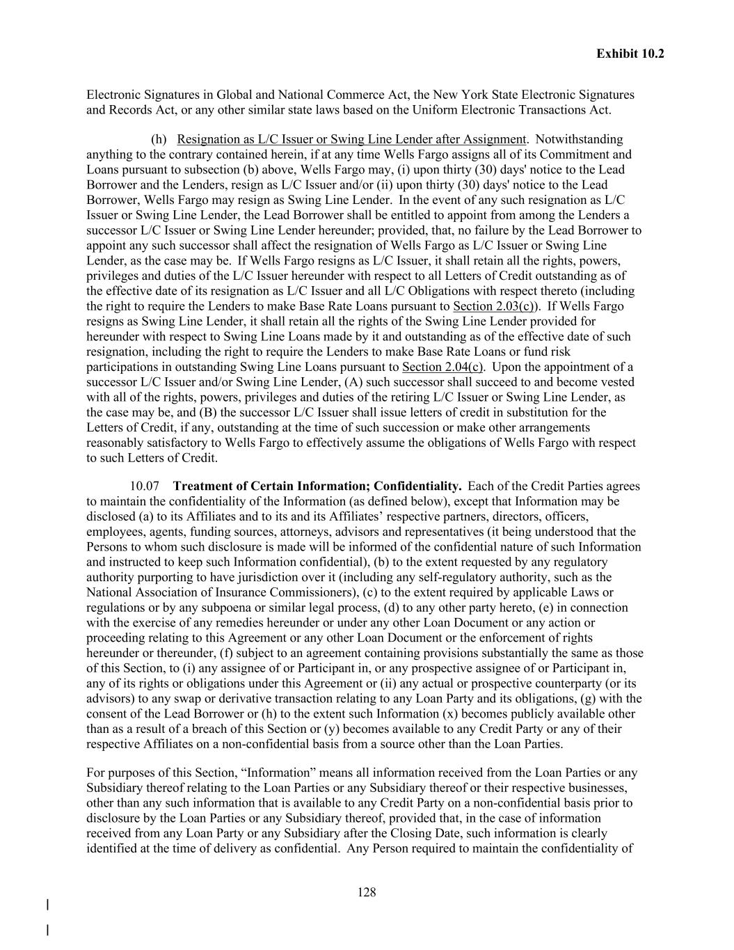 128 Exhibit 10.2 Electronic Signatures in Global and National Commerce Act, the New York State Electronic Signatures and Records Act, or any other similar state laws based on the Uniform Electronic Transactions Act. (h) Resignation as L/C Issuer or Swing Line Lender after Assignment. Notwithstanding anything to the contrary contained herein, if at any time Wells Fargo assigns all of its Commitment and Loans pursuant to subsection (b) above, Wells Fargo may, (i) upon thirty (30) days' notice to the Lead Borrower and the Lenders, resign as L/C Issuer and/or (ii) upon thirty (30) days' notice to the Lead Borrower, Wells Fargo may resign as Swing Line Lender. In the event of any such resignation as L/C Issuer or Swing Line Lender, the Lead Borrower shall be entitled to appoint from among the Lenders a successor L/C Issuer or Swing Line Lender hereunder; provided, that, no failure by the Lead Borrower to appoint any such successor shall affect the resignation of Wells Fargo as L/C Issuer or Swing Line Lender, as the case may be. If Wells Fargo resigns as L/C Issuer, it shall retain all the rights, powers, privileges and duties of the L/C Issuer hereunder with respect to all Letters of Credit outstanding as of the effective date of its resignation as L/C Issuer and all L/C Obligations with respect thereto (including the right to require the Lenders to make Base Rate Loans pursuant to Section 2.03(c)). If Wells Fargo resigns as Swing Line Lender, it shall retain all the rights of the Swing Line Lender provided for hereunder with respect to Swing Line Loans made by it and outstanding as of the effective date of such resignation, including the right to require the Lenders to make Base Rate Loans or fund risk participations in outstanding Swing Line Loans pursuant to Section 2.04(c). Upon the appointment of a successor L/C Issuer and/or Swing Line Lender, (A) such successor shall succeed to and become vested with all of the rights, powers, privileges and duties of the retiring L/C Issuer or Swing Line Lender, as the case may be, and (B) the successor L/C Issuer shall issue letters of credit in substitution for the Letters of Credit, if any, outstanding at the time of such succession or make other arrangements reasonably satisfactory to Wells Fargo to effectively assume the obligations of Wells Fargo with respect to such Letters of Credit. 10.07 Treatment of Certain Information; Confidentiality. Each of the Credit Parties agrees to maintain the confidentiality of the Information (as defined below), except that Information may be disclosed (a) to its Affiliates and to its and its Affiliates’ respective partners, directors, officers, employees, agents, funding sources, attorneys, advisors and representatives (it being understood that the Persons to whom such disclosure is made will be informed of the confidential nature of such Information and instructed to keep such Information confidential), (b) to the extent requested by any regulatory authority purporting to have jurisdiction over it (including any self-regulatory authority, such as the National Association of Insurance Commissioners), (c) to the extent required by applicable Laws or regulations or by any subpoena or similar legal process, (d) to any other party hereto, (e) in connection with the exercise of any remedies hereunder or under any other Loan Document or any action or proceeding relating to this Agreement or any other Loan Document or the enforcement of rights hereunder or thereunder, (f) subject to an agreement containing provisions substantially the same as those of this Section, to (i) any assignee of or Participant in, or any prospective assignee of or Participant in, any of its rights or obligations under this Agreement or (ii) any actual or prospective counterparty (or its advisors) to any swap or derivative transaction relating to any Loan Party and its obligations, (g) with the consent of the Lead Borrower or (h) to the extent such Information (x) becomes publicly available other than as a result of a breach of this Section or (y) becomes available to any Credit Party or any of their respective Affiliates on a non-confidential basis from a source other than the Loan Parties. For purposes of this Section, “Information” means all information received from the Loan Parties or any Subsidiary thereof relating to the Loan Parties or any Subsidiary thereof or their respective businesses, other than any such information that is available to any Credit Party on a non-confidential basis prior to disclosure by the Loan Parties or any Subsidiary thereof, provided that, in the case of information received from any Loan Party or any Subsidiary after the Closing Date, such information is clearly identified at the time of delivery as confidential. Any Person required to maintain the confidentiality of