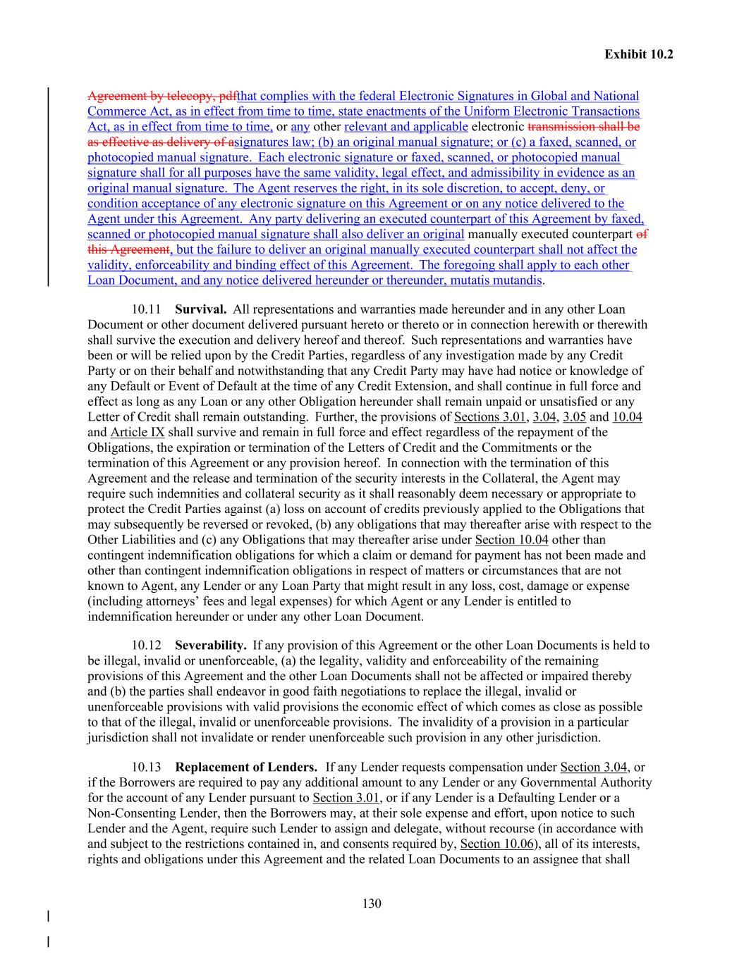 130 Exhibit 10.2 Agreement by telecopy, pdfthat complies with the federal Electronic Signatures in Global and National Commerce Act, as in effect from time to time, state enactments of the Uniform Electronic Transactions Act, as in effect from time to time, or any other relevant and applicable electronic transmission shall be as effective as delivery of asignatures law; (b) an original manual signature; or (c) a faxed, scanned, or photocopied manual signature. Each electronic signature or faxed, scanned, or photocopied manual signature shall for all purposes have the same validity, legal effect, and admissibility in evidence as an original manual signature. The Agent reserves the right, in its sole discretion, to accept, deny, or condition acceptance of any electronic signature on this Agreement or on any notice delivered to the Agent under this Agreement. Any party delivering an executed counterpart of this Agreement by faxed, scanned or photocopied manual signature shall also deliver an original manually executed counterpart of this Agreement, but the failure to deliver an original manually executed counterpart shall not affect the validity, enforceability and binding effect of this Agreement. The foregoing shall apply to each other Loan Document, and any notice delivered hereunder or thereunder, mutatis mutandis. 10.11 Survival. All representations and warranties made hereunder and in any other Loan Document or other document delivered pursuant hereto or thereto or in connection herewith or therewith shall survive the execution and delivery hereof and thereof. Such representations and warranties have been or will be relied upon by the Credit Parties, regardless of any investigation made by any Credit Party or on their behalf and notwithstanding that any Credit Party may have had notice or knowledge of any Default or Event of Default at the time of any Credit Extension, and shall continue in full force and effect as long as any Loan or any other Obligation hereunder shall remain unpaid or unsatisfied or any Letter of Credit shall remain outstanding. Further, the provisions of Sections 3.01, 3.04, 3.05 and 10.04 and Article IX shall survive and remain in full force and effect regardless of the repayment of the Obligations, the expiration or termination of the Letters of Credit and the Commitments or the termination of this Agreement or any provision hereof. In connection with the termination of this Agreement and the release and termination of the security interests in the Collateral, the Agent may require such indemnities and collateral security as it shall reasonably deem necessary or appropriate to protect the Credit Parties against (a) loss on account of credits previously applied to the Obligations that may subsequently be reversed or revoked, (b) any obligations that may thereafter arise with respect to the Other Liabilities and (c) any Obligations that may thereafter arise under Section 10.04 other than contingent indemnification obligations for which a claim or demand for payment has not been made and other than contingent indemnification obligations in respect of matters or circumstances that are not known to Agent, any Lender or any Loan Party that might result in any loss, cost, damage or expense (including attorneys’ fees and legal expenses) for which Agent or any Lender is entitled to indemnification hereunder or under any other Loan Document. 10.12 Severability. If any provision of this Agreement or the other Loan Documents is held to be illegal, invalid or unenforceable, (a) the legality, validity and enforceability of the remaining provisions of this Agreement and the other Loan Documents shall not be affected or impaired thereby and (b) the parties shall endeavor in good faith negotiations to replace the illegal, invalid or unenforceable provisions with valid provisions the economic effect of which comes as close as possible to that of the illegal, invalid or unenforceable provisions. The invalidity of a provision in a particular jurisdiction shall not invalidate or render unenforceable such provision in any other jurisdiction. 10.13 Replacement of Lenders. If any Lender requests compensation under Section 3.04, or if the Borrowers are required to pay any additional amount to any Lender or any Governmental Authority for the account of any Lender pursuant to Section 3.01, or if any Lender is a Defaulting Lender or a Non-Consenting Lender, then the Borrowers may, at their sole expense and effort, upon notice to such Lender and the Agent, require such Lender to assign and delegate, without recourse (in accordance with and subject to the restrictions contained in, and consents required by, Section 10.06), all of its interests, rights and obligations under this Agreement and the related Loan Documents to an assignee that shall