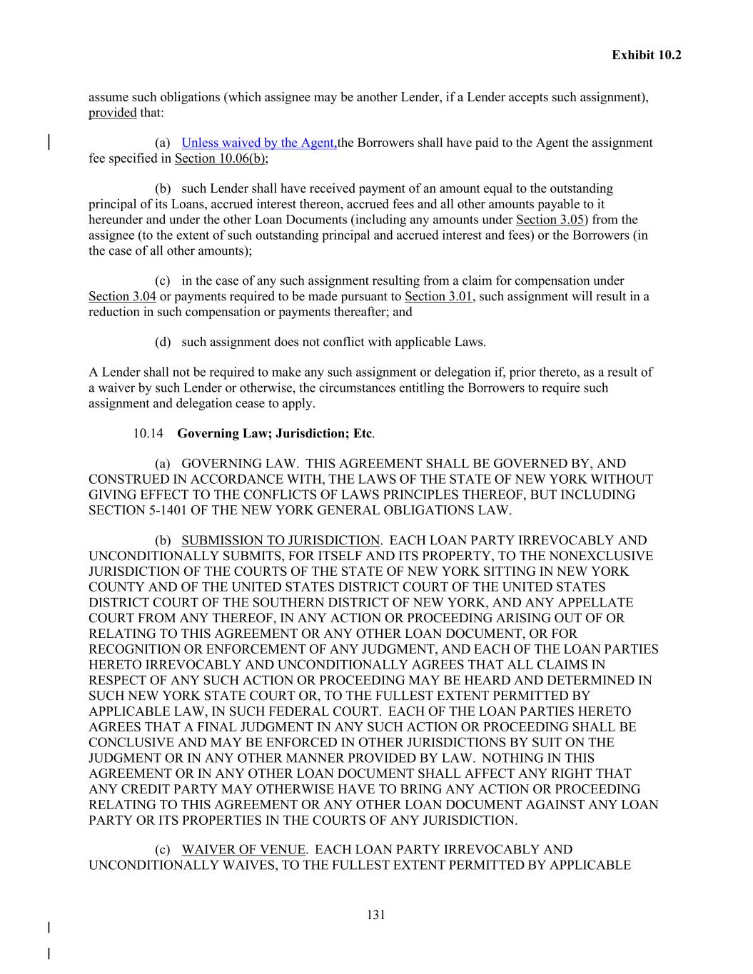 131 Exhibit 10.2 assume such obligations (which assignee may be another Lender, if a Lender accepts such assignment), provided that: (a) Unless waived by the Agent,the Borrowers shall have paid to the Agent the assignment fee specified in Section 10.06(b); (b) such Lender shall have received payment of an amount equal to the outstanding principal of its Loans, accrued interest thereon, accrued fees and all other amounts payable to it hereunder and under the other Loan Documents (including any amounts under Section 3.05) from the assignee (to the extent of such outstanding principal and accrued interest and fees) or the Borrowers (in the case of all other amounts); (c) in the case of any such assignment resulting from a claim for compensation under Section 3.04 or payments required to be made pursuant to Section 3.01, such assignment will result in a reduction in such compensation or payments thereafter; and (d) such assignment does not conflict with applicable Laws. A Lender shall not be required to make any such assignment or delegation if, prior thereto, as a result of a waiver by such Lender or otherwise, the circumstances entitling the Borrowers to require such assignment and delegation cease to apply. 10.14 Governing Law; Jurisdiction; Etc. (a) GOVERNING LAW. THIS AGREEMENT SHALL BE GOVERNED BY, AND CONSTRUED IN ACCORDANCE WITH, THE LAWS OF THE STATE OF NEW YORK WITHOUT GIVING EFFECT TO THE CONFLICTS OF LAWS PRINCIPLES THEREOF, BUT INCLUDING SECTION 5-1401 OF THE NEW YORK GENERAL OBLIGATIONS LAW. (b) SUBMISSION TO JURISDICTION. EACH LOAN PARTY IRREVOCABLY AND UNCONDITIONALLY SUBMITS, FOR ITSELF AND ITS PROPERTY, TO THE NONEXCLUSIVE JURISDICTION OF THE COURTS OF THE STATE OF NEW YORK SITTING IN NEW YORK COUNTY AND OF THE UNITED STATES DISTRICT COURT OF THE UNITED STATES DISTRICT COURT OF THE SOUTHERN DISTRICT OF NEW YORK, AND ANY APPELLATE COURT FROM ANY THEREOF, IN ANY ACTION OR PROCEEDING ARISING OUT OF OR RELATING TO THIS AGREEMENT OR ANY OTHER LOAN DOCUMENT, OR FOR RECOGNITION OR ENFORCEMENT OF ANY JUDGMENT, AND EACH OF THE LOAN PARTIES HERETO IRREVOCABLY AND UNCONDITIONALLY AGREES THAT ALL CLAIMS IN RESPECT OF ANY SUCH ACTION OR PROCEEDING MAY BE HEARD AND DETERMINED IN SUCH NEW YORK STATE COURT OR, TO THE FULLEST EXTENT PERMITTED BY APPLICABLE LAW, IN SUCH FEDERAL COURT. EACH OF THE LOAN PARTIES HERETO AGREES THAT A FINAL JUDGMENT IN ANY SUCH ACTION OR PROCEEDING SHALL BE CONCLUSIVE AND MAY BE ENFORCED IN OTHER JURISDICTIONS BY SUIT ON THE JUDGMENT OR IN ANY OTHER MANNER PROVIDED BY LAW. NOTHING IN THIS AGREEMENT OR IN ANY OTHER LOAN DOCUMENT SHALL AFFECT ANY RIGHT THAT ANY CREDIT PARTY MAY OTHERWISE HAVE TO BRING ANY ACTION OR PROCEEDING RELATING TO THIS AGREEMENT OR ANY OTHER LOAN DOCUMENT AGAINST ANY LOAN PARTY OR ITS PROPERTIES IN THE COURTS OF ANY JURISDICTION. (c) WAIVER OF VENUE. EACH LOAN PARTY IRREVOCABLY AND UNCONDITIONALLY WAIVES, TO THE FULLEST EXTENT PERMITTED BY APPLICABLE