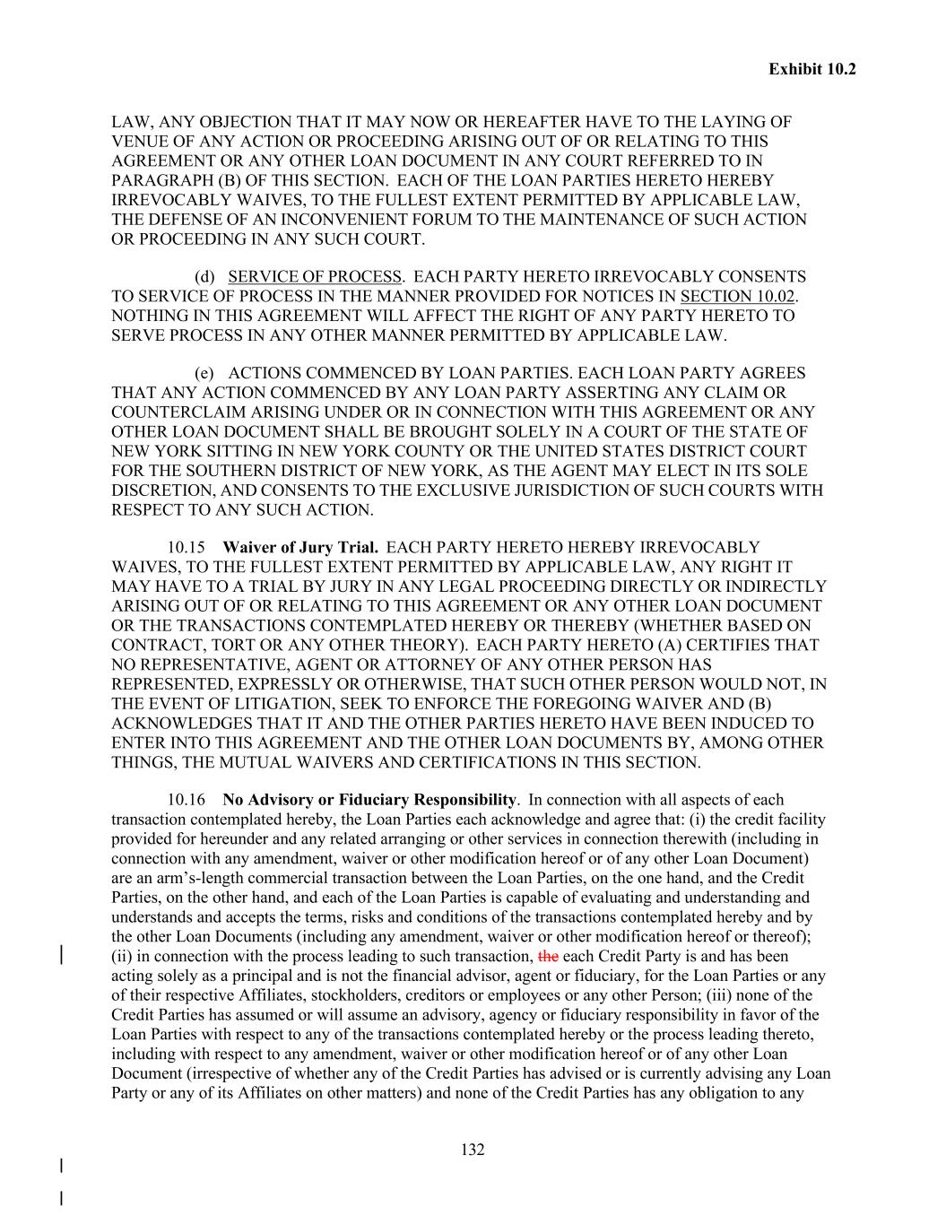 132 Exhibit 10.2 LAW, ANY OBJECTION THAT IT MAY NOW OR HEREAFTER HAVE TO THE LAYING OF VENUE OF ANY ACTION OR PROCEEDING ARISING OUT OF OR RELATING TO THIS AGREEMENT OR ANY OTHER LOAN DOCUMENT IN ANY COURT REFERRED TO IN PARAGRAPH (B) OF THIS SECTION. EACH OF THE LOAN PARTIES HERETO HEREBY IRREVOCABLY WAIVES, TO THE FULLEST EXTENT PERMITTED BY APPLICABLE LAW, THE DEFENSE OF AN INCONVENIENT FORUM TO THE MAINTENANCE OF SUCH ACTION OR PROCEEDING IN ANY SUCH COURT. (d) SERVICE OF PROCESS. EACH PARTY HERETO IRREVOCABLY CONSENTS TO SERVICE OF PROCESS IN THE MANNER PROVIDED FOR NOTICES IN SECTION 10.02. NOTHING IN THIS AGREEMENT WILL AFFECT THE RIGHT OF ANY PARTY HERETO TO SERVE PROCESS IN ANY OTHER MANNER PERMITTED BY APPLICABLE LAW. (e) ACTIONS COMMENCED BY LOAN PARTIES. EACH LOAN PARTY AGREES THAT ANY ACTION COMMENCED BY ANY LOAN PARTY ASSERTING ANY CLAIM OR COUNTERCLAIM ARISING UNDER OR IN CONNECTION WITH THIS AGREEMENT OR ANY OTHER LOAN DOCUMENT SHALL BE BROUGHT SOLELY IN A COURT OF THE STATE OF NEW YORK SITTING IN NEW YORK COUNTY OR THE UNITED STATES DISTRICT COURT FOR THE SOUTHERN DISTRICT OF NEW YORK, AS THE AGENT MAY ELECT IN ITS SOLE DISCRETION, AND CONSENTS TO THE EXCLUSIVE JURISDICTION OF SUCH COURTS WITH RESPECT TO ANY SUCH ACTION. 10.15 Waiver of Jury Trial. EACH PARTY HERETO HEREBY IRREVOCABLY WAIVES, TO THE FULLEST EXTENT PERMITTED BY APPLICABLE LAW, ANY RIGHT IT MAY HAVE TO A TRIAL BY JURY IN ANY LEGAL PROCEEDING DIRECTLY OR INDIRECTLY ARISING OUT OF OR RELATING TO THIS AGREEMENT OR ANY OTHER LOAN DOCUMENT OR THE TRANSACTIONS CONTEMPLATED HEREBY OR THEREBY (WHETHER BASED ON CONTRACT, TORT OR ANY OTHER THEORY). EACH PARTY HERETO (A) CERTIFIES THAT NO REPRESENTATIVE, AGENT OR ATTORNEY OF ANY OTHER PERSON HAS REPRESENTED, EXPRESSLY OR OTHERWISE, THAT SUCH OTHER PERSON WOULD NOT, IN THE EVENT OF LITIGATION, SEEK TO ENFORCE THE FOREGOING WAIVER AND (B) ACKNOWLEDGES THAT IT AND THE OTHER PARTIES HERETO HAVE BEEN INDUCED TO ENTER INTO THIS AGREEMENT AND THE OTHER LOAN DOCUMENTS BY, AMONG OTHER THINGS, THE MUTUAL WAIVERS AND CERTIFICATIONS IN THIS SECTION. 10.16 No Advisory or Fiduciary Responsibility. In connection with all aspects of each transaction contemplated hereby, the Loan Parties each acknowledge and agree that: (i) the credit facility provided for hereunder and any related arranging or other services in connection therewith (including in connection with any amendment, waiver or other modification hereof or of any other Loan Document) are an arm’s-length commercial transaction between the Loan Parties, on the one hand, and the Credit Parties, on the other hand, and each of the Loan Parties is capable of evaluating and understanding and understands and accepts the terms, risks and conditions of the transactions contemplated hereby and by the other Loan Documents (including any amendment, waiver or other modification hereof or thereof); (ii) in connection with the process leading to such transaction, the each Credit Party is and has been acting solely as a principal and is not the financial advisor, agent or fiduciary, for the Loan Parties or any of their respective Affiliates, stockholders, creditors or employees or any other Person; (iii) none of the Credit Parties has assumed or will assume an advisory, agency or fiduciary responsibility in favor of the Loan Parties with respect to any of the transactions contemplated hereby or the process leading thereto, including with respect to any amendment, waiver or other modification hereof or of any other Loan Document (irrespective of whether any of the Credit Parties has advised or is currently advising any Loan Party or any of its Affiliates on other matters) and none of the Credit Parties has any obligation to any