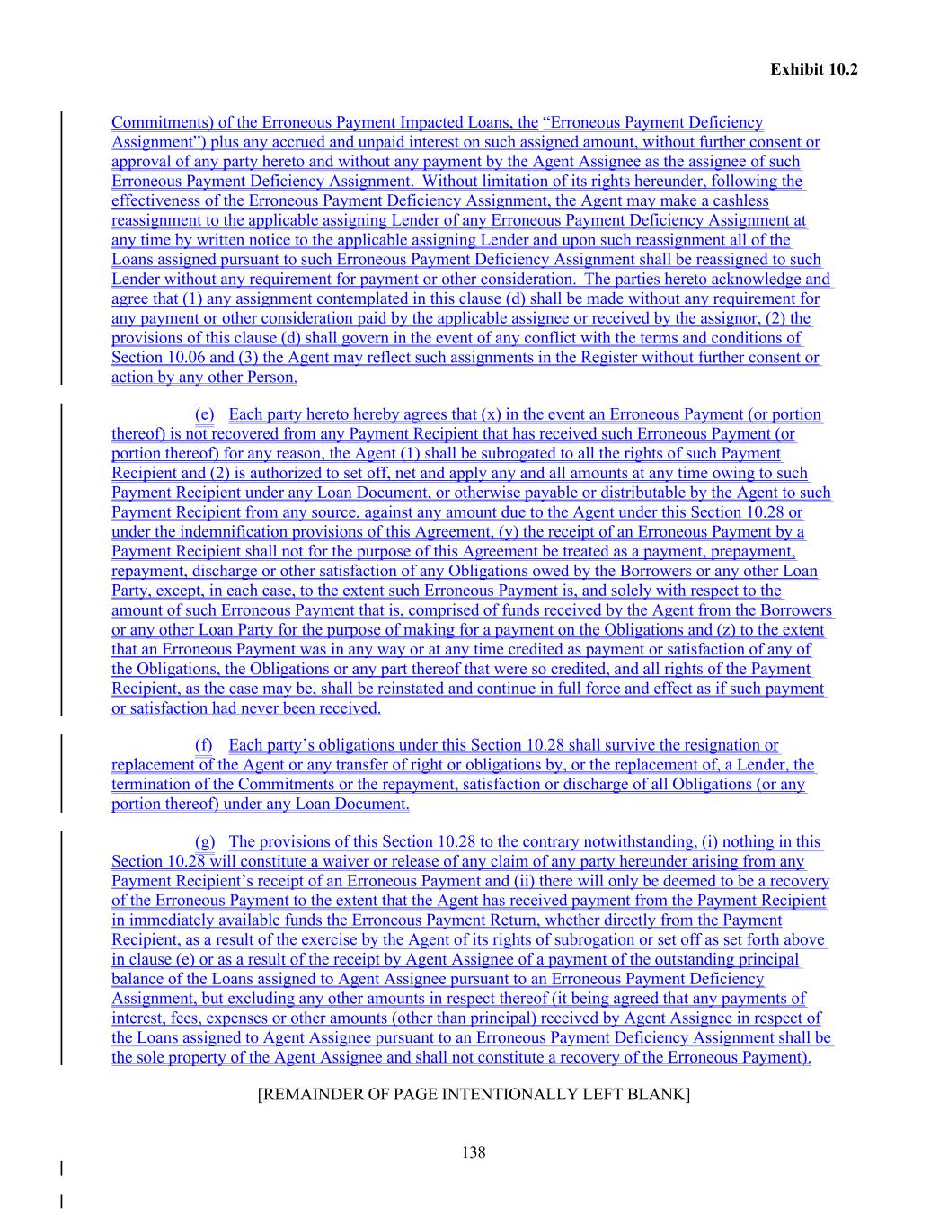 138 Exhibit 10.2 Commitments) of the Erroneous Payment Impacted Loans, the “Erroneous Payment Deficiency Assignment”) plus any accrued and unpaid interest on such assigned amount, without further consent or approval of any party hereto and without any payment by the Agent Assignee as the assignee of such Erroneous Payment Deficiency Assignment. Without limitation of its rights hereunder, following the effectiveness of the Erroneous Payment Deficiency Assignment, the Agent may make a cashless reassignment to the applicable assigning Lender of any Erroneous Payment Deficiency Assignment at any time by written notice to the applicable assigning Lender and upon such reassignment all of the Loans assigned pursuant to such Erroneous Payment Deficiency Assignment shall be reassigned to such Lender without any requirement for payment or other consideration. The parties hereto acknowledge and agree that (1) any assignment contemplated in this clause (d) shall be made without any requirement for any payment or other consideration paid by the applicable assignee or received by the assignor, (2) the provisions of this clause (d) shall govern in the event of any conflict with the terms and conditions of Section 10.06 and (3) the Agent may reflect such assignments in the Register without further consent or action by any other Person. (e) Each party hereto hereby agrees that (x) in the event an Erroneous Payment (or portion thereof) is not recovered from any Payment Recipient that has received such Erroneous Payment (or portion thereof) for any reason, the Agent (1) shall be subrogated to all the rights of such Payment Recipient and (2) is authorized to set off, net and apply any and all amounts at any time owing to such Payment Recipient under any Loan Document, or otherwise payable or distributable by the Agent to such Payment Recipient from any source, against any amount due to the Agent under this Section 10.28 or under the indemnification provisions of this Agreement, (y) the receipt of an Erroneous Payment by a Payment Recipient shall not for the purpose of this Agreement be treated as a payment, prepayment, repayment, discharge or other satisfaction of any Obligations owed by the Borrowers or any other Loan Party, except, in each case, to the extent such Erroneous Payment is, and solely with respect to the amount of such Erroneous Payment that is, comprised of funds received by the Agent from the Borrowers or any other Loan Party for the purpose of making for a payment on the Obligations and (z) to the extent that an Erroneous Payment was in any way or at any time credited as payment or satisfaction of any of the Obligations, the Obligations or any part thereof that were so credited, and all rights of the Payment Recipient, as the case may be, shall be reinstated and continue in full force and effect as if such payment or satisfaction had never been received. (f) Each party’s obligations under this Section 10.28 shall survive the resignation or replacement of the Agent or any transfer of right or obligations by, or the replacement of, a Lender, the termination of the Commitments or the repayment, satisfaction or discharge of all Obligations (or any portion thereof) under any Loan Document. (g) The provisions of this Section 10.28 to the contrary notwithstanding, (i) nothing in this Section 10.28 will constitute a waiver or release of any claim of any party hereunder arising from any Payment Recipient’s receipt of an Erroneous Payment and (ii) there will only be deemed to be a recovery of the Erroneous Payment to the extent that the Agent has received payment from the Payment Recipient in immediately available funds the Erroneous Payment Return, whether directly from the Payment Recipient, as a result of the exercise by the Agent of its rights of subrogation or set off as set forth above in clause (e) or as a result of the receipt by Agent Assignee of a payment of the outstanding principal balance of the Loans assigned to Agent Assignee pursuant to an Erroneous Payment Deficiency Assignment, but excluding any other amounts in respect thereof (it being agreed that any payments of interest, fees, expenses or other amounts (other than principal) received by Agent Assignee in respect of the Loans assigned to Agent Assignee pursuant to an Erroneous Payment Deficiency Assignment shall be the sole property of the Agent Assignee and shall not constitute a recovery of the Erroneous Payment). [REMAINDER OF PAGE INTENTIONALLY LEFT BLANK]