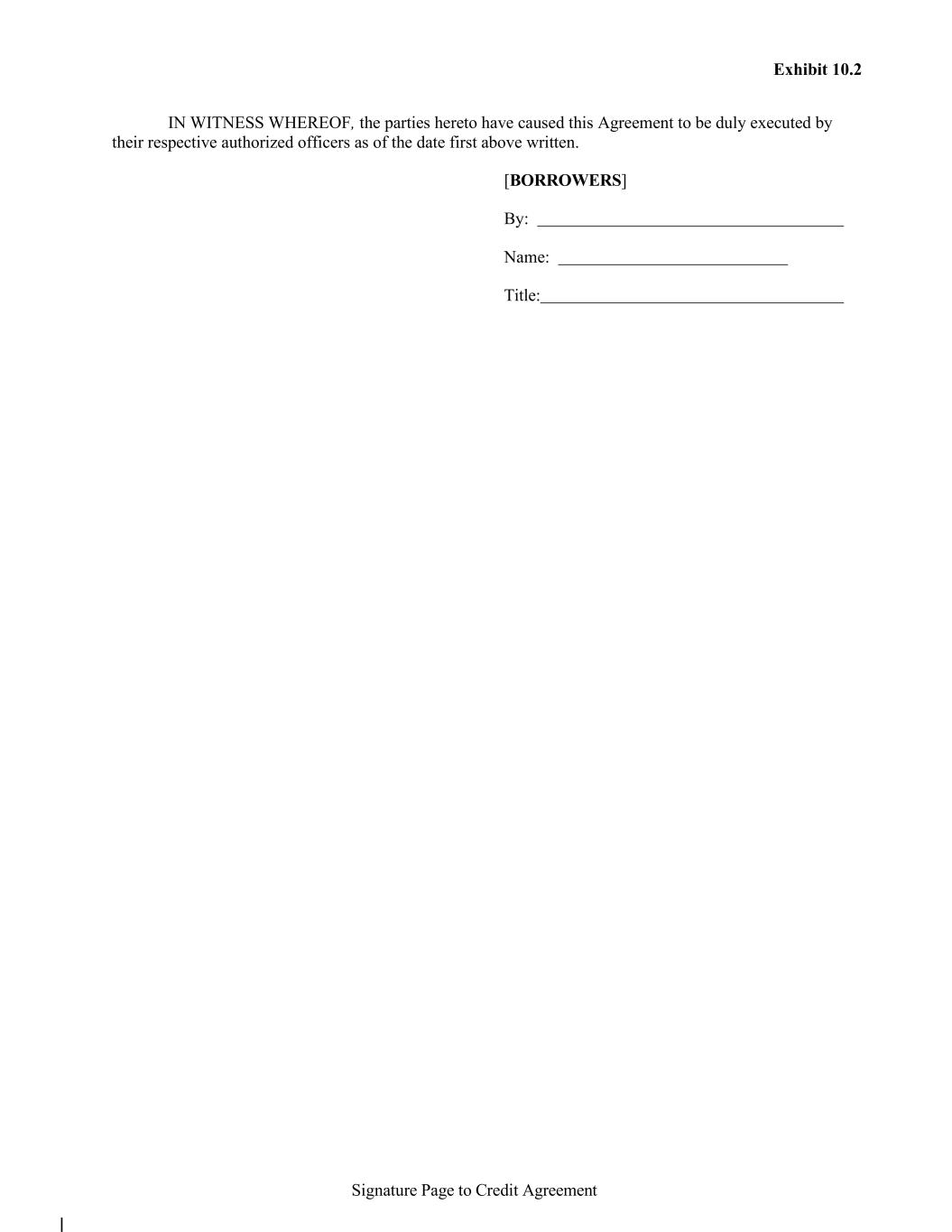 Signature Page to Credit Agreement Exhibit 10.2 IN WITNESS WHEREOF, the parties hereto have caused this Agreement to be duly executed by their respective authorized officers as of the date first above written. [BORROWERS] By: Name: Title: