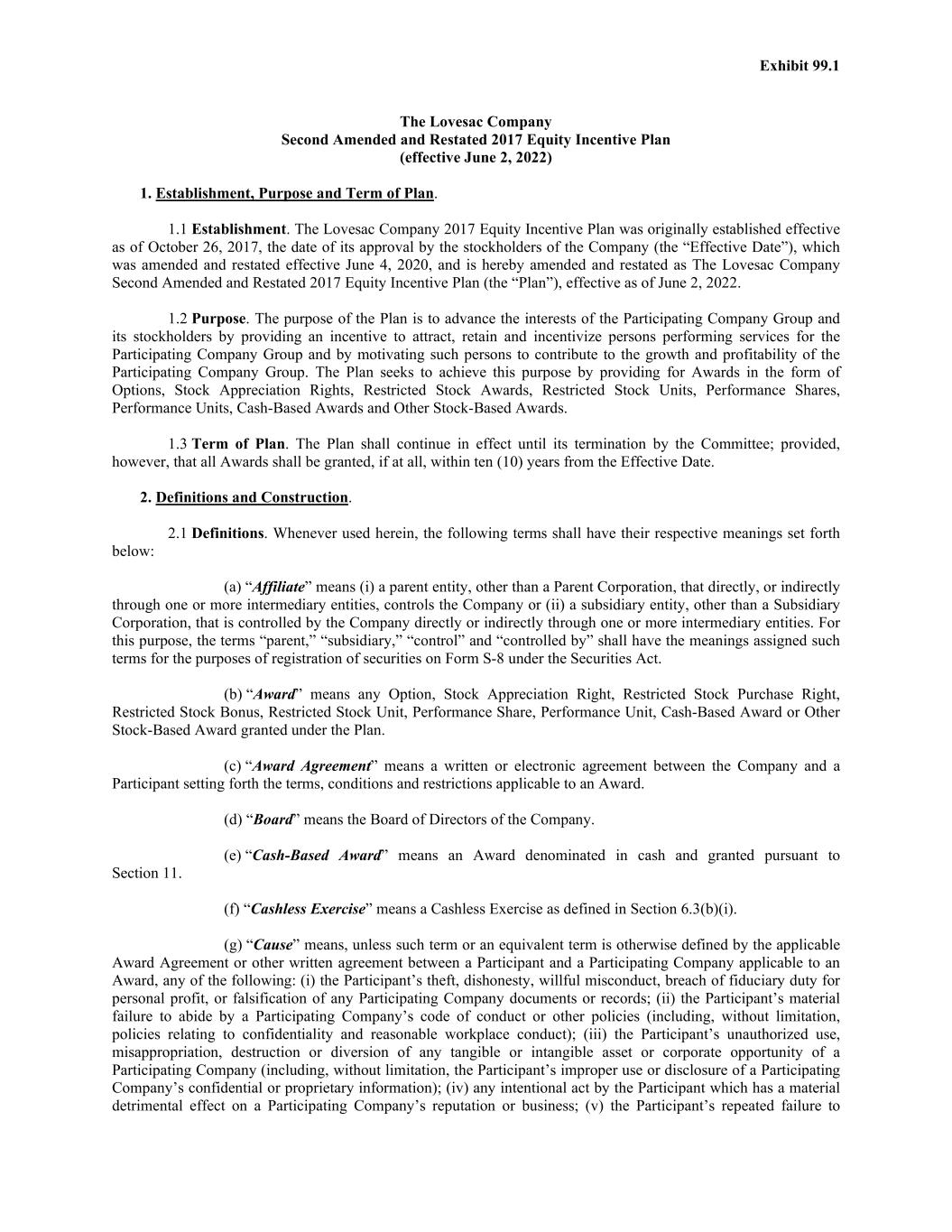 Exhibit 99.1 The Lovesac Company Second Amended and Restated 2017 Equity Incentive Plan (effective June 2, 2022) 1. Establishment, Purpose and Term of Plan. 1.1 Establishment. The Lovesac Company 2017 Equity Incentive Plan was originally established effective as of October 26, 2017, the date of its approval by the stockholders of the Company (the “Effective Date”), which was amended and restated effective June 4, 2020, and is hereby amended and restated as The Lovesac Company Second Amended and Restated 2017 Equity Incentive Plan (the “Plan”), effective as of June 2, 2022. 1.2 Purpose. The purpose of the Plan is to advance the interests of the Participating Company Group and its stockholders by providing an incentive to attract, retain and incentivize persons performing services for the Participating Company Group and by motivating such persons to contribute to the growth and profitability of the Participating Company Group. The Plan seeks to achieve this purpose by providing for Awards in the form of Options, Stock Appreciation Rights, Restricted Stock Awards, Restricted Stock Units, Performance Shares, Performance Units, Cash-Based Awards and Other Stock-Based Awards. 1.3 Term of Plan. The Plan shall continue in effect until its termination by the Committee; provided, however, that all Awards shall be granted, if at all, within ten (10) years from the Effective Date. 2. Definitions and Construction. 2.1 Definitions. Whenever used herein, the following terms shall have their respective meanings set forth below: (a) “Affiliate” means (i) a parent entity, other than a Parent Corporation, that directly, or indirectly through one or more intermediary entities, controls the Company or (ii) a subsidiary entity, other than a Subsidiary Corporation, that is controlled by the Company directly or indirectly through one or more intermediary entities. For this purpose, the terms “parent,” “subsidiary,” “control” and “controlled by” shall have the meanings assigned such terms for the purposes of registration of securities on Form S-8 under the Securities Act. (b) “Award” means any Option, Stock Appreciation Right, Restricted Stock Purchase Right, Restricted Stock Bonus, Restricted Stock Unit, Performance Share, Performance Unit, Cash-Based Award or Other Stock-Based Award granted under the Plan. (c) “Award Agreement” means a written or electronic agreement between the Company and a Participant setting forth the terms, conditions and restrictions applicable to an Award. (d) “Board” means the Board of Directors of the Company. (e) “Cash-Based Award” means an Award denominated in cash and granted pursuant to Section 11. (f) “Cashless Exercise” means a Cashless Exercise as defined in Section 6.3(b)(i). (g) “Cause” means, unless such term or an equivalent term is otherwise defined by the applicable Award Agreement or other written agreement between a Participant and a Participating Company applicable to an Award, any of the following: (i) the Participant’s theft, dishonesty, willful misconduct, breach of fiduciary duty for personal profit, or falsification of any Participating Company documents or records; (ii) the Participant’s material failure to abide by a Participating Company’s code of conduct or other policies (including, without limitation, policies relating to confidentiality and reasonable workplace conduct); (iii) the Participant’s unauthorized use, misappropriation, destruction or diversion of any tangible or intangible asset or corporate opportunity of a Participating Company (including, without limitation, the Participant’s improper use or disclosure of a Participating Company’s confidential or proprietary information); (iv) any intentional act by the Participant which has a material detrimental effect on a Participating Company’s reputation or business; (v) the Participant’s repeated failure to