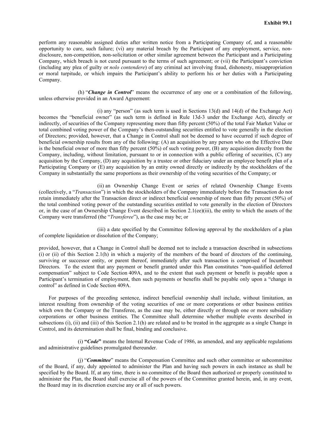 Exhibit 99.1 perform any reasonable assigned duties after written notice from a Participating Company of, and a reasonable opportunity to cure, such failure; (vi) any material breach by the Participant of any employment, service, non- disclosure, non-competition, non-solicitation or other similar agreement between the Participant and a Participating Company, which breach is not cured pursuant to the terms of such agreement; or (vii) the Participant’s conviction (including any plea of guilty or nolo contendere) of any criminal act involving fraud, dishonesty, misappropriation or moral turpitude, or which impairs the Participant’s ability to perform his or her duties with a Participating Company. (h) “Change in Control” means the occurrence of any one or a combination of the following, unless otherwise provided in an Award Agreement: (i) any “person” (as such term is used in Sections 13(d) and 14(d) of the Exchange Act) becomes the “beneficial owner” (as such term is defined in Rule 13d-3 under the Exchange Act), directly or indirectly, of securities of the Company representing more than fifty percent (50%) of the total Fair Market Value or total combined voting power of the Company’s then-outstanding securities entitled to vote generally in the election of Directors; provided, however, that a Change in Control shall not be deemed to have occurred if such degree of beneficial ownership results from any of the following: (A) an acquisition by any person who on the Effective Date is the beneficial owner of more than fifty percent (50%) of such voting power, (B) any acquisition directly from the Company, including, without limitation, pursuant to or in connection with a public offering of securities, (C) any acquisition by the Company, (D) any acquisition by a trustee or other fiduciary under an employee benefit plan of a Participating Company or (E) any acquisition by an entity owned directly or indirectly by the stockholders of the Company in substantially the same proportions as their ownership of the voting securities of the Company; or (ii) an Ownership Change Event or series of related Ownership Change Events (collectively, a “Transaction”) in which the stockholders of the Company immediately before the Transaction do not retain immediately after the Transaction direct or indirect beneficial ownership of more than fifty percent (50%) of the total combined voting power of the outstanding securities entitled to vote generally in the election of Directors or, in the case of an Ownership Change Event described in Section 2.1(ee)(iii), the entity to which the assets of the Company were transferred (the “Transferee”), as the case may be; or (iii) a date specified by the Committee following approval by the stockholders of a plan of complete liquidation or dissolution of the Company; provided, however, that a Change in Control shall be deemed not to include a transaction described in subsections (i) or (ii) of this Section 2.1(h) in which a majority of the members of the board of directors of the continuing, surviving or successor entity, or parent thereof, immediately after such transaction is comprised of Incumbent Directors. To the extent that any payment or benefit granted under this Plan constitutes “non-qualified deferred compensation” subject to Code Section 409A, and to the extent that such payment or benefit is payable upon a Participant’s termination of employment, then such payments or benefits shall be payable only upon a “change in control” as defined in Code Section 409A. For purposes of the preceding sentence, indirect beneficial ownership shall include, without limitation, an interest resulting from ownership of the voting securities of one or more corporations or other business entities which own the Company or the Transferee, as the case may be, either directly or through one or more subsidiary corporations or other business entities. The Committee shall determine whether multiple events described in subsections (i), (ii) and (iii) of this Section 2.1(h) are related and to be treated in the aggregate as a single Change in Control, and its determination shall be final, binding and conclusive. (i) “Code” means the Internal Revenue Code of 1986, as amended, and any applicable regulations and administrative guidelines promulgated thereunder. (j) “Committee” means the Compensation Committee and such other committee or subcommittee of the Board, if any, duly appointed to administer the Plan and having such powers in each instance as shall be specified by the Board. If, at any time, there is no committee of the Board then authorized or properly constituted to administer the Plan, the Board shall exercise all of the powers of the Committee granted herein, and, in any event, the Board may in its discretion exercise any or all of such powers.