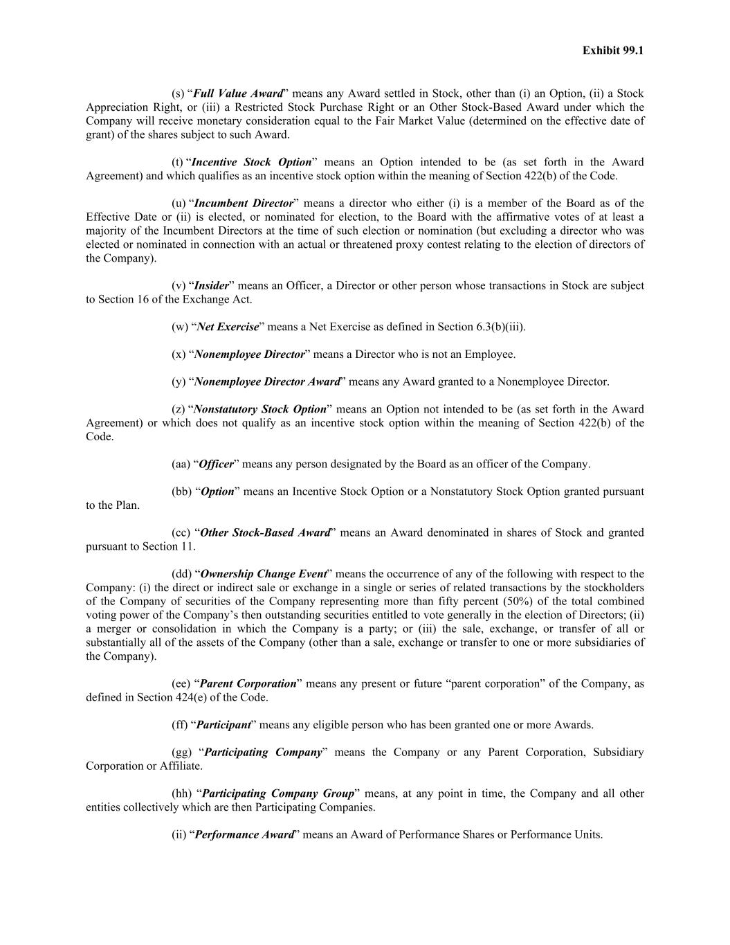 Exhibit 99.1 (s) “Full Value Award” means any Award settled in Stock, other than (i) an Option, (ii) a Stock Appreciation Right, or (iii) a Restricted Stock Purchase Right or an Other Stock-Based Award under which the Company will receive monetary consideration equal to the Fair Market Value (determined on the effective date of grant) of the shares subject to such Award. (t) “Incentive Stock Option” means an Option intended to be (as set forth in the Award Agreement) and which qualifies as an incentive stock option within the meaning of Section 422(b) of the Code. (u) “Incumbent Director” means a director who either (i) is a member of the Board as of the Effective Date or (ii) is elected, or nominated for election, to the Board with the affirmative votes of at least a majority of the Incumbent Directors at the time of such election or nomination (but excluding a director who was elected or nominated in connection with an actual or threatened proxy contest relating to the election of directors of the Company). (v) “Insider” means an Officer, a Director or other person whose transactions in Stock are subject to Section 16 of the Exchange Act. (w) “Net Exercise” means a Net Exercise as defined in Section 6.3(b)(iii). (x) “Nonemployee Director” means a Director who is not an Employee. (y) “Nonemployee Director Award” means any Award granted to a Nonemployee Director. (z) “Nonstatutory Stock Option” means an Option not intended to be (as set forth in the Award Agreement) or which does not qualify as an incentive stock option within the meaning of Section 422(b) of the Code. (aa) “Officer” means any person designated by the Board as an officer of the Company. (bb) “Option” means an Incentive Stock Option or a Nonstatutory Stock Option granted pursuant to the Plan. (cc) “Other Stock-Based Award” means an Award denominated in shares of Stock and granted pursuant to Section 11. (dd) “Ownership Change Event” means the occurrence of any of the following with respect to the Company: (i) the direct or indirect sale or exchange in a single or series of related transactions by the stockholders of the Company of securities of the Company representing more than fifty percent (50%) of the total combined voting power of the Company’s then outstanding securities entitled to vote generally in the election of Directors; (ii) a merger or consolidation in which the Company is a party; or (iii) the sale, exchange, or transfer of all or substantially all of the assets of the Company (other than a sale, exchange or transfer to one or more subsidiaries of the Company). (ee) “Parent Corporation” means any present or future “parent corporation” of the Company, as defined in Section 424(e) of the Code. (ff) “Participant” means any eligible person who has been granted one or more Awards. (gg) “Participating Company” means the Company or any Parent Corporation, Subsidiary Corporation or Affiliate. (hh) “Participating Company Group” means, at any point in time, the Company and all other entities collectively which are then Participating Companies. (ii) “Performance Award” means an Award of Performance Shares or Performance Units.