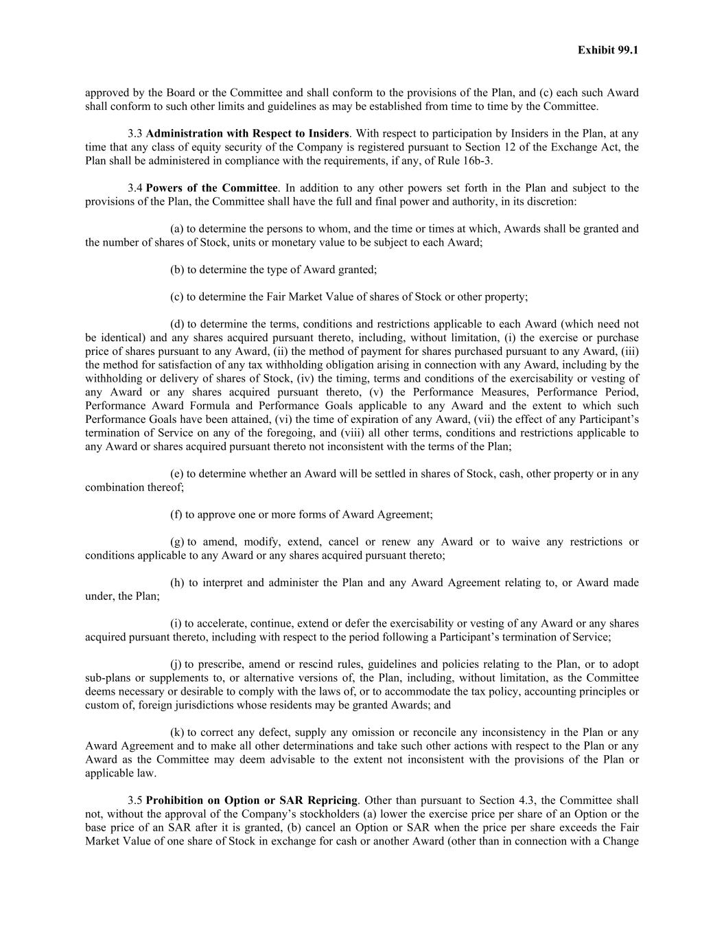 Exhibit 99.1 approved by the Board or the Committee and shall conform to the provisions of the Plan, and (c) each such Award shall conform to such other limits and guidelines as may be established from time to time by the Committee. 3.3 Administration with Respect to Insiders. With respect to participation by Insiders in the Plan, at any time that any class of equity security of the Company is registered pursuant to Section 12 of the Exchange Act, the Plan shall be administered in compliance with the requirements, if any, of Rule 16b-3. 3.4 Powers of the Committee. In addition to any other powers set forth in the Plan and subject to the provisions of the Plan, the Committee shall have the full and final power and authority, in its discretion: (a) to determine the persons to whom, and the time or times at which, Awards shall be granted and the number of shares of Stock, units or monetary value to be subject to each Award; (b) to determine the type of Award granted; (c) to determine the Fair Market Value of shares of Stock or other property; (d) to determine the terms, conditions and restrictions applicable to each Award (which need not be identical) and any shares acquired pursuant thereto, including, without limitation, (i) the exercise or purchase price of shares pursuant to any Award, (ii) the method of payment for shares purchased pursuant to any Award, (iii) the method for satisfaction of any tax withholding obligation arising in connection with any Award, including by the withholding or delivery of shares of Stock, (iv) the timing, terms and conditions of the exercisability or vesting of any Award or any shares acquired pursuant thereto, (v) the Performance Measures, Performance Period, Performance Award Formula and Performance Goals applicable to any Award and the extent to which such Performance Goals have been attained, (vi) the time of expiration of any Award, (vii) the effect of any Participant’s termination of Service on any of the foregoing, and (viii) all other terms, conditions and restrictions applicable to any Award or shares acquired pursuant thereto not inconsistent with the terms of the Plan; (e) to determine whether an Award will be settled in shares of Stock, cash, other property or in any combination thereof; (f) to approve one or more forms of Award Agreement; (g) to amend, modify, extend, cancel or renew any Award or to waive any restrictions or conditions applicable to any Award or any shares acquired pursuant thereto; (h) to interpret and administer the Plan and any Award Agreement relating to, or Award made under, the Plan; (i) to accelerate, continue, extend or defer the exercisability or vesting of any Award or any shares acquired pursuant thereto, including with respect to the period following a Participant’s termination of Service; (j) to prescribe, amend or rescind rules, guidelines and policies relating to the Plan, or to adopt sub-plans or supplements to, or alternative versions of, the Plan, including, without limitation, as the Committee deems necessary or desirable to comply with the laws of, or to accommodate the tax policy, accounting principles or custom of, foreign jurisdictions whose residents may be granted Awards; and (k) to correct any defect, supply any omission or reconcile any inconsistency in the Plan or any Award Agreement and to make all other determinations and take such other actions with respect to the Plan or any Award as the Committee may deem advisable to the extent not inconsistent with the provisions of the Plan or applicable law. 3.5 Prohibition on Option or SAR Repricing. Other than pursuant to Section 4.3, the Committee shall not, without the approval of the Company’s stockholders (a) lower the exercise price per share of an Option or the base price of an SAR after it is granted, (b) cancel an Option or SAR when the price per share exceeds the Fair Market Value of one share of Stock in exchange for cash or another Award (other than in connection with a Change
