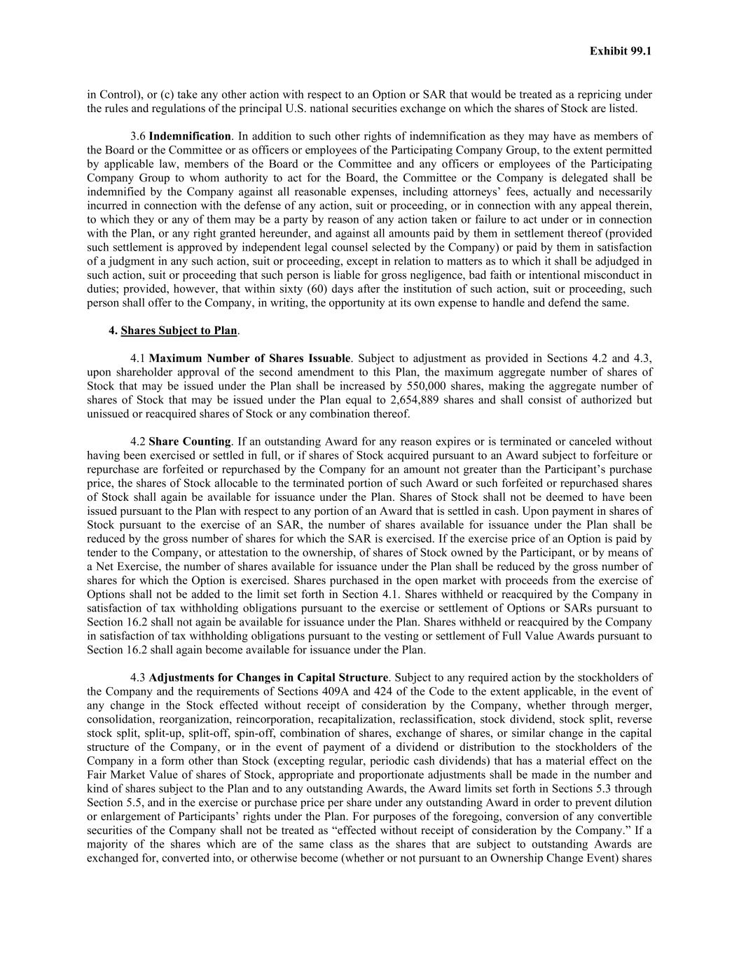 Exhibit 99.1 in Control), or (c) take any other action with respect to an Option or SAR that would be treated as a repricing under the rules and regulations of the principal U.S. national securities exchange on which the shares of Stock are listed. 3.6 Indemnification. In addition to such other rights of indemnification as they may have as members of the Board or the Committee or as officers or employees of the Participating Company Group, to the extent permitted by applicable law, members of the Board or the Committee and any officers or employees of the Participating Company Group to whom authority to act for the Board, the Committee or the Company is delegated shall be indemnified by the Company against all reasonable expenses, including attorneys’ fees, actually and necessarily incurred in connection with the defense of any action, suit or proceeding, or in connection with any appeal therein, to which they or any of them may be a party by reason of any action taken or failure to act under or in connection with the Plan, or any right granted hereunder, and against all amounts paid by them in settlement thereof (provided such settlement is approved by independent legal counsel selected by the Company) or paid by them in satisfaction of a judgment in any such action, suit or proceeding, except in relation to matters as to which it shall be adjudged in such action, suit or proceeding that such person is liable for gross negligence, bad faith or intentional misconduct in duties; provided, however, that within sixty (60) days after the institution of such action, suit or proceeding, such person shall offer to the Company, in writing, the opportunity at its own expense to handle and defend the same. 4. Shares Subject to Plan. 4.1 Maximum Number of Shares Issuable. Subject to adjustment as provided in Sections 4.2 and 4.3, upon shareholder approval of the second amendment to this Plan, the maximum aggregate number of shares of Stock that may be issued under the Plan shall be increased by 550,000 shares, making the aggregate number of shares of Stock that may be issued under the Plan equal to 2,654,889 shares and shall consist of authorized but unissued or reacquired shares of Stock or any combination thereof. 4.2 Share Counting. If an outstanding Award for any reason expires or is terminated or canceled without having been exercised or settled in full, or if shares of Stock acquired pursuant to an Award subject to forfeiture or repurchase are forfeited or repurchased by the Company for an amount not greater than the Participant’s purchase price, the shares of Stock allocable to the terminated portion of such Award or such forfeited or repurchased shares of Stock shall again be available for issuance under the Plan. Shares of Stock shall not be deemed to have been issued pursuant to the Plan with respect to any portion of an Award that is settled in cash. Upon payment in shares of Stock pursuant to the exercise of an SAR, the number of shares available for issuance under the Plan shall be reduced by the gross number of shares for which the SAR is exercised. If the exercise price of an Option is paid by tender to the Company, or attestation to the ownership, of shares of Stock owned by the Participant, or by means of a Net Exercise, the number of shares available for issuance under the Plan shall be reduced by the gross number of shares for which the Option is exercised. Shares purchased in the open market with proceeds from the exercise of Options shall not be added to the limit set forth in Section 4.1. Shares withheld or reacquired by the Company in satisfaction of tax withholding obligations pursuant to the exercise or settlement of Options or SARs pursuant to Section 16.2 shall not again be available for issuance under the Plan. Shares withheld or reacquired by the Company in satisfaction of tax withholding obligations pursuant to the vesting or settlement of Full Value Awards pursuant to Section 16.2 shall again become available for issuance under the Plan. 4.3 Adjustments for Changes in Capital Structure. Subject to any required action by the stockholders of the Company and the requirements of Sections 409A and 424 of the Code to the extent applicable, in the event of any change in the Stock effected without receipt of consideration by the Company, whether through merger, consolidation, reorganization, reincorporation, recapitalization, reclassification, stock dividend, stock split, reverse stock split, split-up, split-off, spin-off, combination of shares, exchange of shares, or similar change in the capital structure of the Company, or in the event of payment of a dividend or distribution to the stockholders of the Company in a form other than Stock (excepting regular, periodic cash dividends) that has a material effect on the Fair Market Value of shares of Stock, appropriate and proportionate adjustments shall be made in the number and kind of shares subject to the Plan and to any outstanding Awards, the Award limits set forth in Sections 5.3 through Section 5.5, and in the exercise or purchase price per share under any outstanding Award in order to prevent dilution or enlargement of Participants’ rights under the Plan. For purposes of the foregoing, conversion of any convertible securities of the Company shall not be treated as “effected without receipt of consideration by the Company.” If a majority of the shares which are of the same class as the shares that are subject to outstanding Awards are exchanged for, converted into, or otherwise become (whether or not pursuant to an Ownership Change Event) shares