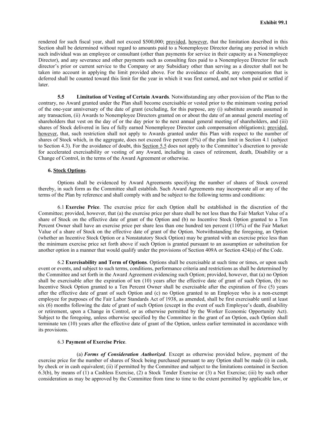 Exhibit 99.1 rendered for such fiscal year, shall not exceed $500,000; provided, however, that the limitation described in this Section shall be determined without regard to amounts paid to a Nonemployee Director during any period in which such individual was an employee or consultant (other than payments for service in their capacity as a Nonemployee Director), and any severance and other payments such as consulting fees paid to a Nonemployee Director for such director’s prior or current service to the Company or any Subsidiary other than serving as a director shall not be taken into account in applying the limit provided above. For the avoidance of doubt, any compensation that is deferred shall be counted toward this limit for the year in which it was first earned, and not when paid or settled if later. 5.5 Limitation of Vesting of Certain Awards. Notwithstanding any other provision of the Plan to the contrary, no Award granted under the Plan shall become exercisable or vested prior to the minimum vesting period of the one-year anniversary of the date of grant (excluding, for this purpose, any (i) substitute awards assumed in any transaction, (ii) Awards to Nonemployee Directors granted on or about the date of an annual general meeting of shareholders that vest on the day of or the day prior to the next annual general meeting of shareholders, and (iii) shares of Stock delivered in lieu of fully earned Nonemployee Director cash compensation obligations); provided, however, that, such restriction shall not apply to Awards granted under this Plan with respect to the number of shares of Stock which, in the aggregate, does not exceed five percent (5%) of the plan limit in Section 4.1 (subject to Section 4.3). For the avoidance of doubt, this Section 5.5 does not apply to the Committee’s discretion to provide for accelerated exercisability or vesting of any Award, including in cases of retirement, death, Disability or a Change of Control, in the terms of the Award Agreement or otherwise. 6. Stock Options. Options shall be evidenced by Award Agreements specifying the number of shares of Stock covered thereby, in such form as the Committee shall establish. Such Award Agreements may incorporate all or any of the terms of the Plan by reference and shall comply with and be subject to the following terms and conditions: 6.1 Exercise Price. The exercise price for each Option shall be established in the discretion of the Committee; provided, however, that (a) the exercise price per share shall be not less than the Fair Market Value of a share of Stock on the effective date of grant of the Option and (b) no Incentive Stock Option granted to a Ten Percent Owner shall have an exercise price per share less than one hundred ten percent (110%) of the Fair Market Value of a share of Stock on the effective date of grant of the Option. Notwithstanding the foregoing, an Option (whether an Incentive Stock Option or a Nonstatutory Stock Option) may be granted with an exercise price less than the minimum exercise price set forth above if such Option is granted pursuant to an assumption or substitution for another option in a manner that would qualify under the provisions of Section 409A or Section 424(a) of the Code. 6.2 Exercisability and Term of Options. Options shall be exercisable at such time or times, or upon such event or events, and subject to such terms, conditions, performance criteria and restrictions as shall be determined by the Committee and set forth in the Award Agreement evidencing such Option; provided, however, that (a) no Option shall be exercisable after the expiration of ten (10) years after the effective date of grant of such Option, (b) no Incentive Stock Option granted to a Ten Percent Owner shall be exercisable after the expiration of five (5) years after the effective date of grant of such Option and (c) no Option granted to an Employee who is a non-exempt employee for purposes of the Fair Labor Standards Act of 1938, as amended, shall be first exercisable until at least six (6) months following the date of grant of such Option (except in the event of such Employee’s death, disability or retirement, upon a Change in Control, or as otherwise permitted by the Worker Economic Opportunity Act). Subject to the foregoing, unless otherwise specified by the Committee in the grant of an Option, each Option shall terminate ten (10) years after the effective date of grant of the Option, unless earlier terminated in accordance with its provisions. 6.3 Payment of Exercise Price. (a) Forms of Consideration Authorized. Except as otherwise provided below, payment of the exercise price for the number of shares of Stock being purchased pursuant to any Option shall be made (i) in cash, by check or in cash equivalent; (ii) if permitted by the Committee and subject to the limitations contained in Section 6.3(b), by means of (1) a Cashless Exercise, (2) a Stock Tender Exercise or (3) a Net Exercise; (iii) by such other consideration as may be approved by the Committee from time to time to the extent permitted by applicable law, or