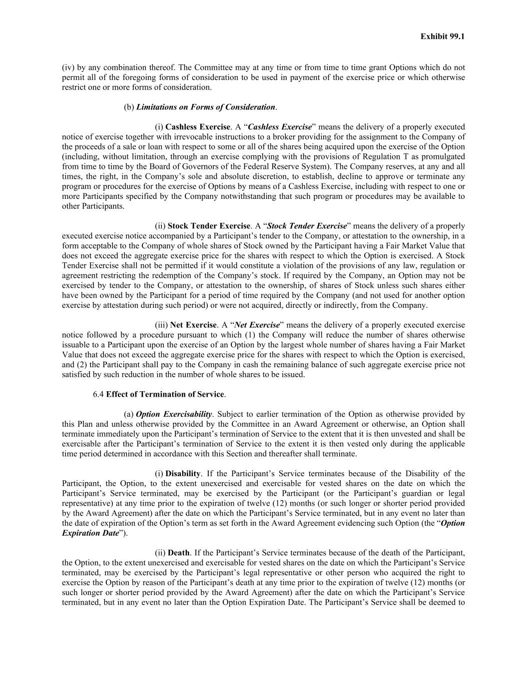 Exhibit 99.1 (iv) by any combination thereof. The Committee may at any time or from time to time grant Options which do not permit all of the foregoing forms of consideration to be used in payment of the exercise price or which otherwise restrict one or more forms of consideration. (b) Limitations on Forms of Consideration. (i) Cashless Exercise. A “Cashless Exercise” means the delivery of a properly executed notice of exercise together with irrevocable instructions to a broker providing for the assignment to the Company of the proceeds of a sale or loan with respect to some or all of the shares being acquired upon the exercise of the Option (including, without limitation, through an exercise complying with the provisions of Regulation T as promulgated from time to time by the Board of Governors of the Federal Reserve System). The Company reserves, at any and all times, the right, in the Company’s sole and absolute discretion, to establish, decline to approve or terminate any program or procedures for the exercise of Options by means of a Cashless Exercise, including with respect to one or more Participants specified by the Company notwithstanding that such program or procedures may be available to other Participants. (ii) Stock Tender Exercise. A “Stock Tender Exercise” means the delivery of a properly executed exercise notice accompanied by a Participant’s tender to the Company, or attestation to the ownership, in a form acceptable to the Company of whole shares of Stock owned by the Participant having a Fair Market Value that does not exceed the aggregate exercise price for the shares with respect to which the Option is exercised. A Stock Tender Exercise shall not be permitted if it would constitute a violation of the provisions of any law, regulation or agreement restricting the redemption of the Company’s stock. If required by the Company, an Option may not be exercised by tender to the Company, or attestation to the ownership, of shares of Stock unless such shares either have been owned by the Participant for a period of time required by the Company (and not used for another option exercise by attestation during such period) or were not acquired, directly or indirectly, from the Company. (iii) Net Exercise. A “Net Exercise” means the delivery of a properly executed exercise notice followed by a procedure pursuant to which (1) the Company will reduce the number of shares otherwise issuable to a Participant upon the exercise of an Option by the largest whole number of shares having a Fair Market Value that does not exceed the aggregate exercise price for the shares with respect to which the Option is exercised, and (2) the Participant shall pay to the Company in cash the remaining balance of such aggregate exercise price not satisfied by such reduction in the number of whole shares to be issued. 6.4 Effect of Termination of Service. (a) Option Exercisability. Subject to earlier termination of the Option as otherwise provided by this Plan and unless otherwise provided by the Committee in an Award Agreement or otherwise, an Option shall terminate immediately upon the Participant’s termination of Service to the extent that it is then unvested and shall be exercisable after the Participant’s termination of Service to the extent it is then vested only during the applicable time period determined in accordance with this Section and thereafter shall terminate. (i) Disability. If the Participant’s Service terminates because of the Disability of the Participant, the Option, to the extent unexercised and exercisable for vested shares on the date on which the Participant’s Service terminated, may be exercised by the Participant (or the Participant’s guardian or legal representative) at any time prior to the expiration of twelve (12) months (or such longer or shorter period provided by the Award Agreement) after the date on which the Participant’s Service terminated, but in any event no later than the date of expiration of the Option’s term as set forth in the Award Agreement evidencing such Option (the “Option Expiration Date”). (ii) Death. If the Participant’s Service terminates because of the death of the Participant, the Option, to the extent unexercised and exercisable for vested shares on the date on which the Participant’s Service terminated, may be exercised by the Participant’s legal representative or other person who acquired the right to exercise the Option by reason of the Participant’s death at any time prior to the expiration of twelve (12) months (or such longer or shorter period provided by the Award Agreement) after the date on which the Participant’s Service terminated, but in any event no later than the Option Expiration Date. The Participant’s Service shall be deemed to