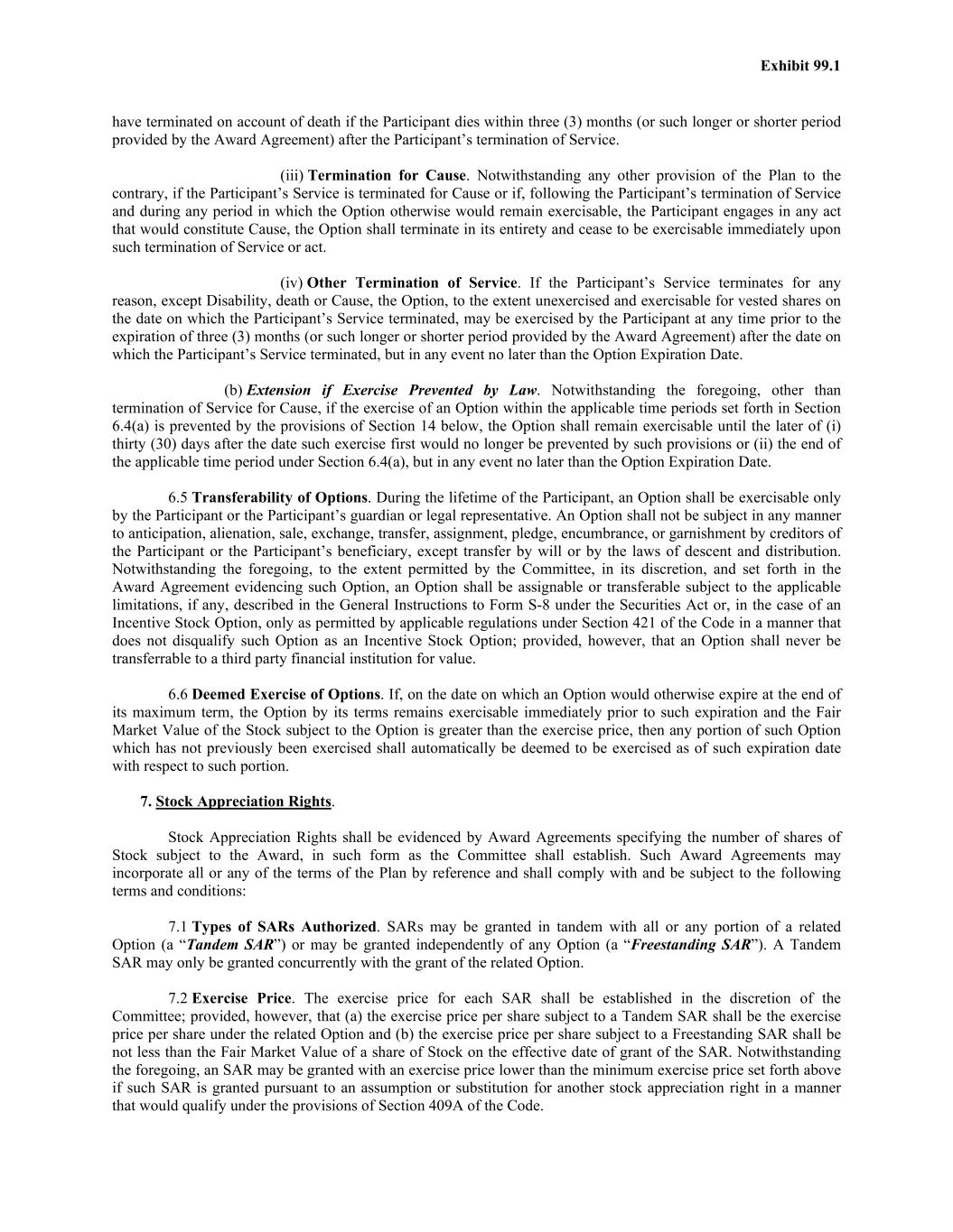 Exhibit 99.1 have terminated on account of death if the Participant dies within three (3) months (or such longer or shorter period provided by the Award Agreement) after the Participant’s termination of Service. (iii) Termination for Cause. Notwithstanding any other provision of the Plan to the contrary, if the Participant’s Service is terminated for Cause or if, following the Participant’s termination of Service and during any period in which the Option otherwise would remain exercisable, the Participant engages in any act that would constitute Cause, the Option shall terminate in its entirety and cease to be exercisable immediately upon such termination of Service or act. (iv) Other Termination of Service. If the Participant’s Service terminates for any reason, except Disability, death or Cause, the Option, to the extent unexercised and exercisable for vested shares on the date on which the Participant’s Service terminated, may be exercised by the Participant at any time prior to the expiration of three (3) months (or such longer or shorter period provided by the Award Agreement) after the date on which the Participant’s Service terminated, but in any event no later than the Option Expiration Date. (b) Extension if Exercise Prevented by Law. Notwithstanding the foregoing, other than termination of Service for Cause, if the exercise of an Option within the applicable time periods set forth in Section 6.4(a) is prevented by the provisions of Section 14 below, the Option shall remain exercisable until the later of (i) thirty (30) days after the date such exercise first would no longer be prevented by such provisions or (ii) the end of the applicable time period under Section 6.4(a), but in any event no later than the Option Expiration Date. 6.5 Transferability of Options. During the lifetime of the Participant, an Option shall be exercisable only by the Participant or the Participant’s guardian or legal representative. An Option shall not be subject in any manner to anticipation, alienation, sale, exchange, transfer, assignment, pledge, encumbrance, or garnishment by creditors of the Participant or the Participant’s beneficiary, except transfer by will or by the laws of descent and distribution. Notwithstanding the foregoing, to the extent permitted by the Committee, in its discretion, and set forth in the Award Agreement evidencing such Option, an Option shall be assignable or transferable subject to the applicable limitations, if any, described in the General Instructions to Form S-8 under the Securities Act or, in the case of an Incentive Stock Option, only as permitted by applicable regulations under Section 421 of the Code in a manner that does not disqualify such Option as an Incentive Stock Option; provided, however, that an Option shall never be transferrable to a third party financial institution for value. 6.6 Deemed Exercise of Options. If, on the date on which an Option would otherwise expire at the end of its maximum term, the Option by its terms remains exercisable immediately prior to such expiration and the Fair Market Value of the Stock subject to the Option is greater than the exercise price, then any portion of such Option which has not previously been exercised shall automatically be deemed to be exercised as of such expiration date with respect to such portion. 7. Stock Appreciation Rights. Stock Appreciation Rights shall be evidenced by Award Agreements specifying the number of shares of Stock subject to the Award, in such form as the Committee shall establish. Such Award Agreements may incorporate all or any of the terms of the Plan by reference and shall comply with and be subject to the following terms and conditions: 7.1 Types of SARs Authorized. SARs may be granted in tandem with all or any portion of a related Option (a “Tandem SAR”) or may be granted independently of any Option (a “Freestanding SAR”). A Tandem SAR may only be granted concurrently with the grant of the related Option. 7.2 Exercise Price. The exercise price for each SAR shall be established in the discretion of the Committee; provided, however, that (a) the exercise price per share subject to a Tandem SAR shall be the exercise price per share under the related Option and (b) the exercise price per share subject to a Freestanding SAR shall be not less than the Fair Market Value of a share of Stock on the effective date of grant of the SAR. Notwithstanding the foregoing, an SAR may be granted with an exercise price lower than the minimum exercise price set forth above if such SAR is granted pursuant to an assumption or substitution for another stock appreciation right in a manner that would qualify under the provisions of Section 409A of the Code.