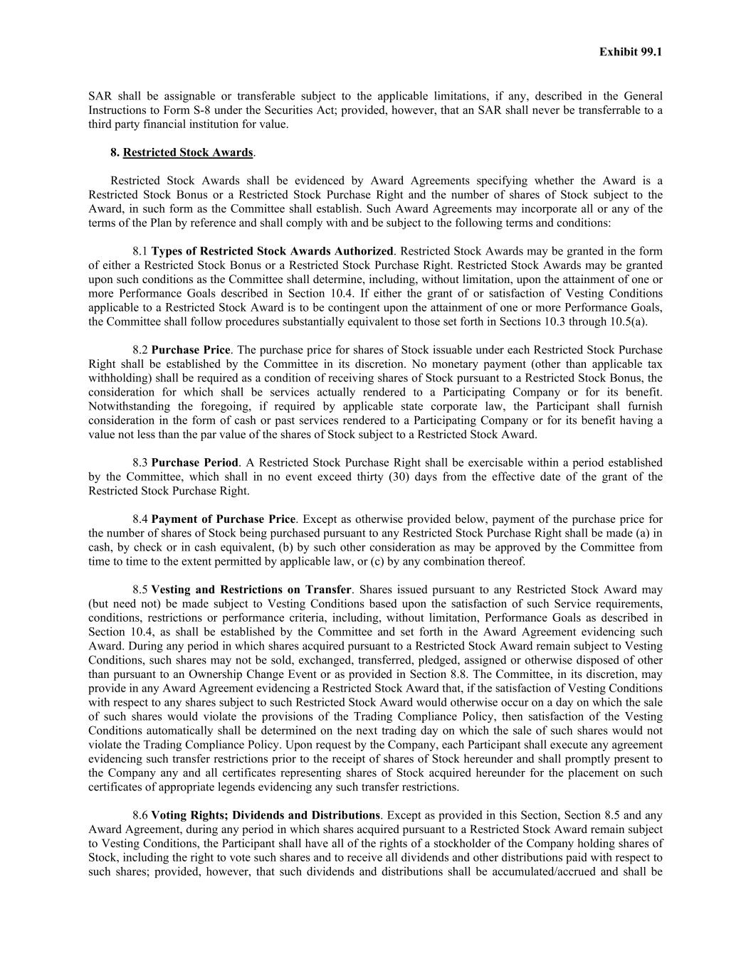 Exhibit 99.1 SAR shall be assignable or transferable subject to the applicable limitations, if any, described in the General Instructions to Form S-8 under the Securities Act; provided, however, that an SAR shall never be transferrable to a third party financial institution for value. 8. Restricted Stock Awards. Restricted Stock Awards shall be evidenced by Award Agreements specifying whether the Award is a Restricted Stock Bonus or a Restricted Stock Purchase Right and the number of shares of Stock subject to the Award, in such form as the Committee shall establish. Such Award Agreements may incorporate all or any of the terms of the Plan by reference and shall comply with and be subject to the following terms and conditions: 8.1 Types of Restricted Stock Awards Authorized. Restricted Stock Awards may be granted in the form of either a Restricted Stock Bonus or a Restricted Stock Purchase Right. Restricted Stock Awards may be granted upon such conditions as the Committee shall determine, including, without limitation, upon the attainment of one or more Performance Goals described in Section 10.4. If either the grant of or satisfaction of Vesting Conditions applicable to a Restricted Stock Award is to be contingent upon the attainment of one or more Performance Goals, the Committee shall follow procedures substantially equivalent to those set forth in Sections 10.3 through 10.5(a). 8.2 Purchase Price. The purchase price for shares of Stock issuable under each Restricted Stock Purchase Right shall be established by the Committee in its discretion. No monetary payment (other than applicable tax withholding) shall be required as a condition of receiving shares of Stock pursuant to a Restricted Stock Bonus, the consideration for which shall be services actually rendered to a Participating Company or for its benefit. Notwithstanding the foregoing, if required by applicable state corporate law, the Participant shall furnish consideration in the form of cash or past services rendered to a Participating Company or for its benefit having a value not less than the par value of the shares of Stock subject to a Restricted Stock Award. 8.3 Purchase Period. A Restricted Stock Purchase Right shall be exercisable within a period established by the Committee, which shall in no event exceed thirty (30) days from the effective date of the grant of the Restricted Stock Purchase Right. 8.4 Payment of Purchase Price. Except as otherwise provided below, payment of the purchase price for the number of shares of Stock being purchased pursuant to any Restricted Stock Purchase Right shall be made (a) in cash, by check or in cash equivalent, (b) by such other consideration as may be approved by the Committee from time to time to the extent permitted by applicable law, or (c) by any combination thereof. 8.5 Vesting and Restrictions on Transfer. Shares issued pursuant to any Restricted Stock Award may (but need not) be made subject to Vesting Conditions based upon the satisfaction of such Service requirements, conditions, restrictions or performance criteria, including, without limitation, Performance Goals as described in Section 10.4, as shall be established by the Committee and set forth in the Award Agreement evidencing such Award. During any period in which shares acquired pursuant to a Restricted Stock Award remain subject to Vesting Conditions, such shares may not be sold, exchanged, transferred, pledged, assigned or otherwise disposed of other than pursuant to an Ownership Change Event or as provided in Section 8.8. The Committee, in its discretion, may provide in any Award Agreement evidencing a Restricted Stock Award that, if the satisfaction of Vesting Conditions with respect to any shares subject to such Restricted Stock Award would otherwise occur on a day on which the sale of such shares would violate the provisions of the Trading Compliance Policy, then satisfaction of the Vesting Conditions automatically shall be determined on the next trading day on which the sale of such shares would not violate the Trading Compliance Policy. Upon request by the Company, each Participant shall execute any agreement evidencing such transfer restrictions prior to the receipt of shares of Stock hereunder and shall promptly present to the Company any and all certificates representing shares of Stock acquired hereunder for the placement on such certificates of appropriate legends evidencing any such transfer restrictions. 8.6 Voting Rights; Dividends and Distributions. Except as provided in this Section, Section 8.5 and any Award Agreement, during any period in which shares acquired pursuant to a Restricted Stock Award remain subject to Vesting Conditions, the Participant shall have all of the rights of a stockholder of the Company holding shares of Stock, including the right to vote such shares and to receive all dividends and other distributions paid with respect to such shares; provided, however, that such dividends and distributions shall be accumulated/accrued and shall be