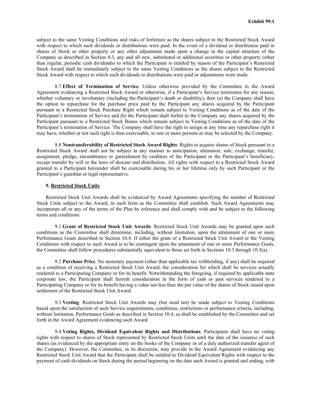 Exhibit 99.1 subject to the same Vesting Conditions and risks of forfeiture as the shares subject to the Restricted Stock Award with respect to which such dividends or distributions were paid. In the event of a dividend or distribution paid in shares of Stock or other property or any other adjustment made upon a change in the capital structure of the Company as described in Section 4.3, any and all new, substituted or additional securities or other property (other than regular, periodic cash dividends) to which the Participant is entitled by reason of the Participant’s Restricted Stock Award shall be immediately subject to the same Vesting Conditions as the shares subject to the Restricted Stock Award with respect to which such dividends or distributions were paid or adjustments were made. 8.7 Effect of Termination of Service. Unless otherwise provided by the Committee in the Award Agreement evidencing a Restricted Stock Award or otherwise, if a Participant’s Service terminates for any reason, whether voluntary or involuntary (including the Participant’s death or disability), then (a) the Company shall have the option to repurchase for the purchase price paid by the Participant any shares acquired by the Participant pursuant to a Restricted Stock Purchase Right which remain subject to Vesting Conditions as of the date of the Participant’s termination of Service and (b) the Participant shall forfeit to the Company any shares acquired by the Participant pursuant to a Restricted Stock Bonus which remain subject to Vesting Conditions as of the date of the Participant’s termination of Service. The Company shall have the right to assign at any time any repurchase right it may have, whether or not such right is then exercisable, to one or more persons as may be selected by the Company. 8.8 Nontransferability of Restricted Stock Award Rights. Rights to acquire shares of Stock pursuant to a Restricted Stock Award shall not be subject in any manner to anticipation, alienation, sale, exchange, transfer, assignment, pledge, encumbrance or garnishment by creditors of the Participant or the Participant’s beneficiary, except transfer by will or the laws of descent and distribution. All rights with respect to a Restricted Stock Award granted to a Participant hereunder shall be exercisable during his or her lifetime only by such Participant or the Participant’s guardian or legal representative. 9. Restricted Stock Units. Restricted Stock Unit Awards shall be evidenced by Award Agreements specifying the number of Restricted Stock Units subject to the Award, in such form as the Committee shall establish. Such Award Agreements may incorporate all or any of the terms of the Plan by reference and shall comply with and be subject to the following terms and conditions: 9.1 Grant of Restricted Stock Unit Awards. Restricted Stock Unit Awards may be granted upon such conditions as the Committee shall determine, including, without limitation, upon the attainment of one or more Performance Goals described in Section 10.4. If either the grant of a Restricted Stock Unit Award or the Vesting Conditions with respect to such Award is to be contingent upon the attainment of one or more Performance Goals, the Committee shall follow procedures substantially equivalent to those set forth in Sections 10.3 through 10.5(a). 9.2 Purchase Price. No monetary payment (other than applicable tax withholding, if any) shall be required as a condition of receiving a Restricted Stock Unit Award, the consideration for which shall be services actually rendered to a Participating Company or for its benefit. Notwithstanding the foregoing, if required by applicable state corporate law, the Participant shall furnish consideration in the form of cash or past services rendered to a Participating Company or for its benefit having a value not less than the par value of the shares of Stock issued upon settlement of the Restricted Stock Unit Award. 9.3 Vesting. Restricted Stock Unit Awards may (but need not) be made subject to Vesting Conditions based upon the satisfaction of such Service requirements, conditions, restrictions or performance criteria, including, without limitation, Performance Goals as described in Section 10.4, as shall be established by the Committee and set forth in the Award Agreement evidencing such Award. 9.4 Voting Rights, Dividend Equivalent Rights and Distributions. Participants shall have no voting rights with respect to shares of Stock represented by Restricted Stock Units until the date of the issuance of such shares (as evidenced by the appropriate entry on the books of the Company or of a duly authorized transfer agent of the Company). However, the Committee, in its discretion, may provide in the Award Agreement evidencing any Restricted Stock Unit Award that the Participant shall be entitled to Dividend Equivalent Rights with respect to the payment of cash dividends on Stock during the period beginning on the date such Award is granted and ending, with