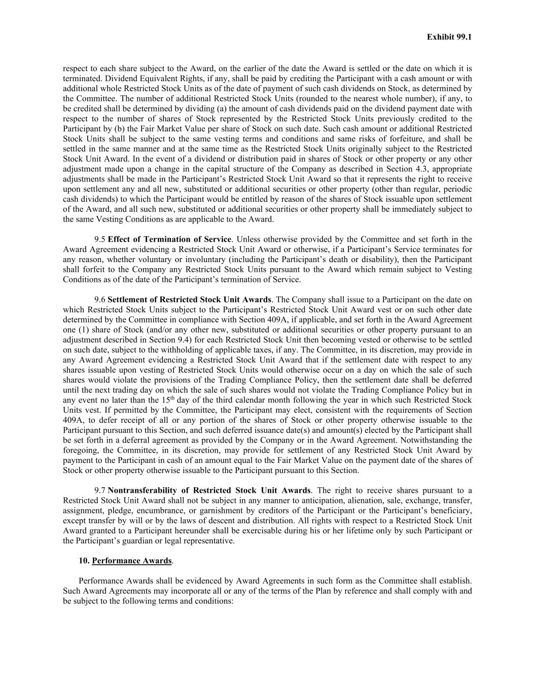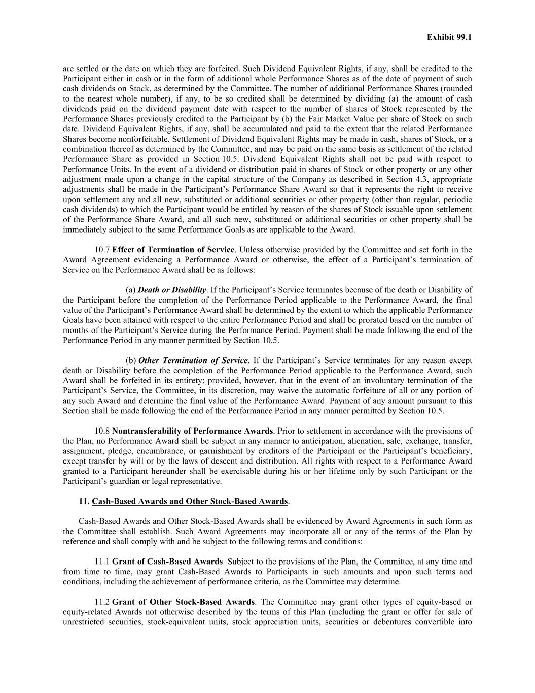 Exhibit 99.1 are settled or the date on which they are forfeited. Such Dividend Equivalent Rights, if any, shall be credited to the Participant either in cash or in the form of additional whole Performance Shares as of the date of payment of such cash dividends on Stock, as determined by the Committee. The number of additional Performance Shares (rounded to the nearest whole number), if any, to be so credited shall be determined by dividing (a) the amount of cash dividends paid on the dividend payment date with respect to the number of shares of Stock represented by the Performance Shares previously credited to the Participant by (b) the Fair Market Value per share of Stock on such date. Dividend Equivalent Rights, if any, shall be accumulated and paid to the extent that the related Performance Shares become nonforfeitable. Settlement of Dividend Equivalent Rights may be made in cash, shares of Stock, or a combination thereof as determined by the Committee, and may be paid on the same basis as settlement of the related Performance Share as provided in Section 10.5. Dividend Equivalent Rights shall not be paid with respect to Performance Units. In the event of a dividend or distribution paid in shares of Stock or other property or any other adjustment made upon a change in the capital structure of the Company as described in Section 4.3, appropriate adjustments shall be made in the Participant’s Performance Share Award so that it represents the right to receive upon settlement any and all new, substituted or additional securities or other property (other than regular, periodic cash dividends) to which the Participant would be entitled by reason of the shares of Stock issuable upon settlement of the Performance Share Award, and all such new, substituted or additional securities or other property shall be immediately subject to the same Performance Goals as are applicable to the Award. 10.7 Effect of Termination of Service. Unless otherwise provided by the Committee and set forth in the Award Agreement evidencing a Performance Award or otherwise, the effect of a Participant’s termination of Service on the Performance Award shall be as follows: (a) Death or Disability. If the Participant’s Service terminates because of the death or Disability of the Participant before the completion of the Performance Period applicable to the Performance Award, the final value of the Participant’s Performance Award shall be determined by the extent to which the applicable Performance Goals have been attained with respect to the entire Performance Period and shall be prorated based on the number of months of the Participant’s Service during the Performance Period. Payment shall be made following the end of the Performance Period in any manner permitted by Section 10.5. (b) Other Termination of Service. If the Participant’s Service terminates for any reason except death or Disability before the completion of the Performance Period applicable to the Performance Award, such Award shall be forfeited in its entirety; provided, however, that in the event of an involuntary termination of the Participant’s Service, the Committee, in its discretion, may waive the automatic forfeiture of all or any portion of any such Award and determine the final value of the Performance Award. Payment of any amount pursuant to this Section shall be made following the end of the Performance Period in any manner permitted by Section 10.5. 10.8 Nontransferability of Performance Awards. Prior to settlement in accordance with the provisions of the Plan, no Performance Award shall be subject in any manner to anticipation, alienation, sale, exchange, transfer, assignment, pledge, encumbrance, or garnishment by creditors of the Participant or the Participant’s beneficiary, except transfer by will or by the laws of descent and distribution. All rights with respect to a Performance Award granted to a Participant hereunder shall be exercisable during his or her lifetime only by such Participant or the Participant’s guardian or legal representative. 11. Cash-Based Awards and Other Stock-Based Awards. Cash-Based Awards and Other Stock-Based Awards shall be evidenced by Award Agreements in such form as the Committee shall establish. Such Award Agreements may incorporate all or any of the terms of the Plan by reference and shall comply with and be subject to the following terms and conditions: 11.1 Grant of Cash-Based Awards. Subject to the provisions of the Plan, the Committee, at any time and from time to time, may grant Cash-Based Awards to Participants in such amounts and upon such terms and conditions, including the achievement of performance criteria, as the Committee may determine. 11.2 Grant of Other Stock-Based Awards. The Committee may grant other types of equity-based or equity-related Awards not otherwise described by the terms of this Plan (including the grant or offer for sale of unrestricted securities, stock-equivalent units, stock appreciation units, securities or debentures convertible into