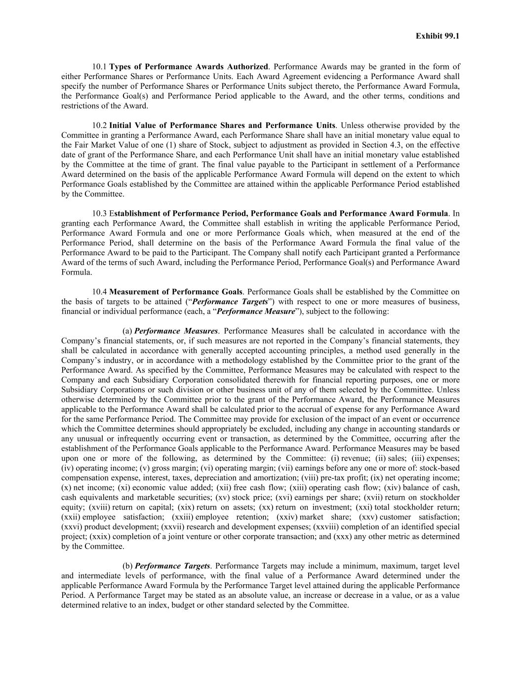 Exhibit 99.1 10.1 Types of Performance Awards Authorized. Performance Awards may be granted in the form of either Performance Shares or Performance Units. Each Award Agreement evidencing a Performance Award shall specify the number of Performance Shares or Performance Units subject thereto, the Performance Award Formula, the Performance Goal(s) and Performance Period applicable to the Award, and the other terms, conditions and restrictions of the Award. 10.2 Initial Value of Performance Shares and Performance Units. Unless otherwise provided by the Committee in granting a Performance Award, each Performance Share shall have an initial monetary value equal to the Fair Market Value of one (1) share of Stock, subject to adjustment as provided in Section 4.3, on the effective date of grant of the Performance Share, and each Performance Unit shall have an initial monetary value established by the Committee at the time of grant. The final value payable to the Participant in settlement of a Performance Award determined on the basis of the applicable Performance Award Formula will depend on the extent to which Performance Goals established by the Committee are attained within the applicable Performance Period established by the Committee. 10.3 Establishment of Performance Period, Performance Goals and Performance Award Formula. In granting each Performance Award, the Committee shall establish in writing the applicable Performance Period, Performance Award Formula and one or more Performance Goals which, when measured at the end of the Performance Period, shall determine on the basis of the Performance Award Formula the final value of the Performance Award to be paid to the Participant. The Company shall notify each Participant granted a Performance Award of the terms of such Award, including the Performance Period, Performance Goal(s) and Performance Award Formula. 10.4 Measurement of Performance Goals. Performance Goals shall be established by the Committee on the basis of targets to be attained (“Performance Targets”) with respect to one or more measures of business, financial or individual performance (each, a “Performance Measure”), subject to the following: (a) Performance Measures. Performance Measures shall be calculated in accordance with the Company’s financial statements, or, if such measures are not reported in the Company’s financial statements, they shall be calculated in accordance with generally accepted accounting principles, a method used generally in the Company’s industry, or in accordance with a methodology established by the Committee prior to the grant of the Performance Award. As specified by the Committee, Performance Measures may be calculated with respect to the Company and each Subsidiary Corporation consolidated therewith for financial reporting purposes, one or more Subsidiary Corporations or such division or other business unit of any of them selected by the Committee. Unless otherwise determined by the Committee prior to the grant of the Performance Award, the Performance Measures applicable to the Performance Award shall be calculated prior to the accrual of expense for any Performance Award for the same Performance Period. The Committee may provide for exclusion of the impact of an event or occurrence which the Committee determines should appropriately be excluded, including any change in accounting standards or any unusual or infrequently occurring event or transaction, as determined by the Committee, occurring after the establishment of the Performance Goals applicable to the Performance Award. Performance Measures may be based upon one or more of the following, as determined by the Committee: (i) revenue; (ii) sales; (iii) expenses; (iv) operating income; (v) gross margin; (vi) operating margin; (vii) earnings before any one or more of: stock-based compensation expense, interest, taxes, depreciation and amortization; (viii) pre-tax profit; (ix) net operating income; (x) net income; (xi) economic value added; (xii) free cash flow; (xiii) operating cash flow; (xiv) balance of cash, cash equivalents and marketable securities; (xv) stock price; (xvi) earnings per share; (xvii) return on stockholder equity; (xviii) return on capital; (xix) return on assets; (xx) return on investment; (xxi) total stockholder return; (xxii) employee satisfaction; (xxiii) employee retention; (xxiv) market share; (xxv) customer satisfaction; (xxvi) product development; (xxvii) research and development expenses; (xxviii) completion of an identified special project; (xxix) completion of a joint venture or other corporate transaction; and (xxx) any other metric as determined by the Committee. (b) Performance Targets. Performance Targets may include a minimum, maximum, target level and intermediate levels of performance, with the final value of a Performance Award determined under the applicable Performance Award Formula by the Performance Target level attained during the applicable Performance Period. A Performance Target may be stated as an absolute value, an increase or decrease in a value, or as a value determined relative to an index, budget or other standard selected by the Committee.
