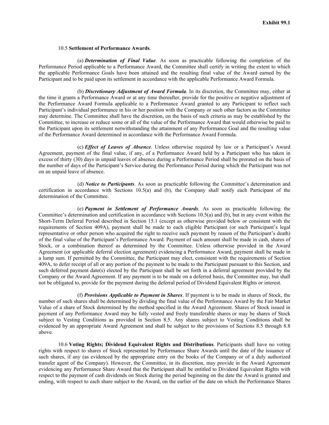 Exhibit 99.1 10.5 Settlement of Performance Awards. (a) Determination of Final Value. As soon as practicable following the completion of the Performance Period applicable to a Performance Award, the Committee shall certify in writing the extent to which the applicable Performance Goals have been attained and the resulting final value of the Award earned by the Participant and to be paid upon its settlement in accordance with the applicable Performance Award Formula. (b) Discretionary Adjustment of Award Formula. In its discretion, the Committee may, either at the time it grants a Performance Award or at any time thereafter, provide for the positive or negative adjustment of the Performance Award Formula applicable to a Performance Award granted to any Participant to reflect such Participant’s individual performance in his or her position with the Company or such other factors as the Committee may determine. The Committee shall have the discretion, on the basis of such criteria as may be established by the Committee, to increase or reduce some or all of the value of the Performance Award that would otherwise be paid to the Participant upon its settlement notwithstanding the attainment of any Performance Goal and the resulting value of the Performance Award determined in accordance with the Performance Award Formula. (c) Effect of Leaves of Absence. Unless otherwise required by law or a Participant’s Award Agreement, payment of the final value, if any, of a Performance Award held by a Participant who has taken in excess of thirty (30) days in unpaid leaves of absence during a Performance Period shall be prorated on the basis of the number of days of the Participant’s Service during the Performance Period during which the Participant was not on an unpaid leave of absence. (d) Notice to Participants. As soon as practicable following the Committee’s determination and certification in accordance with Sections 10.5(a) and (b), the Company shall notify each Participant of the determination of the Committee. (e) Payment in Settlement of Performance Awards. As soon as practicable following the Committee’s determination and certification in accordance with Sections 10.5(a) and (b), but in any event within the Short-Term Deferral Period described in Section 15.1 (except as otherwise provided below or consistent with the requirements of Section 409A), payment shall be made to each eligible Participant (or such Participant’s legal representative or other person who acquired the right to receive such payment by reason of the Participant’s death) of the final value of the Participant’s Performance Award. Payment of such amount shall be made in cash, shares of Stock, or a combination thereof as determined by the Committee. Unless otherwise provided in the Award Agreement (or applicable deferral election agreement) evidencing a Performance Award, payment shall be made in a lump sum. If permitted by the Committee, the Participant may elect, consistent with the requirements of Section 409A, to defer receipt of all or any portion of the payment to be made to the Participant pursuant to this Section, and such deferred payment date(s) elected by the Participant shall be set forth in a deferral agreement provided by the Company or the Award Agreement. If any payment is to be made on a deferred basis, the Committee may, but shall not be obligated to, provide for the payment during the deferral period of Dividend Equivalent Rights or interest. (f) Provisions Applicable to Payment in Shares. If payment is to be made in shares of Stock, the number of such shares shall be determined by dividing the final value of the Performance Award by the Fair Market Value of a share of Stock determined by the method specified in the Award Agreement. Shares of Stock issued in payment of any Performance Award may be fully vested and freely transferable shares or may be shares of Stock subject to Vesting Conditions as provided in Section 8.5. Any shares subject to Vesting Conditions shall be evidenced by an appropriate Award Agreement and shall be subject to the provisions of Sections 8.5 through 8.8 above. 10.6 Voting Rights; Dividend Equivalent Rights and Distributions. Participants shall have no voting rights with respect to shares of Stock represented by Performance Share Awards until the date of the issuance of such shares, if any (as evidenced by the appropriate entry on the books of the Company or of a duly authorized transfer agent of the Company). However, the Committee, in its discretion, may provide in the Award Agreement evidencing any Performance Share Award that the Participant shall be entitled to Dividend Equivalent Rights with respect to the payment of cash dividends on Stock during the period beginning on the date the Award is granted and ending, with respect to each share subject to the Award, on the earlier of the date on which the Performance Shares