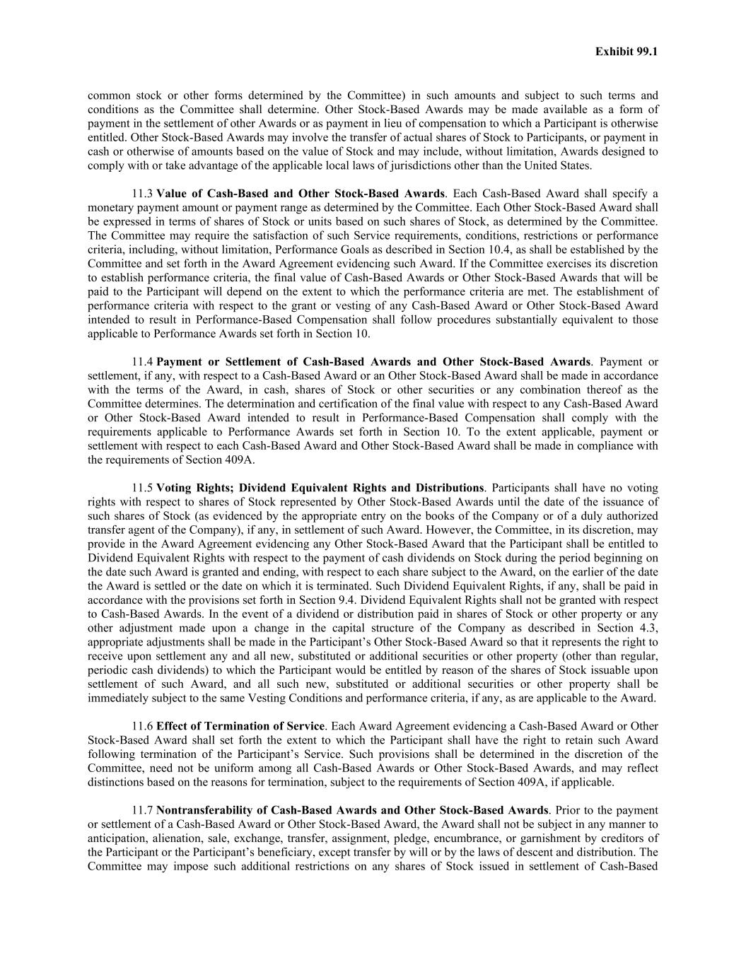 Exhibit 99.1 common stock or other forms determined by the Committee) in such amounts and subject to such terms and conditions as the Committee shall determine. Other Stock-Based Awards may be made available as a form of payment in the settlement of other Awards or as payment in lieu of compensation to which a Participant is otherwise entitled. Other Stock-Based Awards may involve the transfer of actual shares of Stock to Participants, or payment in cash or otherwise of amounts based on the value of Stock and may include, without limitation, Awards designed to comply with or take advantage of the applicable local laws of jurisdictions other than the United States. 11.3 Value of Cash-Based and Other Stock-Based Awards. Each Cash-Based Award shall specify a monetary payment amount or payment range as determined by the Committee. Each Other Stock-Based Award shall be expressed in terms of shares of Stock or units based on such shares of Stock, as determined by the Committee. The Committee may require the satisfaction of such Service requirements, conditions, restrictions or performance criteria, including, without limitation, Performance Goals as described in Section 10.4, as shall be established by the Committee and set forth in the Award Agreement evidencing such Award. If the Committee exercises its discretion to establish performance criteria, the final value of Cash-Based Awards or Other Stock-Based Awards that will be paid to the Participant will depend on the extent to which the performance criteria are met. The establishment of performance criteria with respect to the grant or vesting of any Cash-Based Award or Other Stock-Based Award intended to result in Performance-Based Compensation shall follow procedures substantially equivalent to those applicable to Performance Awards set forth in Section 10. 11.4 Payment or Settlement of Cash-Based Awards and Other Stock-Based Awards. Payment or settlement, if any, with respect to a Cash-Based Award or an Other Stock-Based Award shall be made in accordance with the terms of the Award, in cash, shares of Stock or other securities or any combination thereof as the Committee determines. The determination and certification of the final value with respect to any Cash-Based Award or Other Stock-Based Award intended to result in Performance-Based Compensation shall comply with the requirements applicable to Performance Awards set forth in Section 10. To the extent applicable, payment or settlement with respect to each Cash-Based Award and Other Stock-Based Award shall be made in compliance with the requirements of Section 409A. 11.5 Voting Rights; Dividend Equivalent Rights and Distributions. Participants shall have no voting rights with respect to shares of Stock represented by Other Stock-Based Awards until the date of the issuance of such shares of Stock (as evidenced by the appropriate entry on the books of the Company or of a duly authorized transfer agent of the Company), if any, in settlement of such Award. However, the Committee, in its discretion, may provide in the Award Agreement evidencing any Other Stock-Based Award that the Participant shall be entitled to Dividend Equivalent Rights with respect to the payment of cash dividends on Stock during the period beginning on the date such Award is granted and ending, with respect to each share subject to the Award, on the earlier of the date the Award is settled or the date on which it is terminated. Such Dividend Equivalent Rights, if any, shall be paid in accordance with the provisions set forth in Section 9.4. Dividend Equivalent Rights shall not be granted with respect to Cash-Based Awards. In the event of a dividend or distribution paid in shares of Stock or other property or any other adjustment made upon a change in the capital structure of the Company as described in Section 4.3, appropriate adjustments shall be made in the Participant’s Other Stock-Based Award so that it represents the right to receive upon settlement any and all new, substituted or additional securities or other property (other than regular, periodic cash dividends) to which the Participant would be entitled by reason of the shares of Stock issuable upon settlement of such Award, and all such new, substituted or additional securities or other property shall be immediately subject to the same Vesting Conditions and performance criteria, if any, as are applicable to the Award. 11.6 Effect of Termination of Service. Each Award Agreement evidencing a Cash-Based Award or Other Stock-Based Award shall set forth the extent to which the Participant shall have the right to retain such Award following termination of the Participant’s Service. Such provisions shall be determined in the discretion of the Committee, need not be uniform among all Cash-Based Awards or Other Stock-Based Awards, and may reflect distinctions based on the reasons for termination, subject to the requirements of Section 409A, if applicable. 11.7 Nontransferability of Cash-Based Awards and Other Stock-Based Awards. Prior to the payment or settlement of a Cash-Based Award or Other Stock-Based Award, the Award shall not be subject in any manner to anticipation, alienation, sale, exchange, transfer, assignment, pledge, encumbrance, or garnishment by creditors of the Participant or the Participant’s beneficiary, except transfer by will or by the laws of descent and distribution. The Committee may impose such additional restrictions on any shares of Stock issued in settlement of Cash-Based
