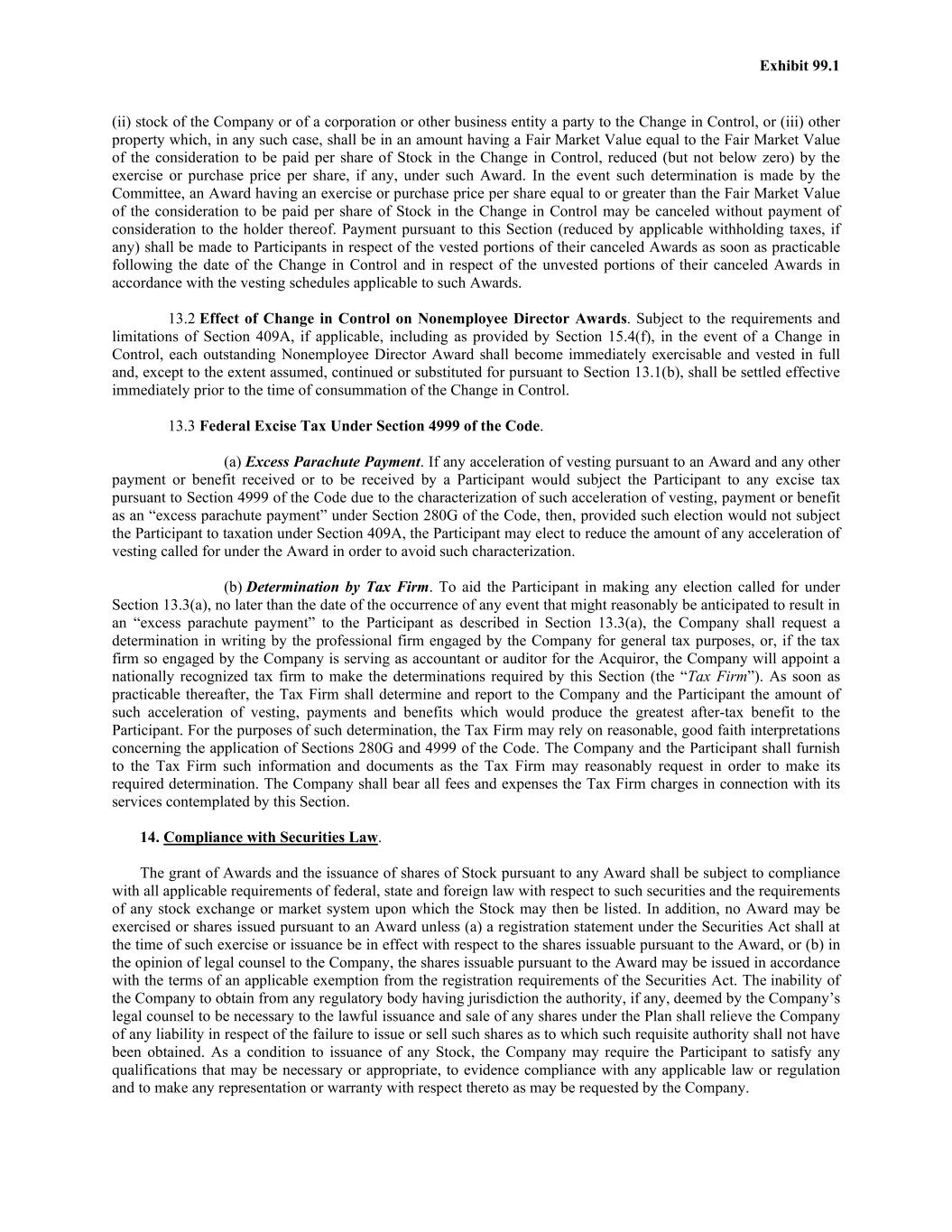 Exhibit 99.1 (ii) stock of the Company or of a corporation or other business entity a party to the Change in Control, or (iii) other property which, in any such case, shall be in an amount having a Fair Market Value equal to the Fair Market Value of the consideration to be paid per share of Stock in the Change in Control, reduced (but not below zero) by the exercise or purchase price per share, if any, under such Award. In the event such determination is made by the Committee, an Award having an exercise or purchase price per share equal to or greater than the Fair Market Value of the consideration to be paid per share of Stock in the Change in Control may be canceled without payment of consideration to the holder thereof. Payment pursuant to this Section (reduced by applicable withholding taxes, if any) shall be made to Participants in respect of the vested portions of their canceled Awards as soon as practicable following the date of the Change in Control and in respect of the unvested portions of their canceled Awards in accordance with the vesting schedules applicable to such Awards. 13.2 Effect of Change in Control on Nonemployee Director Awards. Subject to the requirements and limitations of Section 409A, if applicable, including as provided by Section 15.4(f), in the event of a Change in Control, each outstanding Nonemployee Director Award shall become immediately exercisable and vested in full and, except to the extent assumed, continued or substituted for pursuant to Section 13.1(b), shall be settled effective immediately prior to the time of consummation of the Change in Control. 13.3 Federal Excise Tax Under Section 4999 of the Code. (a) Excess Parachute Payment. If any acceleration of vesting pursuant to an Award and any other payment or benefit received or to be received by a Participant would subject the Participant to any excise tax pursuant to Section 4999 of the Code due to the characterization of such acceleration of vesting, payment or benefit as an “excess parachute payment” under Section 280G of the Code, then, provided such election would not subject the Participant to taxation under Section 409A, the Participant may elect to reduce the amount of any acceleration of vesting called for under the Award in order to avoid such characterization. (b) Determination by Tax Firm. To aid the Participant in making any election called for under Section 13.3(a), no later than the date of the occurrence of any event that might reasonably be anticipated to result in an “excess parachute payment” to the Participant as described in Section 13.3(a), the Company shall request a determination in writing by the professional firm engaged by the Company for general tax purposes, or, if the tax firm so engaged by the Company is serving as accountant or auditor for the Acquiror, the Company will appoint a nationally recognized tax firm to make the determinations required by this Section (the “Tax Firm”). As soon as practicable thereafter, the Tax Firm shall determine and report to the Company and the Participant the amount of such acceleration of vesting, payments and benefits which would produce the greatest after-tax benefit to the Participant. For the purposes of such determination, the Tax Firm may rely on reasonable, good faith interpretations concerning the application of Sections 280G and 4999 of the Code. The Company and the Participant shall furnish to the Tax Firm such information and documents as the Tax Firm may reasonably request in order to make its required determination. The Company shall bear all fees and expenses the Tax Firm charges in connection with its services contemplated by this Section. 14. Compliance with Securities Law. The grant of Awards and the issuance of shares of Stock pursuant to any Award shall be subject to compliance with all applicable requirements of federal, state and foreign law with respect to such securities and the requirements of any stock exchange or market system upon which the Stock may then be listed. In addition, no Award may be exercised or shares issued pursuant to an Award unless (a) a registration statement under the Securities Act shall at the time of such exercise or issuance be in effect with respect to the shares issuable pursuant to the Award, or (b) in the opinion of legal counsel to the Company, the shares issuable pursuant to the Award may be issued in accordance with the terms of an applicable exemption from the registration requirements of the Securities Act. The inability of the Company to obtain from any regulatory body having jurisdiction the authority, if any, deemed by the Company’s legal counsel to be necessary to the lawful issuance and sale of any shares under the Plan shall relieve the Company of any liability in respect of the failure to issue or sell such shares as to which such requisite authority shall not have been obtained. As a condition to issuance of any Stock, the Company may require the Participant to satisfy any qualifications that may be necessary or appropriate, to evidence compliance with any applicable law or regulation and to make any representation or warranty with respect thereto as may be requested by the Company.