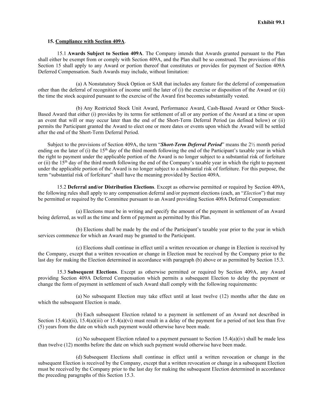Exhibit 99.1 15. Compliance with Section 409A. 15.1 Awards Subject to Section 409A. The Company intends that Awards granted pursuant to the Plan shall either be exempt from or comply with Section 409A, and the Plan shall be so construed. The provisions of this Section 15 shall apply to any Award or portion thereof that constitutes or provides for payment of Section 409A Deferred Compensation. Such Awards may include, without limitation: (a) A Nonstatutory Stock Option or SAR that includes any feature for the deferral of compensation other than the deferral of recognition of income until the later of (i) the exercise or disposition of the Award or (ii) the time the stock acquired pursuant to the exercise of the Award first becomes substantially vested. (b) Any Restricted Stock Unit Award, Performance Award, Cash-Based Award or Other Stock- Based Award that either (i) provides by its terms for settlement of all or any portion of the Award at a time or upon an event that will or may occur later than the end of the Short-Term Deferral Period (as defined below) or (ii) permits the Participant granted the Award to elect one or more dates or events upon which the Award will be settled after the end of the Short-Term Deferral Period. Subject to the provisions of Section 409A, the term “Short-Term Deferral Period” means the 2½ month period ending on the later of (i) the 15th day of the third month following the end of the Participant’s taxable year in which the right to payment under the applicable portion of the Award is no longer subject to a substantial risk of forfeiture or (ii) the 15th day of the third month following the end of the Company’s taxable year in which the right to payment under the applicable portion of the Award is no longer subject to a substantial risk of forfeiture. For this purpose, the term “substantial risk of forfeiture” shall have the meaning provided by Section 409A. 15.2 Deferral and/or Distribution Elections. Except as otherwise permitted or required by Section 409A, the following rules shall apply to any compensation deferral and/or payment elections (each, an “Election”) that may be permitted or required by the Committee pursuant to an Award providing Section 409A Deferred Compensation: (a) Elections must be in writing and specify the amount of the payment in settlement of an Award being deferred, as well as the time and form of payment as permitted by this Plan. (b) Elections shall be made by the end of the Participant’s taxable year prior to the year in which services commence for which an Award may be granted to the Participant. (c) Elections shall continue in effect until a written revocation or change in Election is received by the Company, except that a written revocation or change in Election must be received by the Company prior to the last day for making the Election determined in accordance with paragraph (b) above or as permitted by Section 15.3. 15.3 Subsequent Elections. Except as otherwise permitted or required by Section 409A, any Award providing Section 409A Deferred Compensation which permits a subsequent Election to delay the payment or change the form of payment in settlement of such Award shall comply with the following requirements: (a) No subsequent Election may take effect until at least twelve (12) months after the date on which the subsequent Election is made. (b) Each subsequent Election related to a payment in settlement of an Award not described in Section 15.4(a)(ii), 15.4(a)(iii) or 15.4(a)(vi) must result in a delay of the payment for a period of not less than five (5) years from the date on which such payment would otherwise have been made. (c) No subsequent Election related to a payment pursuant to Section 15.4(a)(iv) shall be made less than twelve (12) months before the date on which such payment would otherwise have been made. (d) Subsequent Elections shall continue in effect until a written revocation or change in the subsequent Election is received by the Company, except that a written revocation or change in a subsequent Election must be received by the Company prior to the last day for making the subsequent Election determined in accordance the preceding paragraphs of this Section 15.3.
