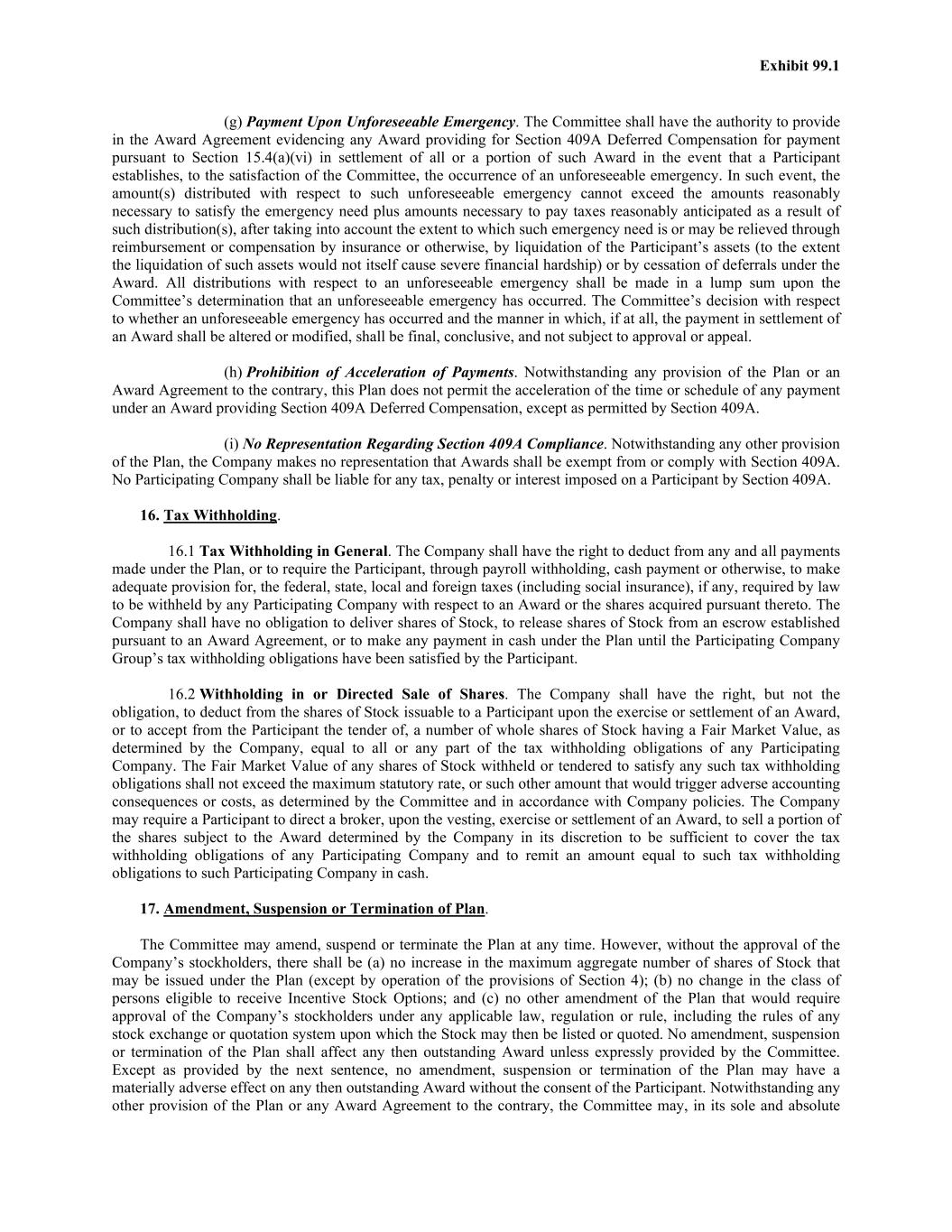 Exhibit 99.1 (g) Payment Upon Unforeseeable Emergency. The Committee shall have the authority to provide in the Award Agreement evidencing any Award providing for Section 409A Deferred Compensation for payment pursuant to Section 15.4(a)(vi) in settlement of all or a portion of such Award in the event that a Participant establishes, to the satisfaction of the Committee, the occurrence of an unforeseeable emergency. In such event, the amount(s) distributed with respect to such unforeseeable emergency cannot exceed the amounts reasonably necessary to satisfy the emergency need plus amounts necessary to pay taxes reasonably anticipated as a result of such distribution(s), after taking into account the extent to which such emergency need is or may be relieved through reimbursement or compensation by insurance or otherwise, by liquidation of the Participant’s assets (to the extent the liquidation of such assets would not itself cause severe financial hardship) or by cessation of deferrals under the Award. All distributions with respect to an unforeseeable emergency shall be made in a lump sum upon the Committee’s determination that an unforeseeable emergency has occurred. The Committee’s decision with respect to whether an unforeseeable emergency has occurred and the manner in which, if at all, the payment in settlement of an Award shall be altered or modified, shall be final, conclusive, and not subject to approval or appeal. (h) Prohibition of Acceleration of Payments. Notwithstanding any provision of the Plan or an Award Agreement to the contrary, this Plan does not permit the acceleration of the time or schedule of any payment under an Award providing Section 409A Deferred Compensation, except as permitted by Section 409A. (i) No Representation Regarding Section 409A Compliance. Notwithstanding any other provision of the Plan, the Company makes no representation that Awards shall be exempt from or comply with Section 409A. No Participating Company shall be liable for any tax, penalty or interest imposed on a Participant by Section 409A. 16. Tax Withholding. 16.1 Tax Withholding in General. The Company shall have the right to deduct from any and all payments made under the Plan, or to require the Participant, through payroll withholding, cash payment or otherwise, to make adequate provision for, the federal, state, local and foreign taxes (including social insurance), if any, required by law to be withheld by any Participating Company with respect to an Award or the shares acquired pursuant thereto. The Company shall have no obligation to deliver shares of Stock, to release shares of Stock from an escrow established pursuant to an Award Agreement, or to make any payment in cash under the Plan until the Participating Company Group’s tax withholding obligations have been satisfied by the Participant. 16.2 Withholding in or Directed Sale of Shares. The Company shall have the right, but not the obligation, to deduct from the shares of Stock issuable to a Participant upon the exercise or settlement of an Award, or to accept from the Participant the tender of, a number of whole shares of Stock having a Fair Market Value, as determined by the Company, equal to all or any part of the tax withholding obligations of any Participating Company. The Fair Market Value of any shares of Stock withheld or tendered to satisfy any such tax withholding obligations shall not exceed the maximum statutory rate, or such other amount that would trigger adverse accounting consequences or costs, as determined by the Committee and in accordance with Company policies. The Company may require a Participant to direct a broker, upon the vesting, exercise or settlement of an Award, to sell a portion of the shares subject to the Award determined by the Company in its discretion to be sufficient to cover the tax withholding obligations of any Participating Company and to remit an amount equal to such tax withholding obligations to such Participating Company in cash. 17. Amendment, Suspension or Termination of Plan. The Committee may amend, suspend or terminate the Plan at any time. However, without the approval of the Company’s stockholders, there shall be (a) no increase in the maximum aggregate number of shares of Stock that may be issued under the Plan (except by operation of the provisions of Section 4); (b) no change in the class of persons eligible to receive Incentive Stock Options; and (c) no other amendment of the Plan that would require approval of the Company’s stockholders under any applicable law, regulation or rule, including the rules of any stock exchange or quotation system upon which the Stock may then be listed or quoted. No amendment, suspension or termination of the Plan shall affect any then outstanding Award unless expressly provided by the Committee. Except as provided by the next sentence, no amendment, suspension or termination of the Plan may have a materially adverse effect on any then outstanding Award without the consent of the Participant. Notwithstanding any other provision of the Plan or any Award Agreement to the contrary, the Committee may, in its sole and absolute