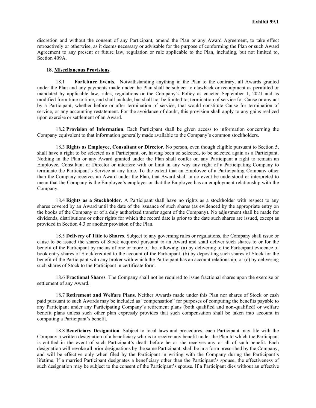 Exhibit 99.1 discretion and without the consent of any Participant, amend the Plan or any Award Agreement, to take effect retroactively or otherwise, as it deems necessary or advisable for the purpose of conforming the Plan or such Award Agreement to any present or future law, regulation or rule applicable to the Plan, including, but not limited to, Section 409A. 18. Miscellaneous Provisions. 18.1 Forfeiture Events. Notwithstanding anything in the Plan to the contrary, all Awards granted under the Plan and any payments made under the Plan shall be subject to clawback or recoupment as permitted or mandated by applicable law, rules, regulations or the Company’s Policy as enacted September 1, 2021 and as modified from time to time, and shall include, but shall not be limited to, termination of service for Cause or any act by a Participant, whether before or after termination of service, that would constitute Cause for termination of service, or any accounting restatement. For the avoidance of doubt, this provision shall apply to any gains realized upon exercise or settlement of an Award. 18.2 Provision of Information. Each Participant shall be given access to information concerning the Company equivalent to that information generally made available to the Company’s common stockholders. 18.3 Rights as Employee, Consultant or Director. No person, even though eligible pursuant to Section 5, shall have a right to be selected as a Participant, or, having been so selected, to be selected again as a Participant. Nothing in the Plan or any Award granted under the Plan shall confer on any Participant a right to remain an Employee, Consultant or Director or interfere with or limit in any way any right of a Participating Company to terminate the Participant’s Service at any time. To the extent that an Employee of a Participating Company other than the Company receives an Award under the Plan, that Award shall in no event be understood or interpreted to mean that the Company is the Employee’s employer or that the Employee has an employment relationship with the Company. 18.4 Rights as a Stockholder. A Participant shall have no rights as a stockholder with respect to any shares covered by an Award until the date of the issuance of such shares (as evidenced by the appropriate entry on the books of the Company or of a duly authorized transfer agent of the Company). No adjustment shall be made for dividends, distributions or other rights for which the record date is prior to the date such shares are issued, except as provided in Section 4.3 or another provision of the Plan. 18.5 Delivery of Title to Shares. Subject to any governing rules or regulations, the Company shall issue or cause to be issued the shares of Stock acquired pursuant to an Award and shall deliver such shares to or for the benefit of the Participant by means of one or more of the following: (a) by delivering to the Participant evidence of book entry shares of Stock credited to the account of the Participant, (b) by depositing such shares of Stock for the benefit of the Participant with any broker with which the Participant has an account relationship, or (c) by delivering such shares of Stock to the Participant in certificate form. 18.6 Fractional Shares. The Company shall not be required to issue fractional shares upon the exercise or settlement of any Award. 18.7 Retirement and Welfare Plans. Neither Awards made under this Plan nor shares of Stock or cash paid pursuant to such Awards may be included as “compensation” for purposes of computing the benefits payable to any Participant under any Participating Company’s retirement plans (both qualified and non-qualified) or welfare benefit plans unless such other plan expressly provides that such compensation shall be taken into account in computing a Participant’s benefit. 18.8 Beneficiary Designation. Subject to local laws and procedures, each Participant may file with the Company a written designation of a beneficiary who is to receive any benefit under the Plan to which the Participant is entitled in the event of such Participant’s death before he or she receives any or all of such benefit. Each designation will revoke all prior designations by the same Participant, shall be in a form prescribed by the Company, and will be effective only when filed by the Participant in writing with the Company during the Participant’s lifetime. If a married Participant designates a beneficiary other than the Participant’s spouse, the effectiveness of such designation may be subject to the consent of the Participant’s spouse. If a Participant dies without an effective