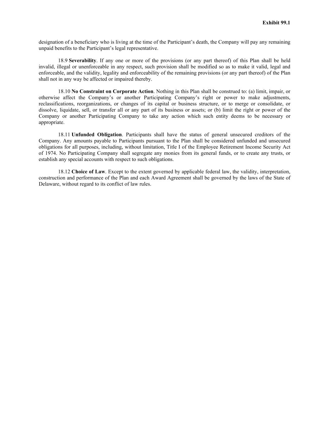 Exhibit 99.1 designation of a beneficiary who is living at the time of the Participant’s death, the Company will pay any remaining unpaid benefits to the Participant’s legal representative. 18.9 Severability. If any one or more of the provisions (or any part thereof) of this Plan shall be held invalid, illegal or unenforceable in any respect, such provision shall be modified so as to make it valid, legal and enforceable, and the validity, legality and enforceability of the remaining provisions (or any part thereof) of the Plan shall not in any way be affected or impaired thereby. 18.10 No Constraint on Corporate Action. Nothing in this Plan shall be construed to: (a) limit, impair, or otherwise affect the Company’s or another Participating Company’s right or power to make adjustments, reclassifications, reorganizations, or changes of its capital or business structure, or to merge or consolidate, or dissolve, liquidate, sell, or transfer all or any part of its business or assets; or (b) limit the right or power of the Company or another Participating Company to take any action which such entity deems to be necessary or appropriate. 18.11 Unfunded Obligation. Participants shall have the status of general unsecured creditors of the Company. Any amounts payable to Participants pursuant to the Plan shall be considered unfunded and unsecured obligations for all purposes, including, without limitation, Title I of the Employee Retirement Income Security Act of 1974. No Participating Company shall segregate any monies from its general funds, or to create any trusts, or establish any special accounts with respect to such obligations. 18.12 Choice of Law. Except to the extent governed by applicable federal law, the validity, interpretation, construction and performance of the Plan and each Award Agreement shall be governed by the laws of the State of Delaware, without regard to its conflict of law rules.