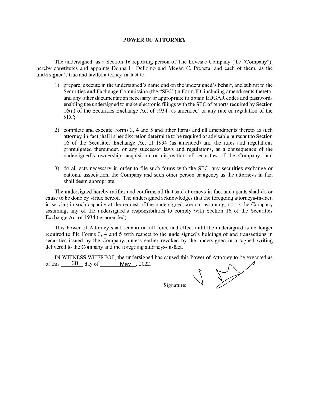 POWER OF ATTORNEY The undersigned, as a Section 16 reporting person of The Lovesac Company (the “Company”), hereby constitutes and appoints Donna L. Dellomo and Megan C. Preneta, and each of them, as the undersigned’s true and lawful attorney-in-fact to: 1) prepare, execute in the undersigned’s name and on the undersigned’s behalf, and submit to the Securities and Exchange Commission (the “SEC”) a Form ID, including amendments thereto, and any other documentation necessary or appropriate to obtain EDGAR codes and passwords enabling the undersigned to make electronic filings with the SEC of reports required by Section 16(a) of the Securities Exchange Act of 1934 (as amended) or any rule or regulation of the SEC; 2) complete and execute Forms 3, 4 and 5 and other forms and all amendments thereto as such attorney-in-fact shall in her discretion determine to be required or advisable pursuant to Section 16 of the Securities Exchange Act of 1934 (as amended) and the rules and regulations promulgated thereunder, or any successor laws and regulations, as a consequence of the undersigned’s ownership, acquisition or disposition of securities of the Company; and 3) do all acts necessary in order to file such forms with the SEC, any securities exchange or national association, the Company and such other person or agency as the attorneys-in-fact shall deem appropriate. The undersigned hereby ratifies and confirms all that said attorneys-in-fact and agents shall do or cause to be done by virtue hereof. The undersigned acknowledges that the foregoing attorneys-in-fact, in serving in such capacity at the request of the undersigned, are not assuming, nor is the Company assuming, any of the undersigned’s responsibilities to comply with Section 16 of the Securities Exchange Act of 1934 (as amended). This Power of Attorney shall remain in full force and effect until the undersigned is no longer required to file Forms 3, 4 and 5 with respect to the undersigned’s holdings of and transactions in securities issued by the Company, unless earlier revoked by the undersigned in a signed writing delivered to the Company and the foregoing attorneys-in-fact. IN WITNESS WHEREOF, the undersigned has caused this Power of Attorney to be executed as of this ________ day of _____________, 2022. Signature:_______________________________ 30 May rig
