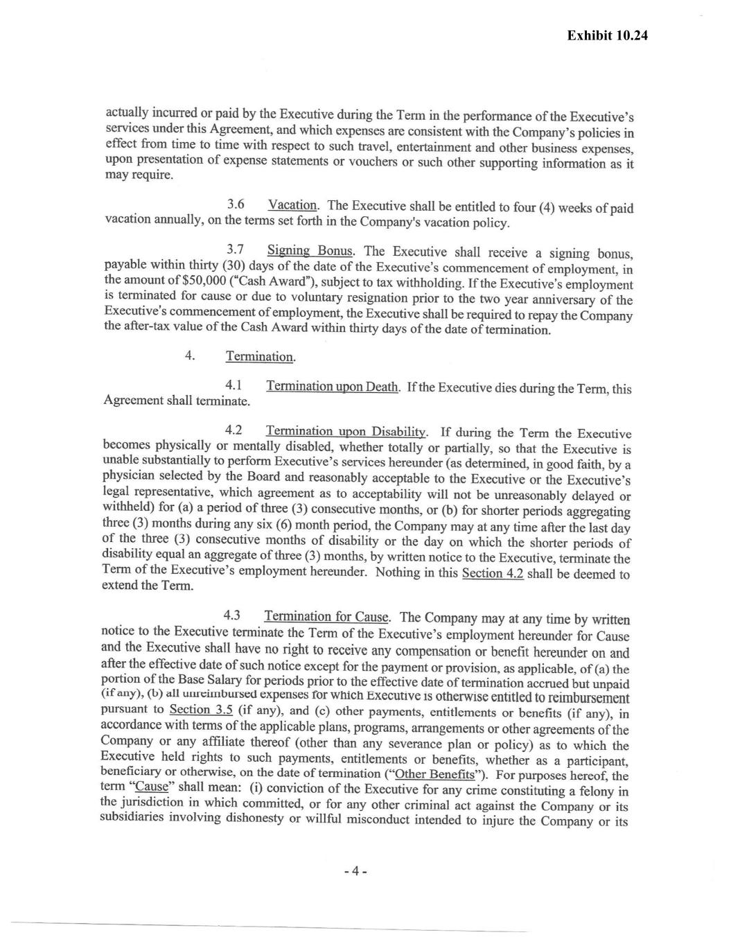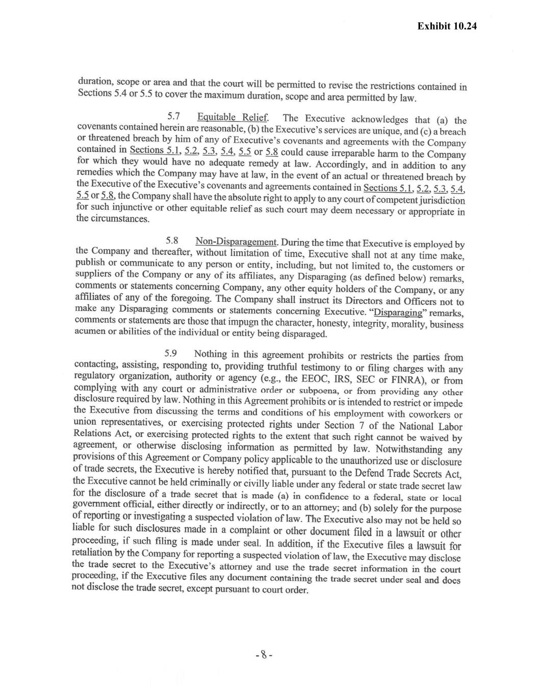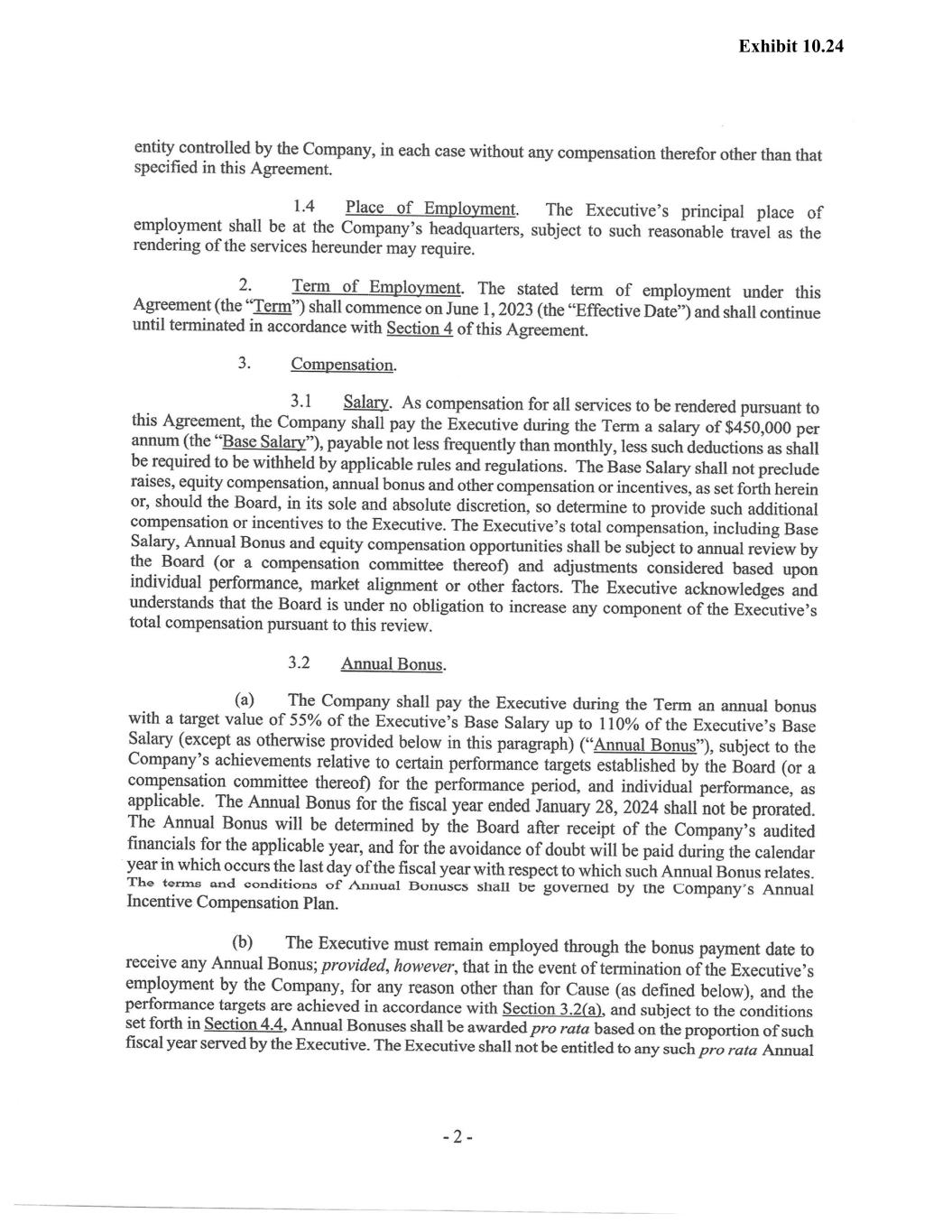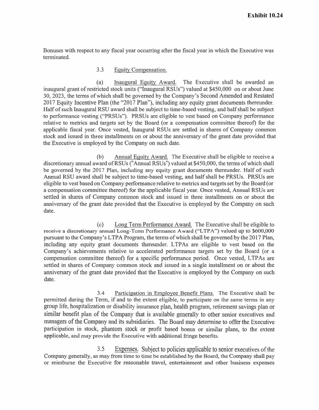 Bonuses with respect to any fiscal year occurring after the fiscal year in which the Executive was terminated. 3.3 Equity Compensation. (a) Inaugural Equity Award. The Executive shall be awarded an inaugural grant of restricted stock units ("Inaugural RSUs") valued at $450,000 on or about June 30, 2023, the terms of which shall be governed by the Company's Second Amended and Restated 2017 Equity Incentive Plan (the "2017 Plan"), including any equity grant documents thereunder. Half of such Inaugural RSU award shall be subject to time-based vesting, and half shall be subject to performance vesting ("PRSUs"). PRSUs are eligible to vest based on Company performance relative to metrics and targets set by the Board ( or a compensation committee thereof) for the applicable fiscal year. Once vested, Inaugural RSUs are settled in shares of Company common stock and issued in three installments on or about the anniversary of the grant date provided that the Executive is employed by the Company on such date. (b) Annual Equity Award. The Executive shall be eligible to receive a discretionary annual award ofRSUs ("Annual RSUs") valued at $450,000, the terms of which shall be governed by the 201 7 Plan, including any equity grant documents thereunder. Half of such Annual RSU award shall be subject to time-based vesting, and half shall be PRSUs. PRSUs are eligible to vest based on Company performance relative to metrics and targets set by the Board ( or a compensation committee thereof) for the applicable fiscal year. Once vested, Annual RSUs are settled in shares of Company common stock and issued in three installments on or about the anniversary of the grant date provided that the Executive is employed by the Company on such date. ( c) Long Term Performance Award. The Executive shall be eligible to receive a discretionary annual Long-Term Performance Award ("LTPA") valued up to $600,000 pursuant to the Company's L TP A Program, the terms of which shall be governed by the 2017 Plan, including any equity grant documents thereunder. L TP As are eligible to vest based on the Company's achievements relative to accelerated performance targets set by the Board ( or a compensation committee thereof) for a specific performance period. Once vested, L TP As are settled in shares of Company common stock and issued in a single installment on or about the anniversary of the grant date provided that the Executive is employed by the Company on such date. 3.4 Participation in Employee Benefit Plans. The Executive shall be permitted during the Term, if and to the extent eligible, to participate on the same terms in any group life, hospitalization or disability insurance plan, health program, retirement savings plan or similar benefit plan of the Company that is available generally to other senior executives and managers of the Company and its subsidiaries. The Board may determine to offer the Executive participation in stock, phantom stock or profit based bonus or similar plans, to the extent applicable, and may provide the Executive with additional fringe benefits. 3.5 Expenses. Subject to policies applicable to senior executives of the Company generally, as may from time to time be established by the Board, the Company shall pay or reimburse the Executive for reasonable travel, entertainment and other business expenses Exhibit 10.24