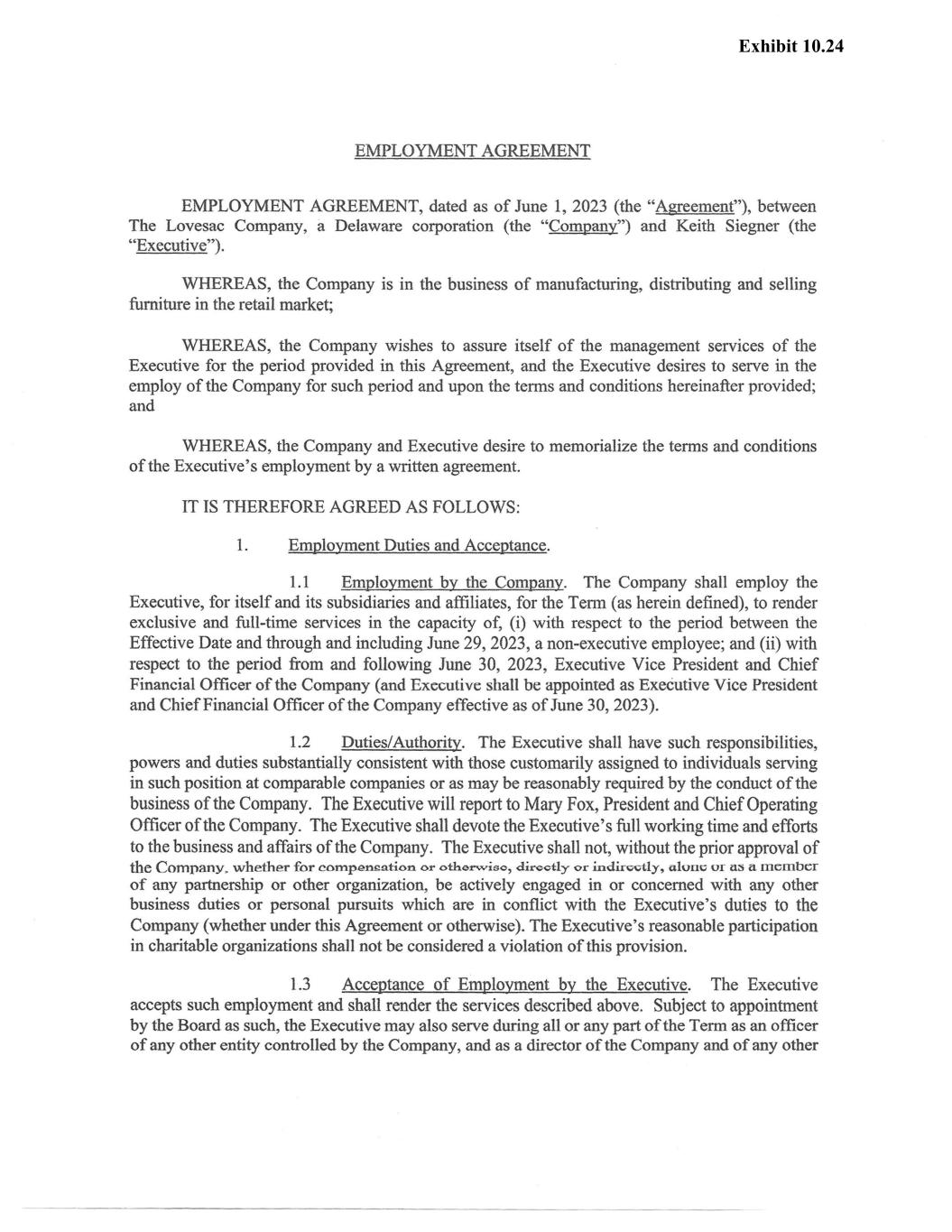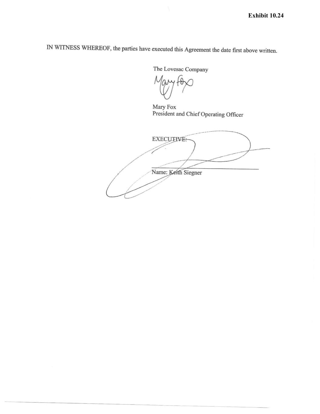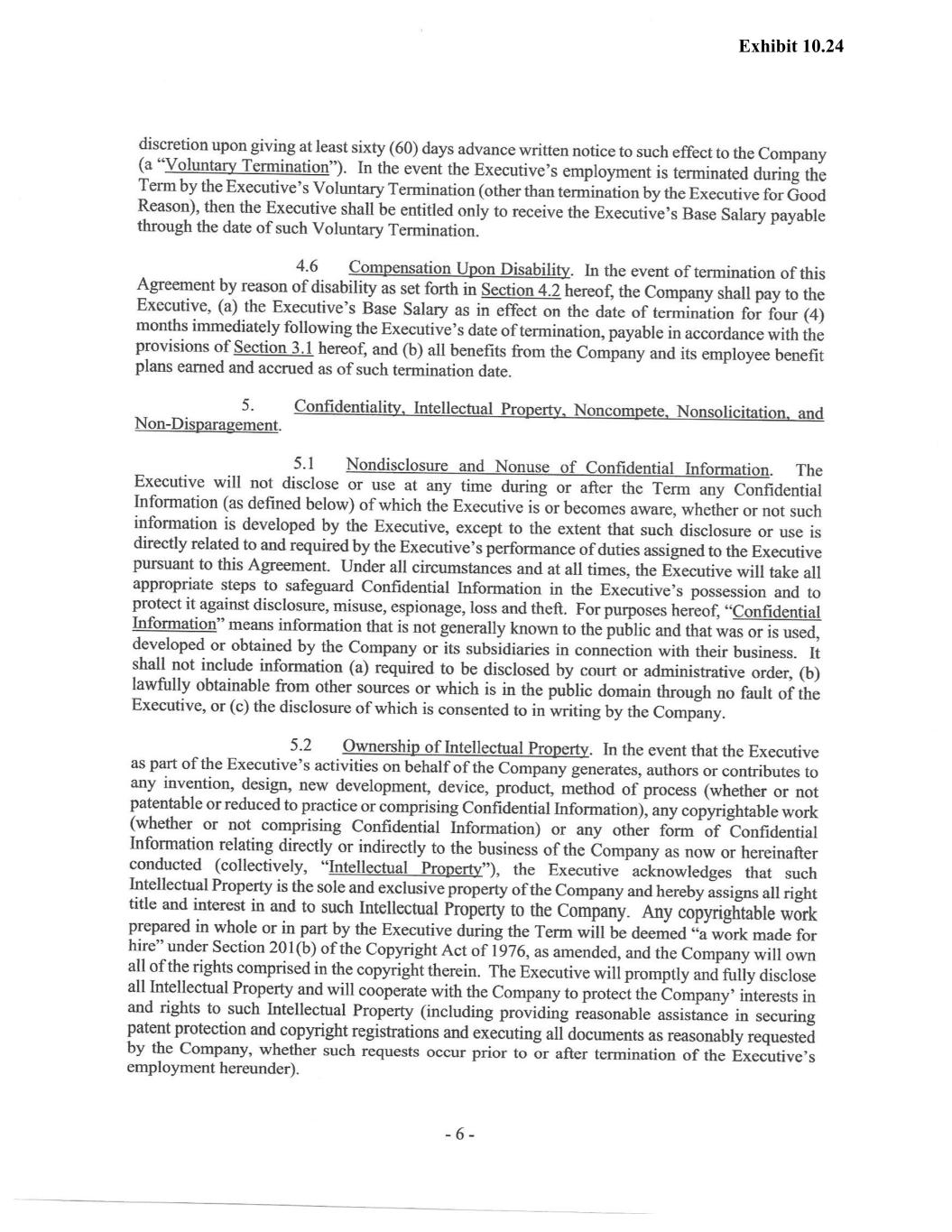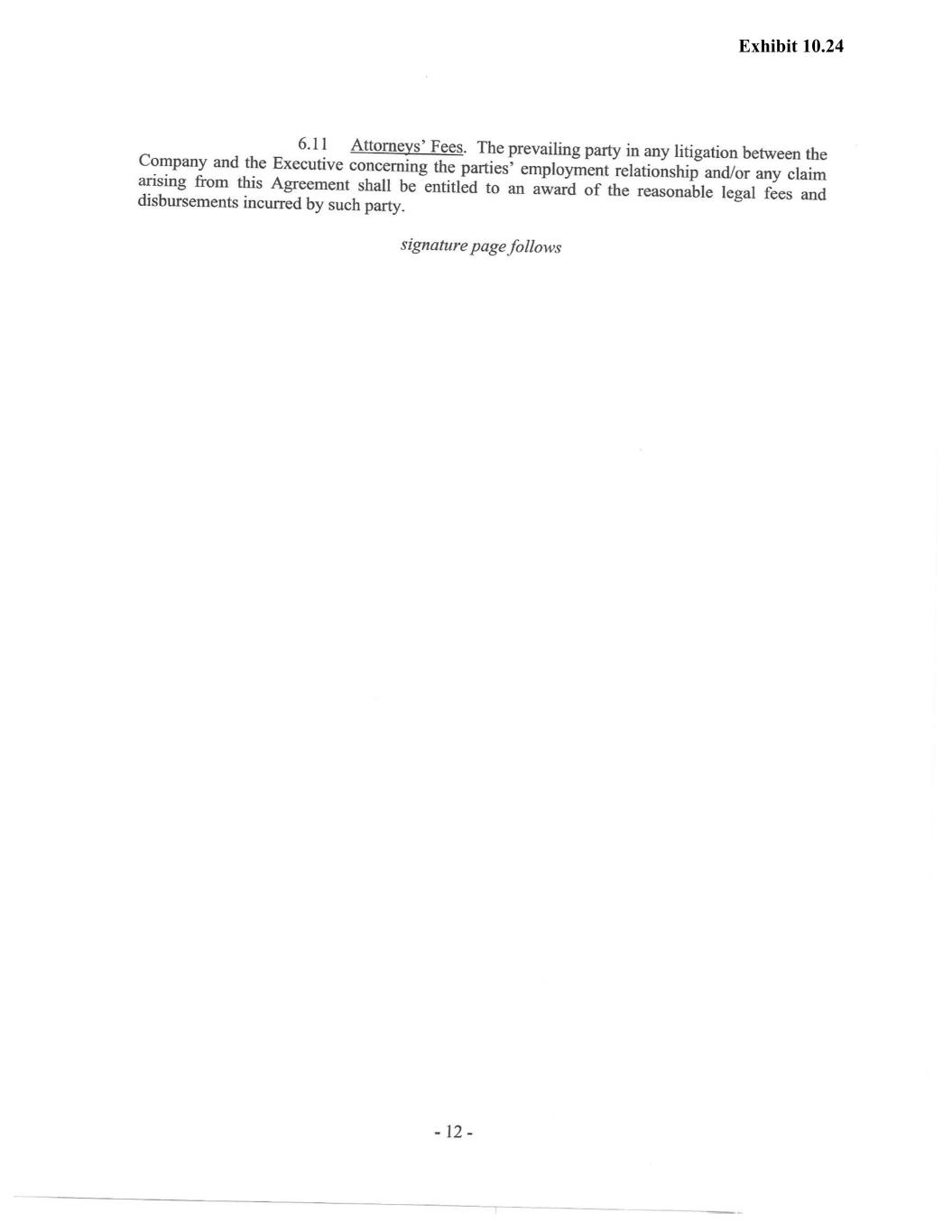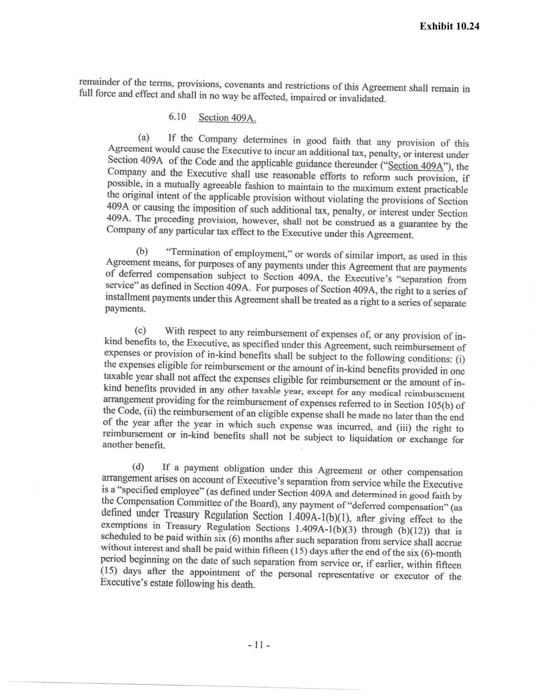 Bonuses with respect to any fiscal year occurring after the fiscal year in which the Executive was terminated. 3.3 Equity Compensation. (a) Inaugural Equity Award. The Executive shall be awarded an inaugural grant of restricted stock units ("Inaugural RSUs") valued at $450,000 on or about June 30, 2023, the terms of which shall be governed by the Company's Second Amended and Restated 2017 Equity Incentive Plan (the "2017 Plan"), including any equity grant documents thereunder. Half of such Inaugural RSU award shall be subject to time-based vesting, and half shall be subject to performance vesting ("PRSUs"). PRSUs are eligible to vest based on Company performance relative to metrics and targets set by the Board ( or a compensation committee thereof) for the applicable fiscal year. Once vested, Inaugural RSUs are settled in shares of Company common stock and issued in three installments on or about the anniversary of the grant date provided that the Executive is employed by the Company on such date. (b) Annual Equity Award. The Executive shall be eligible to receive a discretionary annual award ofRSUs ("Annual RSUs") valued at $450,000, the terms of which shall be governed by the 201 7 Plan, including any equity grant documents thereunder. Half of such Annual RSU award shall be subject to time-based vesting, and half shall be PRSUs. PRSUs are eligible to vest based on Company performance relative to metrics and targets set by the Board ( or a compensation committee thereof) for the applicable fiscal year. Once vested, Annual RSUs are settled in shares of Company common stock and issued in three installments on or about the anniversary of the grant date provided that the Executive is employed by the Company on such date. ( c) Long Term Performance Award. The Executive shall be eligible to receive a discretionary annual Long-Term Performance Award ("LTPA") valued up to $600,000 pursuant to the Company's L TP A Program, the terms of which shall be governed by the 2017 Plan, including any equity grant documents thereunder. L TP As are eligible to vest based on the Company's achievements relative to accelerated performance targets set by the Board ( or a compensation committee thereof) for a specific performance period. Once vested, L TP As are settled in shares of Company common stock and issued in a single installment on or about the anniversary of the grant date provided that the Executive is employed by the Company on such date. 3.4 Participation in Employee Benefit Plans. The Executive shall be permitted during the Term, if and to the extent eligible, to participate on the same terms in any group life, hospitalization or disability insurance plan, health program, retirement savings plan or similar benefit plan of the Company that is available generally to other senior executives and managers of the Company and its subsidiaries. The Board may determine to offer the Executive participation in stock, phantom stock or profit based bonus or similar plans, to the extent applicable, and may provide the Executive with additional fringe benefits. 3.5 Expenses. Subject to policies applicable to senior executives of the Company generally, as may from time to time be established by the Board, the Company shall pay or reimburse the Executive for reasonable travel, entertainment and other business expenses Exhibit 10.24