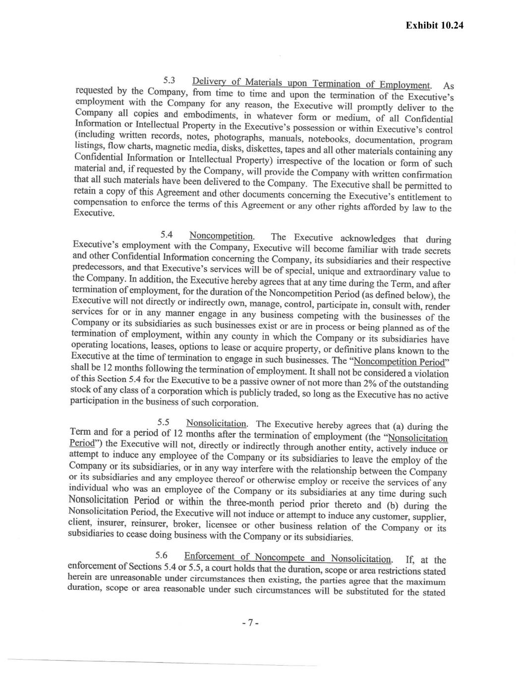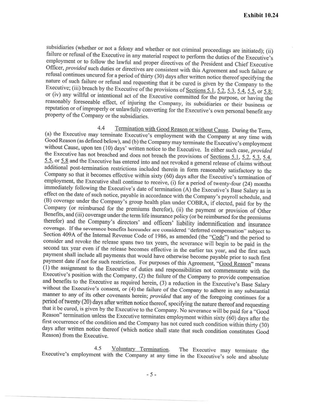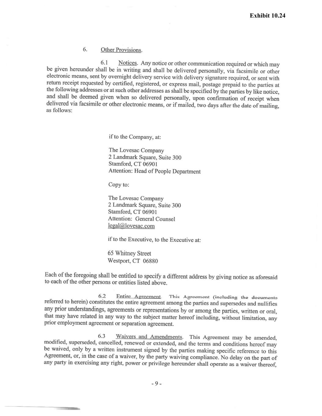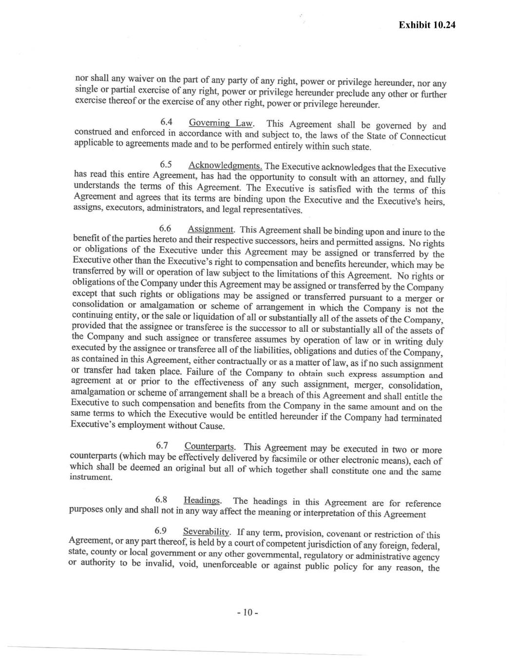 Bonuses with respect to any fiscal year occurring after the fiscal year in which the Executive was terminated. 3.3 Equity Compensation. (a) Inaugural Equity Award. The Executive shall be awarded an inaugural grant of restricted stock units ("Inaugural RSUs") valued at $450,000 on or about June 30, 2023, the terms of which shall be governed by the Company's Second Amended and Restated 2017 Equity Incentive Plan (the "2017 Plan"), including any equity grant documents thereunder. Half of such Inaugural RSU award shall be subject to time-based vesting, and half shall be subject to performance vesting ("PRSUs"). PRSUs are eligible to vest based on Company performance relative to metrics and targets set by the Board ( or a compensation committee thereof) for the applicable fiscal year. Once vested, Inaugural RSUs are settled in shares of Company common stock and issued in three installments on or about the anniversary of the grant date provided that the Executive is employed by the Company on such date. (b) Annual Equity Award. The Executive shall be eligible to receive a discretionary annual award ofRSUs ("Annual RSUs") valued at $450,000, the terms of which shall be governed by the 201 7 Plan, including any equity grant documents thereunder. Half of such Annual RSU award shall be subject to time-based vesting, and half shall be PRSUs. PRSUs are eligible to vest based on Company performance relative to metrics and targets set by the Board ( or a compensation committee thereof) for the applicable fiscal year. Once vested, Annual RSUs are settled in shares of Company common stock and issued in three installments on or about the anniversary of the grant date provided that the Executive is employed by the Company on such date. ( c) Long Term Performance Award. The Executive shall be eligible to receive a discretionary annual Long-Term Performance Award ("LTPA") valued up to $600,000 pursuant to the Company's L TP A Program, the terms of which shall be governed by the 2017 Plan, including any equity grant documents thereunder. L TP As are eligible to vest based on the Company's achievements relative to accelerated performance targets set by the Board ( or a compensation committee thereof) for a specific performance period. Once vested, L TP As are settled in shares of Company common stock and issued in a single installment on or about the anniversary of the grant date provided that the Executive is employed by the Company on such date. 3.4 Participation in Employee Benefit Plans. The Executive shall be permitted during the Term, if and to the extent eligible, to participate on the same terms in any group life, hospitalization or disability insurance plan, health program, retirement savings plan or similar benefit plan of the Company that is available generally to other senior executives and managers of the Company and its subsidiaries. The Board may determine to offer the Executive participation in stock, phantom stock or profit based bonus or similar plans, to the extent applicable, and may provide the Executive with additional fringe benefits. 3.5 Expenses. Subject to policies applicable to senior executives of the Company generally, as may from time to time be established by the Board, the Company shall pay or reimburse the Executive for reasonable travel, entertainment and other business expenses Exhibit 10.24