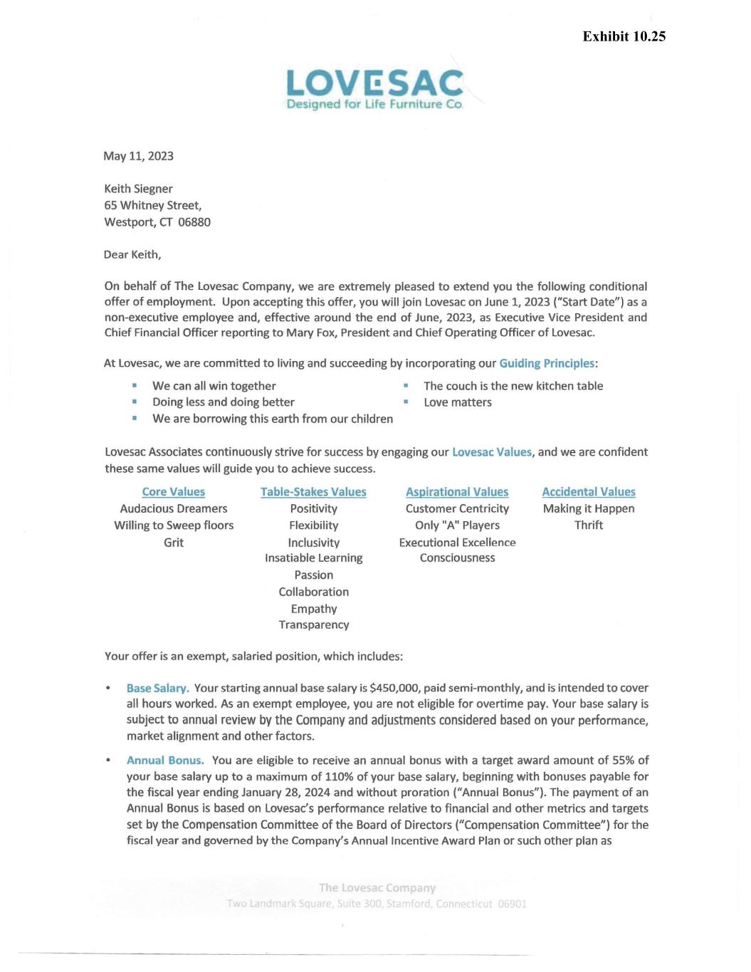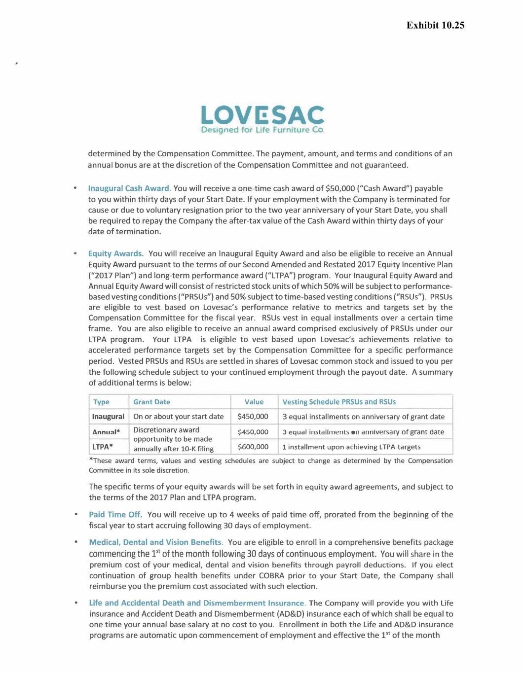 LOVl!SAC Designed for Life Furniture Co determined by the Compensation Committee. The payment, amount, and terms and conditions of an annual bonus are at the discretion of the Compensation Committee and not guaranteed. • Inaugural Cash Award. You will receive a one-time cash award of $50,000 ("Cash Award") payable to you within thirty days of your Start Date. If your employment with the Company is terminated for cause or due to voluntary resignation prior to the two year anniversary of your Start Date, you shall be required to repay the Company the after-tax value of the Cash Award within thirty days of your date of termination. Equity Awards. You will receive an Inaugural Equity Award and also be eligible to receive an Annual Equity Award pursuant to the terms of our Second Amended and Restated 2017 Equity Incentive Plan ("2017 Plan") and long-term performance award ("LTPA") program. Your Inaugural Equity Award and Annual Equity Award will consist of restricted stock units of which 50% will be subject to performance based vesting conditions ("PRSUs") and 50% subject to time-based vesting conditions ("RSUs"). PRSUs are eligible to vest based on Lovesac's performance relative to metrics and targets set by the Compensation Committee for the fiscal year. RSUs vest in equal installments over a certain time frame. You are also eligible to receive an annual award comprised exclusively of PRSUs under our LTPA program. Your LTPA is eligible to vest based upon Lovesac's achievements relative to accelerated performance targets set by the Compensation Committee for a specific performance period. Vested PRSUs and RSUs are settled in shares of Lovesac common stock and issued to you per the following schedule subject to your continued employment through the payout date. A summary of additional terms is below: Type Grant Date Value Inaugural On or about your start date $450,000 Annual* Discretionary award $450,000 opportunity to be made LTPA* annually after 10-K filing $600,000 Vesting Schedule PRSUs and RSUs 3 equal installments on anniversary of grant date 3 equal installments on anniversary of grant date 1 installment upon achieving LTPA targets *These award terms, values and vesting schedules are subject to change as determined by the Compensation Committee in its sole discretion. The specific terms of your equity awards will be set forth in equity award agreements, and subject to the terms of the 2017 Plan and LTPA program. • Paid Time Off. You will receive up to 4 weeks of paid time off, prorated from the beginning of the fiscal year to start accruing following 30 days of employment. • Medical, Dental and Vision Benefits. You are eligible to enroll in a comprehensive benefits package commencing the pt of the month following 30 days of continuous employment. You will share in the premium cost of your medical, dental and vision benefits through payroll deductions. If you elect continuation of group health benefits under COBRA prior to your Start Date, the Company shall reimburse you the premium cost associated with such election. • Life and Accidental Death and Dismemberment Insurance. The Company will provide you with Life insurance and Accident Death and Dismemberment (AD&D) insurance each of which shall be equal to one time your annual base salary at no cost to you. Enrollment in both the Life and AD&D insurance programs are automatic upon commencement of employment and effective the 1st of the month Exhibit 10.25