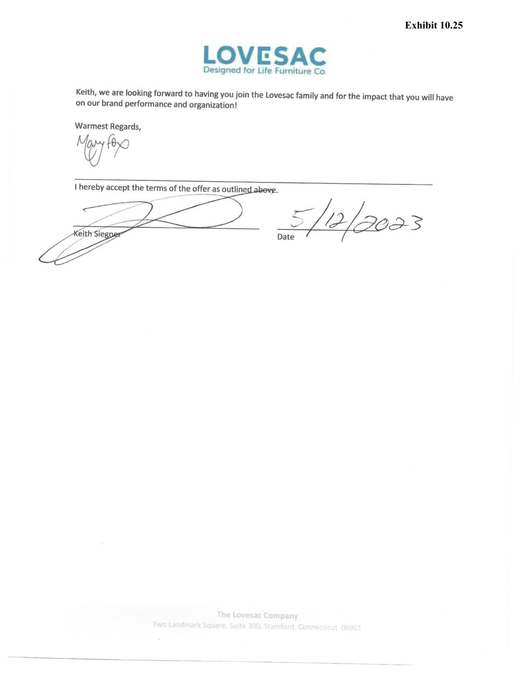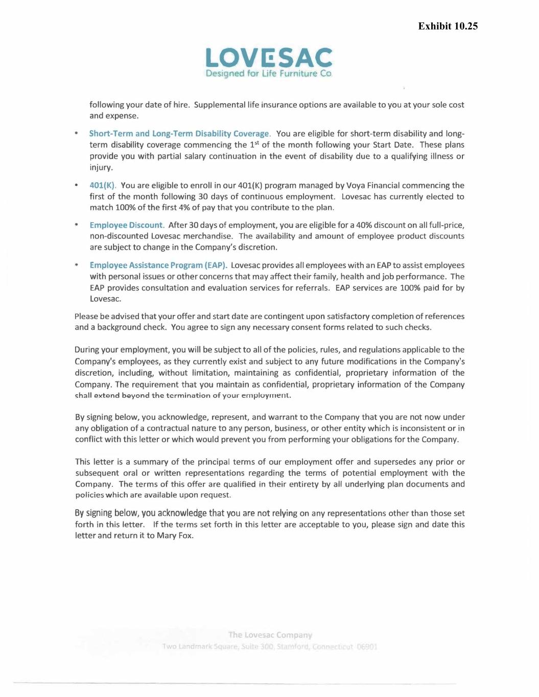 LOVl!SAC Designed for Life Furnit ire Co following your date of hire. Supplemental life insurance options are available to you at your sole cost and expense. Short-Term and long-Term Disability Coverage. You are eligible for short-term disability and long term disability coverage commencing the 1 st of the month following your Start Date. These plans provide you with partial salary continuation in the event of disability due to a qualifying illness or injury. • 401(K). You are eligible to enroll in our 401(K) program managed by Voya Financial commencing the first of the month following 30 days of continuous employment. Lovesac has currently elected to match 100% of the first 4% of pay that you contribute to the plan. Employee Discount. After 30 days of employment, you are eligible for a 40% discount on all full-price, non-discounted Lovesac merchandise. The availability and amount of employee product discounts are subject to change in the Company's discretion. Employee Assistance Program (EAP). Lovesac provides all employees with an EAP to assist employees with personal issues or other concerns that may affect their family, health and job performance. The EAP provides consultation and evaluation services for referrals. EAP services are 100% paid for by Lovesac. Please be advised that your offer and start date are contingent upon satisfactory completion of references and a background check. You agree to sign any necessary consent forms related to such checks. During your employment, you will be subject to all of the policies, rules, and regulations applicable to the Company's employees, as they currently exist and subject to any future modifications in the Company's discretion, including, without limitation, maintaining as confidential, proprietary information of the Company. The requirement that you maintain as confidential, proprietary information of the Company shall e)(tend beyond the termination of your i::mployment. By signing below, you acknowledge, represent, and warrant to the Company that you are not now under any obligation of a contractual nature to any person, business, or other entity which is inconsistent or in conflict with this letter or which would prevent you from performing your obligations for the Company. This letter is a summary of the principal terms of our employment offer and supersedes any prior or subsequent oral or written representations regarding the terms of potential employment with the Company. The terms of this offer are qualified in their entirety by all underlying plan documents and policies which are available upon request. By signing below, you acknowledge that you are not relying on any representations other than those set forth in this letter. If the terms set forth in this letter are acceptable to you, please sign and date this letter and return it to Mary Fox. h ove ac Comp,m Exhibit 10.25