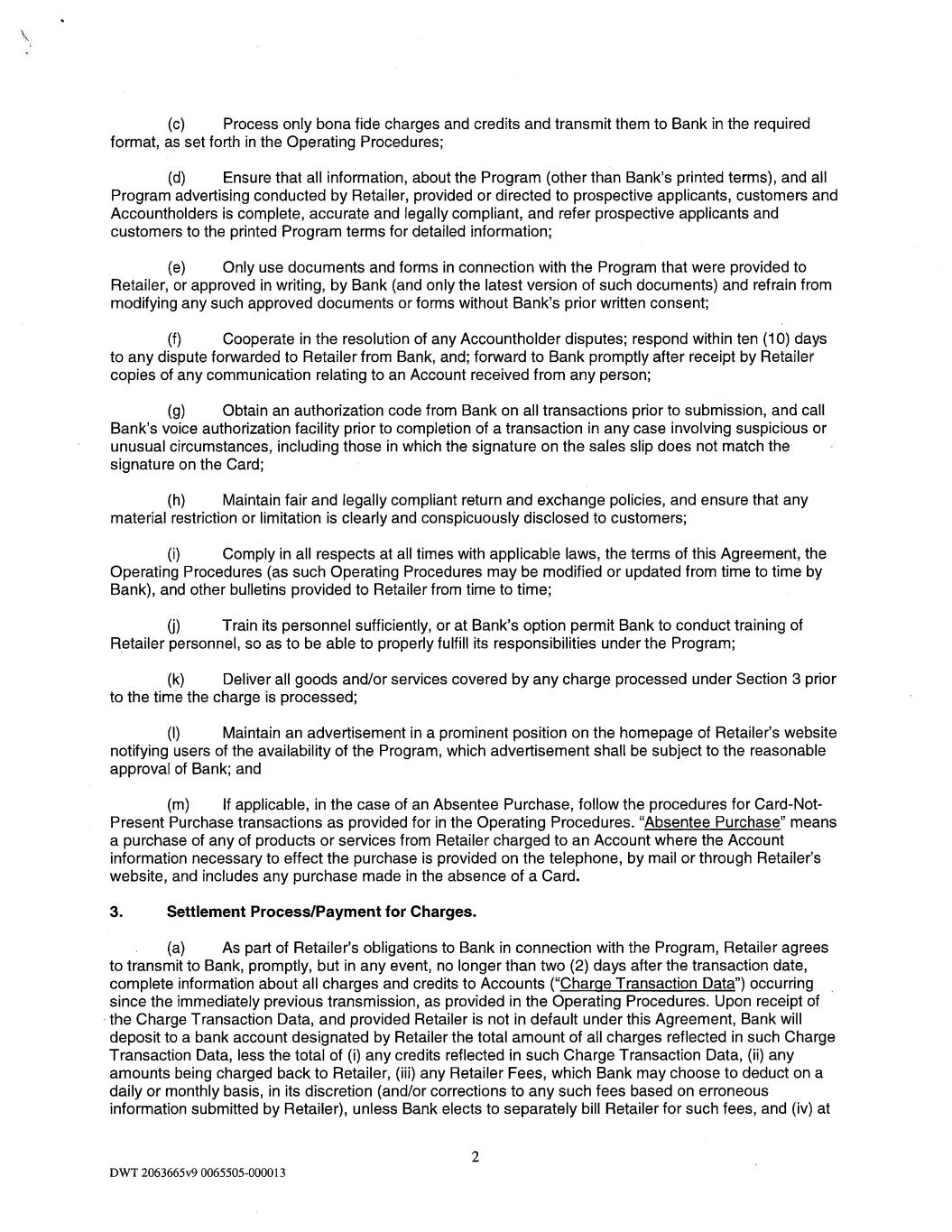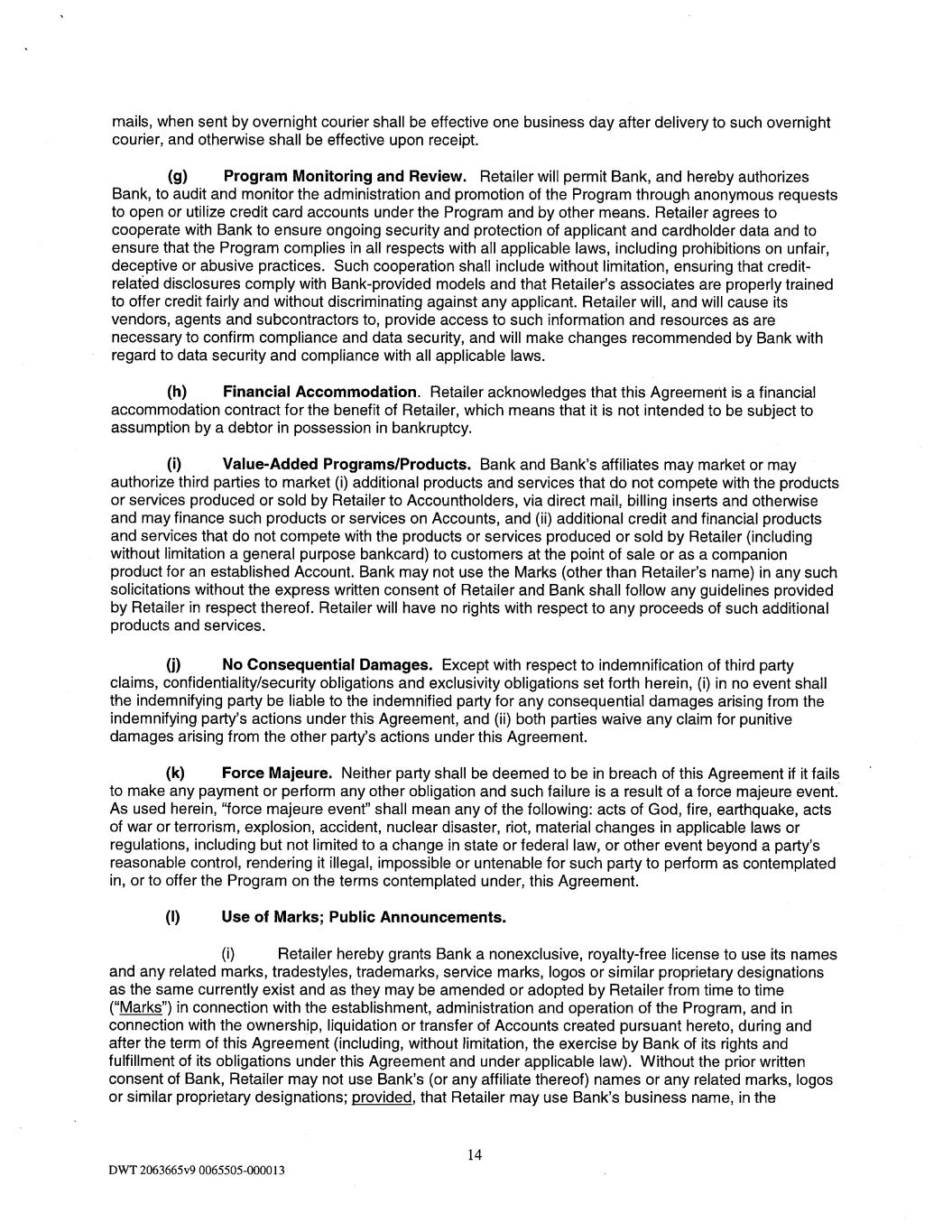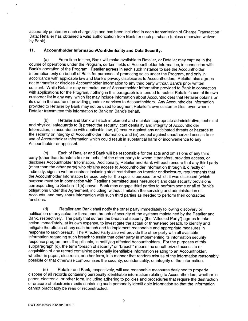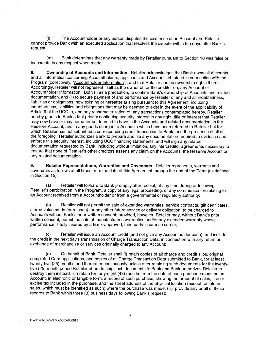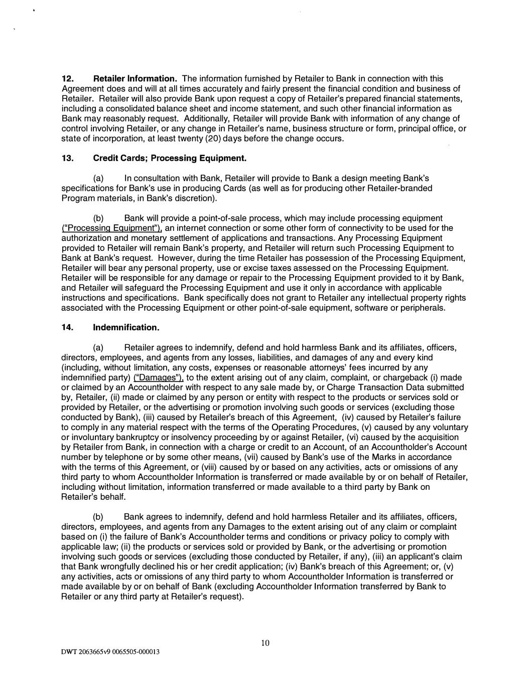 12. Retailer Information. The information furnished by Retailer to Bank in connection with this Agreement does and will at all times accurately and fairly present the financial condition and business of Retailer. Retailer will also provide Bank upon request a copy of Retailer's prepared financial statements, including a consolidated balance sheet and income statement, and such other financial information as Bank may reasonably request. Additionally, Retailer will provide Bank with information of any change of control involving Retailer, or any change in Retailer's name, business structure or form, principal office, or state of incorporation, at least twenty (20} days before the change occurs. 13. Credit Cards; Processing Equipment. (a) In consultation with Bank, Retailer will provide to Bank a design meeting Bank's specifications for Bank's use in producing Cards (as well as for producing other Retailer-branded Program materials, in Bank's discretion). (b) Bank will provide a point-of-sale process, which may include processing equipment ("Processing Equipment"), an internet connection or some other form of connectivity to be used for the authorization and monetary settlement of applications and transactions. Any Processing Equipment provided to Retailer will remain Bank's property, and Retailer will return such Processing Equipment to Bank at Bank's request. However, during the time Retailer has possession of the Processing Equipment, Retailer will bear any personal property, use or excise taxes assessed on the Processing Equipment. Retailer will be responsible for any damage or repair to the Processing Equipment provided to it by Bank, and Retailer will safeguard the Processing Equipment and use it only in accordance with applicable instructions and specifications. Bank specifically does not grant to Retailer any intellectual property rights associated with the Processing Equipment or other point-of-sale equipment, software or peripherals. 14. Indemnification. (a) Retailer agrees to indemnify, defend and hold harmless Bank and its affiliates, officers, directors, employees, and agents from any losses, liabilities, and damages of any and every kind (including, without limitation, any costs, expenses or reasonable attorneys' fees incurred by any indemnified party) ("Damages"), to the extent arising out of any claim, complaint, or chargeback (i) made or claimed by an Accountholder with respect to any sale made by, or Charge Transaction Data submitted by, Retailer, (ii) made or claimed by any person or entity with respect to the products or services sold or provided by Retailer, or the advertising or promotion involving such goods or services (excluding those conducted by Bank), (iii) caused by Retailer's breach of this Agreement, (iv) caused by Retailer's failure to comply in any material respect with the terms of the Operating Procedures, (v) caused by any voluntary or involuntary bankruptcy or insolvency proceeding by or against Retailer, (vi) caused by the acquisition by Retailer from Bank, in connection with a charge or credit to an Account, of an Accountholder's Account number by telephone or by some other means, (vii) caused by Bank's use of the Marks in accordance with the terms of this Agreement, or (viii) caused by or based on any activities, acts or omissions of any third party to whom Accountholder Information is transferred or made available by or on behalf of Retailer, including without limitation, information transferred or made available to a third party by Bank on Retailer's behalf. (b) Bank agrees to indemnify, defend and hold harmless Retailer and its affiliates, officers, directors, employees, and agents from any Damages to the extent arising out of any claim or complaint based on (i} the failure of Bank's Accountholder terms and conditions or privacy policy to comply with applicable law; (ii) the products or services sold or provided by Bank, or the advertising or promotion involving such goods or services (excluding those conducted by Retailer, if any), (iii) an applicant's claim that Bank wrongfully declined his or her credit application; (iv) Bank's breach of this Agreement; or, (v) any activities, acts or omissions of any third party to whom Accountholder Information is transferred or made available by or on behalf of Bank (excluding Accountholder Information transferred by Bank to Retailer or any third party at Retailer's request). 10 DWT 2063665v9 0065505-000013