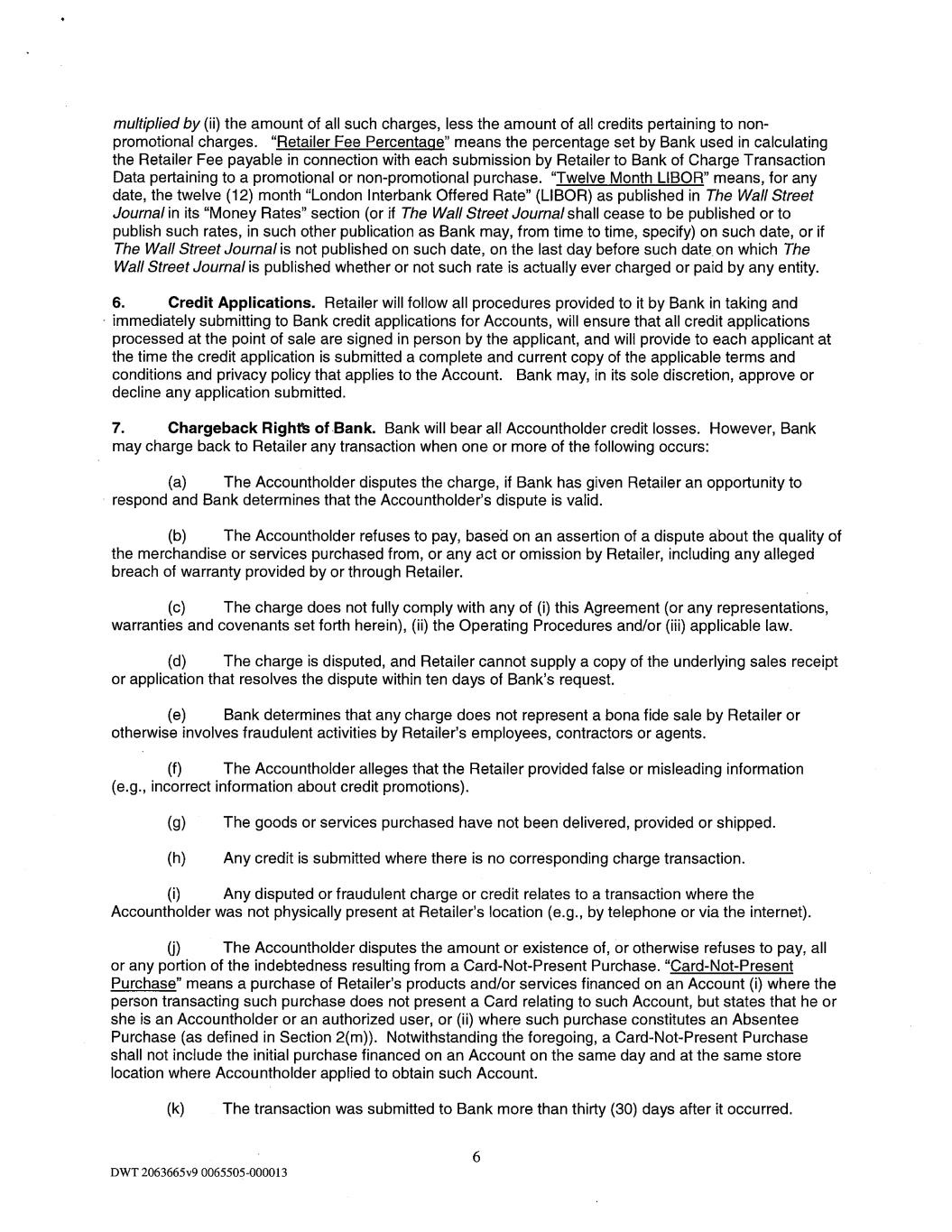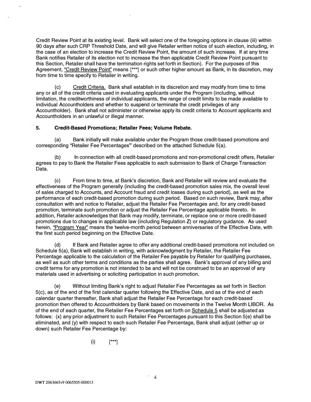 Credit Review Point at its existing level. Bank will select one of the foregoing options in clause (iii) within 90 days after such CRP Threshold Date, and will give Retailer written notice of such election, including, in the case of an election to increase the Credit Review Point, the amount of such increase. If at any time Bank notifies Retailer of its election not to increase the then applicable Credit Review Point pursuant to this Section, Retailer shall have the termination rights set forth in Section). For the purposes of this Agreement, "Credit Review Point" means [***] or such other higher amount as Bank, in its discretion, may from time to time specify to Retailer in writing. (c) Credit Criteria. Bank shall establish in its discretion and may modify from time to time any or all of the credit criteria used in evaluating applicants under the Program (including, without limitation, the creditworthiness of individual applicants, the range of credit limits to be made available to individual Accountholders and whether to suspend or terminate the credit privileges of any Accountholder). Bank shall not administer or otherwise apply its credit criteria to Account applicants and Accountholders in an unlawful or illegal manner. 5. Credit-Based Promotions; Retailer Fees; Volume Rebate. (a) Bank initially will make available under the Program those credit-based promotions and corresponding "Retailer Fee Percentages" described on the attached Schedule 5(a). (b) In connection with all credit-based promotions and non-promotional credit offers, Retailer agrees to pay to Bank the Retailer Fees applicable to each submission to Bank of Charge Transaction Data. (c) From time to time, at Bank's discretion, Bank and Retailer will review and evaluate the effectiveness of the Program generally (including the credit-based promotion sales mix, the overall level of sales charged to Accounts, and Account fraud and credit losses during such period), as well as the performance of each credit-based promotion during such period. Based on such review, Bank may, after consultation with and notice to Retailer, adjust the Retailer Fee Percentages and, for any credit-based promotion, terminate such promotion or adjust the Retailer Fee Percentage applicable thereto. In addition, Retailer acknowledges that Bank may modify, terminate, or replace one or more credit-based promotions due to changes in applicable law (including Regulation Z) or regulatory guidance. As used herein, "Program Year" means the twelve-month period between anniversaries of the Effective Date, with the first such period beginning on the Effective Date. (d) If Bank and Retailer agree to offer any additional credit-based promotions not included on Schedule 5(a), Bank will establish in writing, with acknowledgment by Retailer, the Retailer Fee Percentage applicable to the calculation of the Retailer Fee payable by Retailer for qualifying purchases, as well as such other terms and conditions as the parties shall agree. Bank's approval of any billing and credit terms for any promotion is not intended to be and will not be construed to be an approval of any materials used in advertising or soliciting participation in such promotion. (e) Without limiting Bank's right to adjust Retailer Fee Percentages as set forth in Section 5(c), as of the end of the first calendar quarter following the Effective Date, and as of the end of each calendar quarter thereafter, Bank shall adjust the Retailer Fee Percentage for each credit-based promotion then offered to Accountholders by Bank based on movements in the Twelve Month LIBOR. As of the end of each quarter, the Retailer Fee Percentages set forth on Schedule 5 shall be adjusted as follows: (x) any prior adjustment to such Retailer Fee Percentages pursuant to this Section 5(e) shall be eliminated, and (y) with respect to each such Retailer Fee Percentage, Bank shall adjust (either up or down) such Retailer Fee Percentage by: (i) [***] 4 DWT 2063665v9 0065505-000013