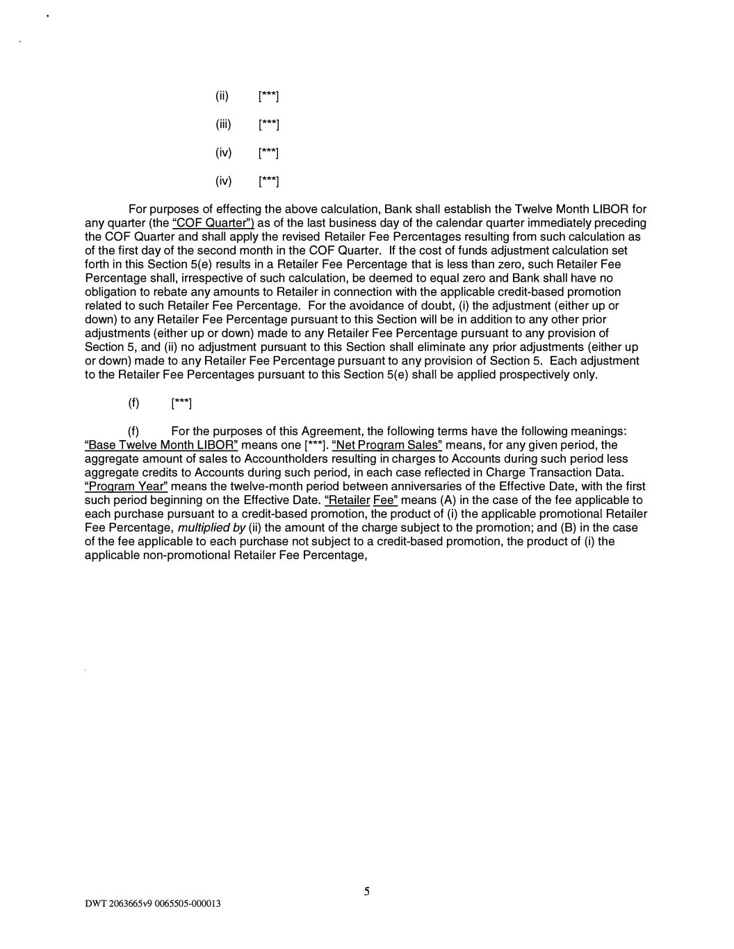 (ii) [***] (iii) [***] (iv) [***] (iv) [***] For purposes of effecting the above calculation, Bank shall establish the Twelve Month LIBOR for any quarter (the "COF Quarter") as of the last business day of the calendar quarter immediately preceding the COF Quarter and shall apply the revised Retailer Fee Percentages resulting from such calculation as of the first day of the second month in the COF Quarter. If the cost of funds adjustment calculation set forth in this Section 5(e) results in a Retailer Fee Percentage that is less than zero, such Retailer Fee Percentage shall, irrespective of such calculation, be deemed to equal zero and Bank shall have no obligation to rebate any amounts to Retailer in connection with the applicable credit-based promotion related to such Retailer Fee Percentage. For the avoidance of doubt, (i) the adjustment (either up or down) to any Retailer Fee Percentage pursuant to this Section will be in addition to any other prior adjustments (either up or down) made to any Retailer Fee Percentage pursuant to any provision of Section 5, and (ii) no adjustment pursuant to this Section shall eliminate any prior adjustments (either up or down) made to any Retailer Fee Percentage pursuant to any provision of Section 5. Each adjustment to the Retailer Fee Percentages pursuant to this Section 5(e) shall be applied prospectively only. (f) [***] (f) For the purposes of this Agreement, the following terms have the following meanings: "Base Twelve Month LIBOR" means one [***]. "Net Program Sales" means, for any given period, the aggregate amount of sales to Accountholders resulting in charges to Accounts during such period less aggregate credits to Accounts during such period, in each case reflected in Charge Transaction Data. "Program Year" means the twelve-month period between anniversaries of the Effective Date, with the first such period beginning on the Effective Date. "Retailer Fee" means (A) in the case of the fee applicable to each purchase pursuant to a credit-based promotion, the product of (i) the applicable promotional Retailer Fee Percentage, multiplied by (ii) the amount of the charge subject to the promotion; and (B) in the case of the fee applicable to each purchase not subject to a credit-based promotion, the product of (i) the applicable non-promotional Retailer Fee Percentage, 5 DWT 2063665v9 0065505-000013