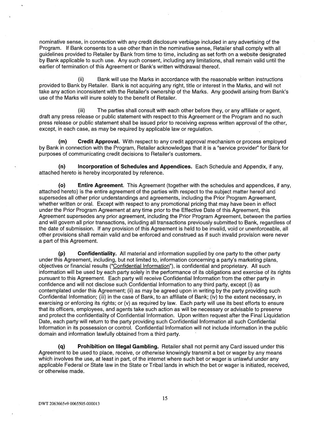 Agreement, Bank will have the right, in addition to and without waiving any other rights it may have under the terms of this Agreement or applicclble law, to liquidate the Accounts in any lawful manner which may be expeditious or economically advantageous to Bank, including, without limitation, the issuance of a replacement or substitute credit card, transferring or selling the Accounts to any person or soliciting the affected Accountholders to transfer or convert balances to other credit vehicles. Bank may continue to provide the Program following the expiration or termination hereof as Bank reasonably deems necessary to effect any transfer, conversion or substitution of the Accounts: provided, that such continuation shall in no circumstances exceed six (6) months. Bank may use the Retailer's names and marks through the Final Liquidation Date to communicate with Accountholders in connection with any such liquidation, conversion, substitution or sale; provided, that such use shall be limited to (x) the extent necessary to identify the Program as the subject of any communication, including in connection with the conversion of Accounts contemplated above, or (y) continued billing and collections in substantially the same manner as such functions were performed prior to the expiration or earlier termination of this Agreement. 16. Exclusivity; Right of First Refusal. (a) [***] 17. Rights in Technology; Cross-Licenses of Technology. Each of Retailer and its affiliates and Bank and its affiliates shall own exclusively all technology owned by such party at the time that such technology is provided for use in establishing, developing or administering the Program, all changes made by such party with respect thereto, and any new technology created by such party in connection therewith (in the case of Retailer and its affiliates, the "Retailer Technology", and in the case of Bank and its affiliates, the "Bank Technology''). Each of Retailer and Bank grant to the other and its respective 12 DWT 2063665v9 0065505-000013