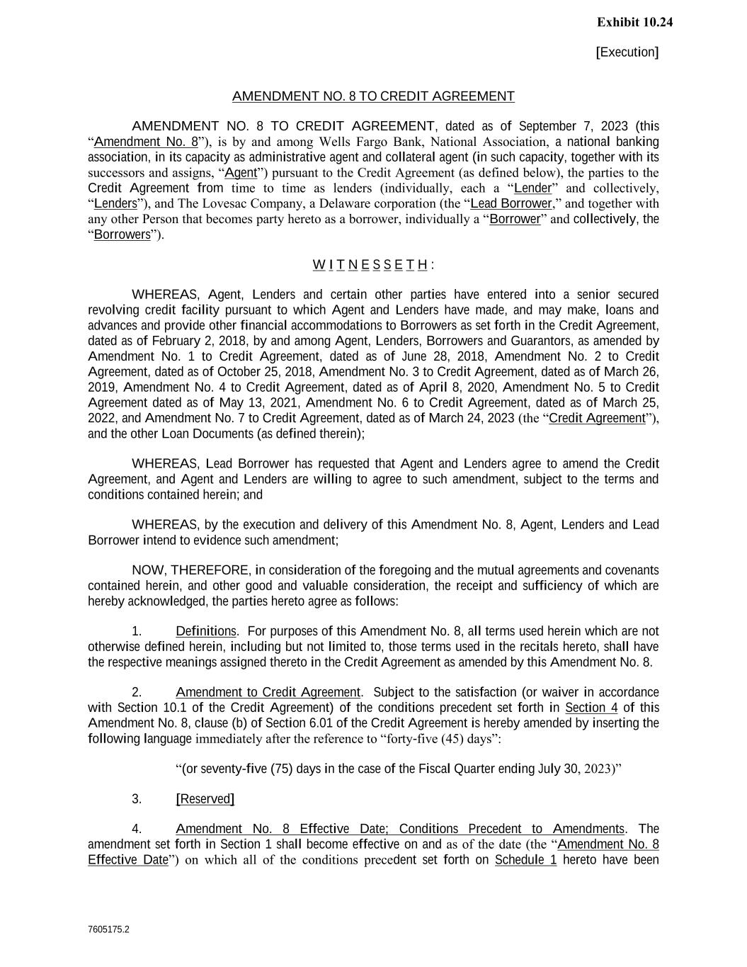 [Execution] 7605175.2 AMENDMENT NO. 8 TO CREDIT AGREEMENT AMENDMENT NO. 8 TO CREDIT AGREEMENT, dated as of September 7, 2023 (this “Amendment No. 8”), is by and among Wells Fargo Bank, National Association, a national banking association, in its capacity as administrative agent and collateral agent (in such capacity, together with its successors and assigns, “Agent”) pursuant to the Credit Agreement (as defined below), the parties to the Credit Agreement from time to time as lenders (individually, each a “Lender” and collectively, “Lenders”), and The Lovesac Company, a Delaware corporation (the “Lead Borrower,” and together with any other Person that becomes party hereto as a borrower, individually a “Borrower” and collectively, the “Borrowers”). W I T N E S S E T H : WHEREAS, Agent, Lenders and certain other parties have entered into a senior secured revolving credit facility pursuant to which Agent and Lenders have made, and may make, loans and advances and provide other financial accommodations to Borrowers as set forth in the Credit Agreement, dated as of February 2, 2018, by and among Agent, Lenders, Borrowers and Guarantors, as amended by Amendment No. 1 to Credit Agreement, dated as of June 28, 2018, Amendment No. 2 to Credit Agreement, dated as of October 25, 2018, Amendment No. 3 to Credit Agreement, dated as of March 26, 2019, Amendment No. 4 to Credit Agreement, dated as of April 8, 2020, Amendment No. 5 to Credit Agreement dated as of May 13, 2021, Amendment No. 6 to Credit Agreement, dated as of March 25, 2022, and Amendment No. 7 to Credit Agreement, dated as of March 24, 2023 (the “Credit Agreement”), and the other Loan Documents (as defined therein); WHEREAS, Lead Borrower has requested that Agent and Lenders agree to amend the Credit Agreement, and Agent and Lenders are willing to agree to such amendment, subject to the terms and conditions contained herein; and WHEREAS, by the execution and delivery of this Amendment No. 8, Agent, Lenders and Lead Borrower intend to evidence such amendment; NOW, THEREFORE, in consideration of the foregoing and the mutual agreements and covenants contained herein, and other good and valuable consideration, the receipt and sufficiency of which are hereby acknowledged, the parties hereto agree as follows: 1. Definitions. For purposes of this Amendment No. 8, all terms used herein which are not otherwise defined herein, including but not limited to, those terms used in the recitals hereto, shall have the respective meanings assigned thereto in the Credit Agreement as amended by this Amendment No. 8. 2. Amendment to Credit Agreement. Subject to the satisfaction (or waiver in accordance with Section 10.1 of the Credit Agreement) of the conditions precedent set forth in Section 4 of this Amendment No. 8, clause (b) of Section 6.01 of the Credit Agreement is hereby amended by inserting the following language immediately after the reference to “forty-five (45) days”: “(or seventy-five (75) days in the case of the Fiscal Quarter ending July 30, 2023)” 3. [Reserved] 4. Amendment No. 8 Effective Date; Conditions Precedent to Amendments. The amendment set forth in Section 1 shall become effective on and as of the date (the “Amendment No. 8 Effective Date”) on which all of the conditions precedent set forth on Schedule 1 hereto have been Exhibit 10.24