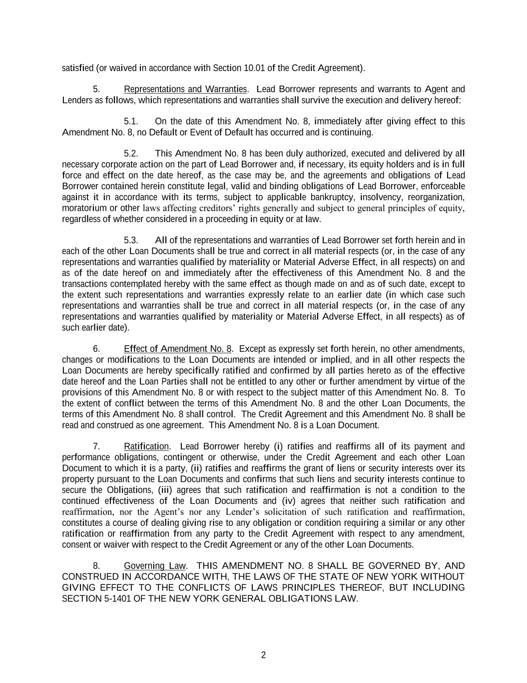 2 satisfied (or waived in accordance with Section 10.01 of the Credit Agreement). 5. Representations and Warranties. Lead Borrower represents and warrants to Agent and Lenders as follows, which representations and warranties shall survive the execution and delivery hereof: 5.1. On the date of this Amendment No. 8, immediately after giving effect to this Amendment No. 8, no Default or Event of Default has occurred and is continuing. 5.2. This Amendment No. 8 has been duly authorized, executed and delivered by all necessary corporate action on the part of Lead Borrower and, if necessary, its equity holders and is in full force and effect on the date hereof, as the case may be, and the agreements and obligations of Lead Borrower contained herein constitute legal, valid and binding obligations of Lead Borrower, enforceable against it in accordance with its terms, subject to applicable bankruptcy, insolvency, reorganization, moratorium or other laws affecting creditors’ rights generally and subject to general principles of equity, regardless of whether considered in a proceeding in equity or at law. 5.3. All of the representations and warranties of Lead Borrower set forth herein and in each of the other Loan Documents shall be true and correct in all material respects (or, in the case of any representations and warranties qualified by materiality or Material Adverse Effect, in all respects) on and as of the date hereof on and immediately after the effectiveness of this Amendment No. 8 and the transactions contemplated hereby with the same effect as though made on and as of such date, except to the extent such representations and warranties expressly relate to an earlier date (in which case such representations and warranties shall be true and correct in all material respects (or, in the case of any representations and warranties qualified by materiality or Material Adverse Effect, in all respects) as of such earlier date). 6. Effect of Amendment No. 8. Except as expressly set forth herein, no other amendments, changes or modifications to the Loan Documents are intended or implied, and in all other respects the Loan Documents are hereby specifically ratified and confirmed by all parties hereto as of the effective date hereof and the Loan Parties shall not be entitled to any other or further amendment by virtue of the provisions of this Amendment No. 8 or with respect to the subject matter of this Amendment No. 8. To the extent of conflict between the terms of this Amendment No. 8 and the other Loan Documents, the terms of this Amendment No. 8 shall control. The Credit Agreement and this Amendment No. 8 shall be read and construed as one agreement. This Amendment No. 8 is a Loan Document. 7. Ratification. Lead Borrower hereby (i) ratifies and reaffirms all of its payment and performance obligations, contingent or otherwise, under the Credit Agreement and each other Loan Document to which it is a party, (ii) ratifies and reaffirms the grant of liens or security interests over its property pursuant to the Loan Documents and confirms that such liens and security interests continue to secure the Obligations, (iii) agrees that such ratification and reaffirmation is not a condition to the continued effectiveness of the Loan Documents and (iv) agrees that neither such ratification and reaffirmation, nor the Agent’s nor any Lender’s solicitation of such ratification and reaffirmation, constitutes a course of dealing giving rise to any obligation or condition requiring a similar or any other ratification or reaffirmation from any party to the Credit Agreement with respect to any amendment, consent or waiver with respect to the Credit Agreement or any of the other Loan Documents. 8. Governing Law. THIS AMENDMENT NO. 8 SHALL BE GOVERNED BY, AND CONSTRUED IN ACCORDANCE WITH, THE LAWS OF THE STATE OF NEW YORK WITHOUT GIVING EFFECT TO THE CONFLICTS OF LAWS PRINCIPLES THEREOF, BUT INCLUDING SECTION 5-1401 OF THE NEW YORK GENERAL OBLIGATIONS LAW.