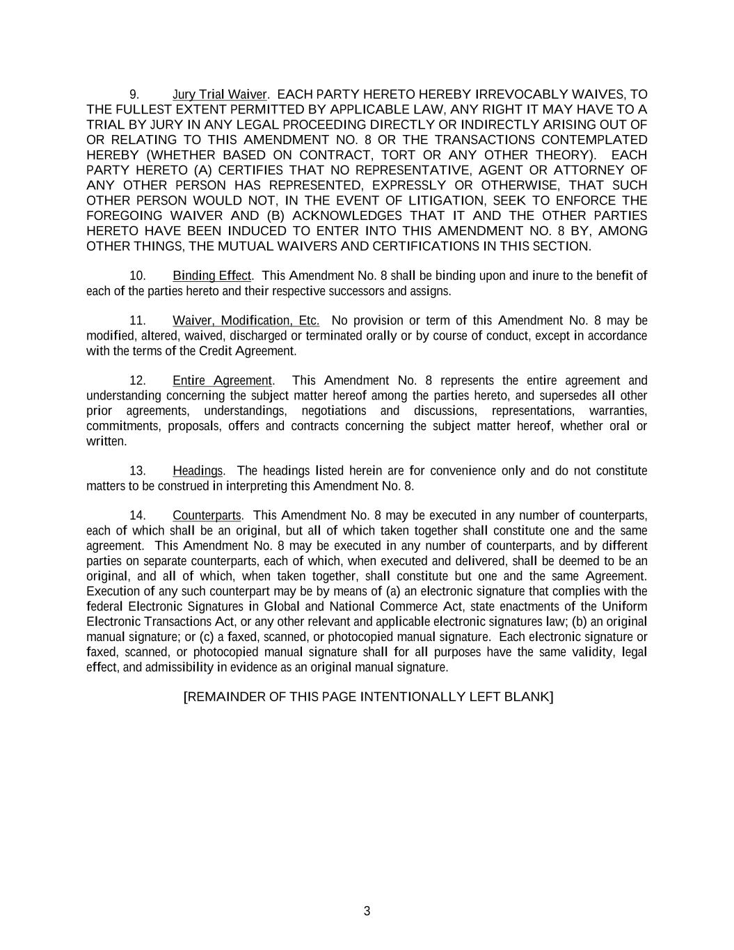 3 9. Jury Trial Waiver. EACH PARTY HERETO HEREBY IRREVOCABLY WAIVES, TO THE FULLEST EXTENT PERMITTED BY APPLICABLE LAW, ANY RIGHT IT MAY HAVE TO A TRIAL BY JURY IN ANY LEGAL PROCEEDING DIRECTLY OR INDIRECTLY ARISING OUT OF OR RELATING TO THIS AMENDMENT NO. 8 OR THE TRANSACTIONS CONTEMPLATED HEREBY (WHETHER BASED ON CONTRACT, TORT OR ANY OTHER THEORY). EACH PARTY HERETO (A) CERTIFIES THAT NO REPRESENTATIVE, AGENT OR ATTORNEY OF ANY OTHER PERSON HAS REPRESENTED, EXPRESSLY OR OTHERWISE, THAT SUCH OTHER PERSON WOULD NOT, IN THE EVENT OF LITIGATION, SEEK TO ENFORCE THE FOREGOING WAIVER AND (B) ACKNOWLEDGES THAT IT AND THE OTHER PARTIES HERETO HAVE BEEN INDUCED TO ENTER INTO THIS AMENDMENT NO. 8 BY, AMONG OTHER THINGS, THE MUTUAL WAIVERS AND CERTIFICATIONS IN THIS SECTION. 10. Binding Effect. This Amendment No. 8 shall be binding upon and inure to the benefit of each of the parties hereto and their respective successors and assigns. 11. Waiver, Modification, Etc. No provision or term of this Amendment No. 8 may be modified, altered, waived, discharged or terminated orally or by course of conduct, except in accordance with the terms of the Credit Agreement. 12. Entire Agreement. This Amendment No. 8 represents the entire agreement and understanding concerning the subject matter hereof among the parties hereto, and supersedes all other prior agreements, understandings, negotiations and discussions, representations, warranties, commitments, proposals, offers and contracts concerning the subject matter hereof, whether oral or written. 13. Headings. The headings listed herein are for convenience only and do not constitute matters to be construed in interpreting this Amendment No. 8. 14. Counterparts. This Amendment No. 8 may be executed in any number of counterparts, each of which shall be an original, but all of which taken together shall constitute one and the same agreement. This Amendment No. 8 may be executed in any number of counterparts, and by different parties on separate counterparts, each of which, when executed and delivered, shall be deemed to be an original, and all of which, when taken together, shall constitute but one and the same Agreement. Execution of any such counterpart may be by means of (a) an electronic signature that complies with the federal Electronic Signatures in Global and National Commerce Act, state enactments of the Uniform Electronic Transactions Act, or any other relevant and applicable electronic signatures law; (b) an original manual signature; or (c) a faxed, scanned, or photocopied manual signature. Each electronic signature or faxed, scanned, or photocopied manual signature shall for all purposes have the same validity, legal effect, and admissibility in evidence as an original manual signature. [REMAINDER OF THIS PAGE INTENTIONALLY LEFT BLANK]