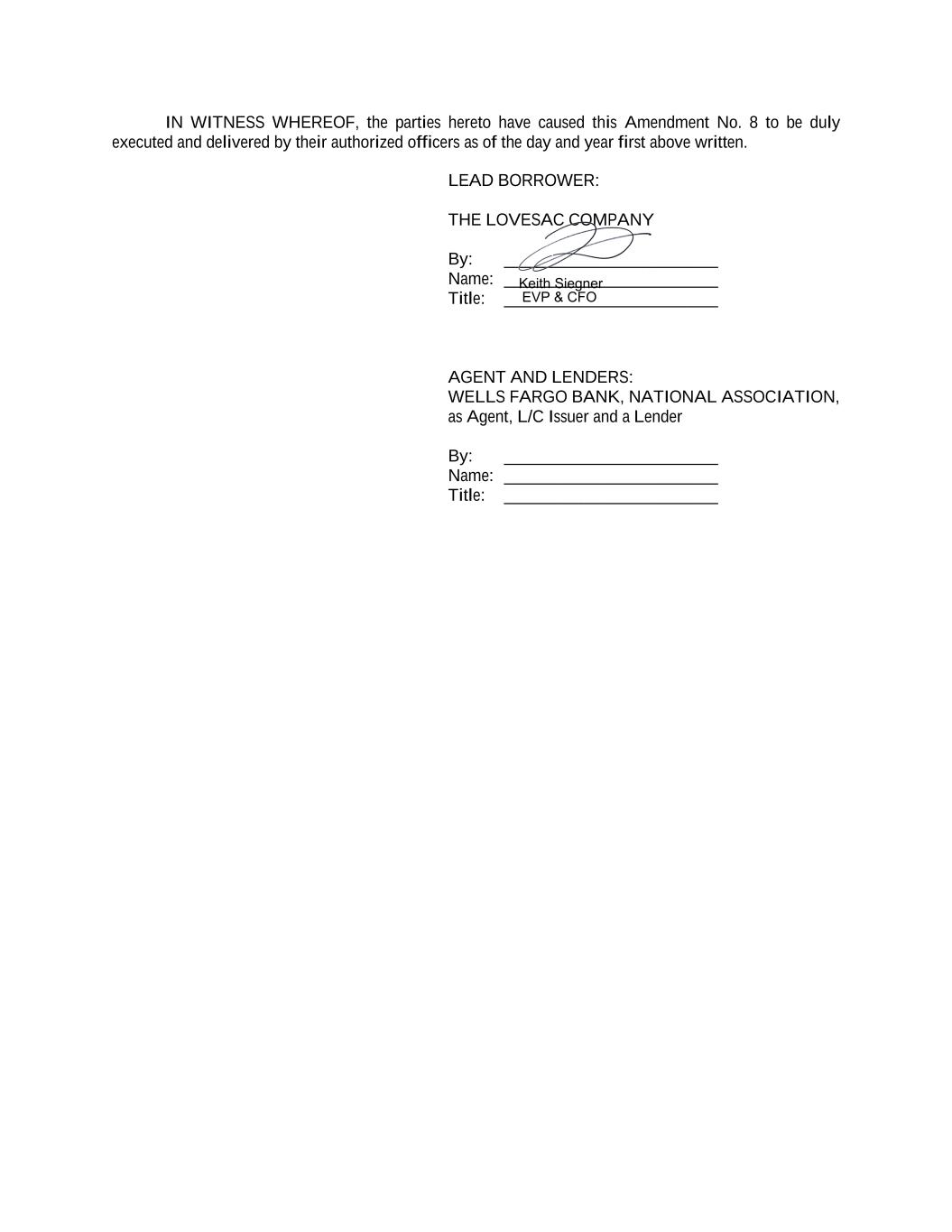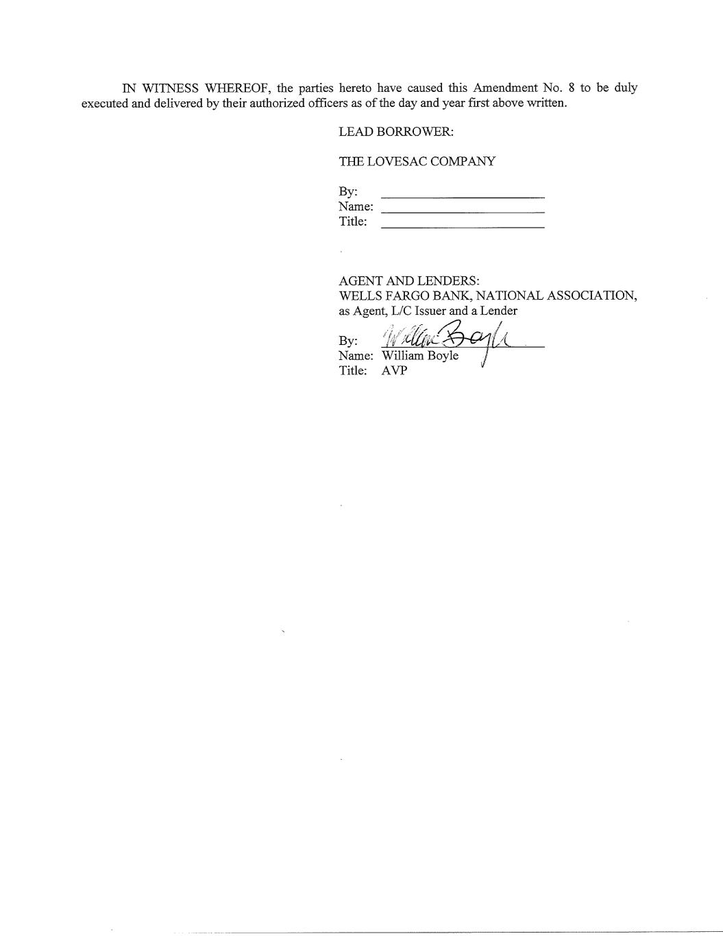 IN WITNESS WHEREOF, the parties hereto have caused this Amendment No. 8 to be duly executed and delivered by their authorized officers as of the day and year first above written. LEAD BORROWER: THE LOVESAC COMPANY By: _________________________ Name: _________________________ Title: _________________________ AGENT AND LENDERS: WELLS FARGO BANK, NATIONAL ASSOCIATION, as Agent, L/C Issuer and a Lender By: _________________________ Name: _________________________ Title: _________________________ EVP & CFO Keith Siegner